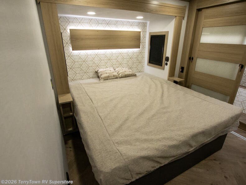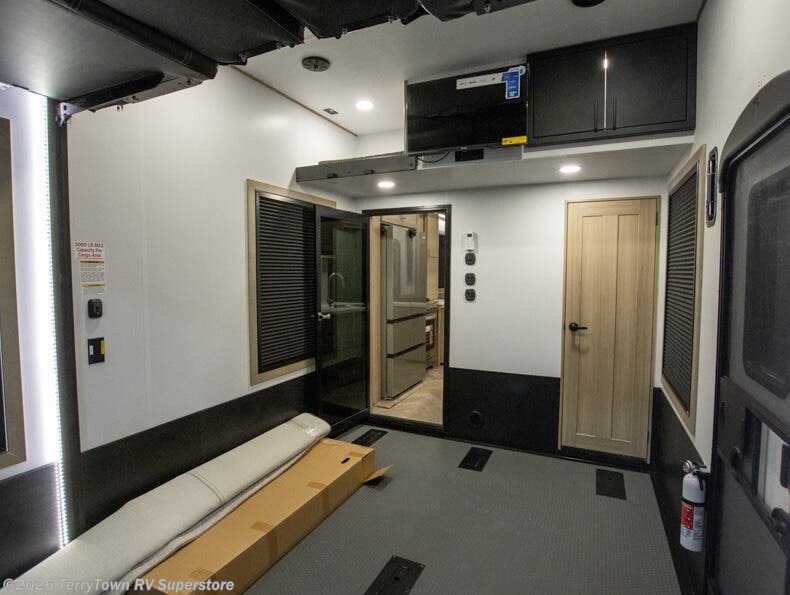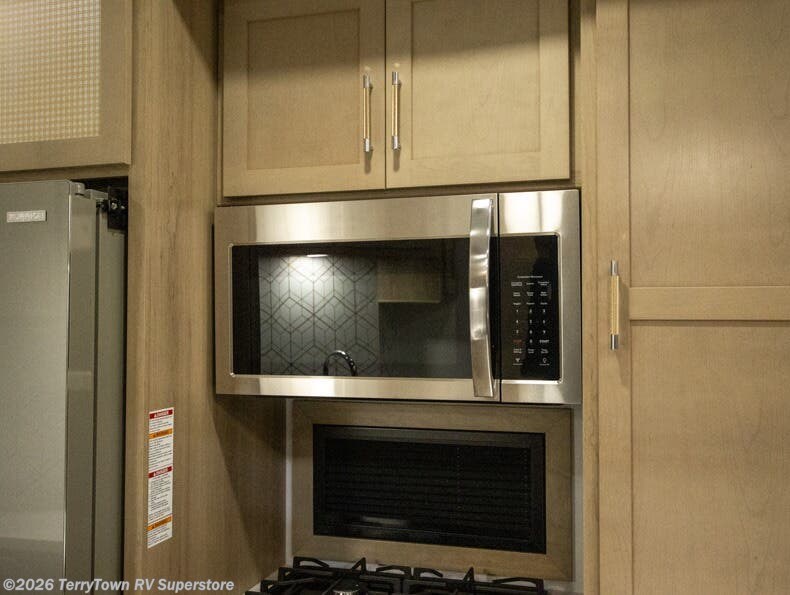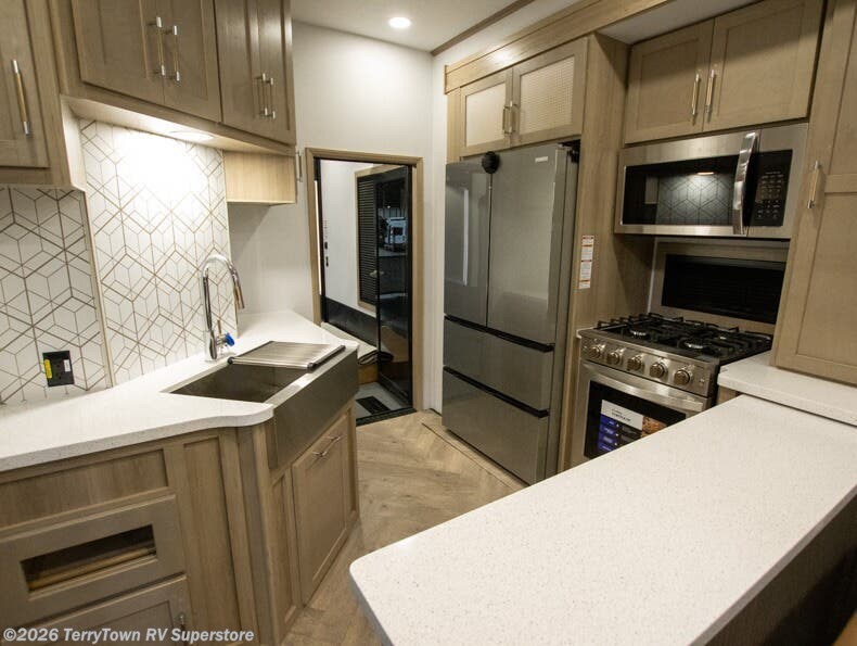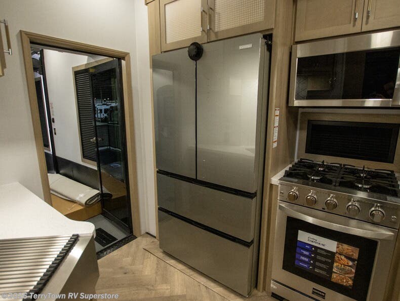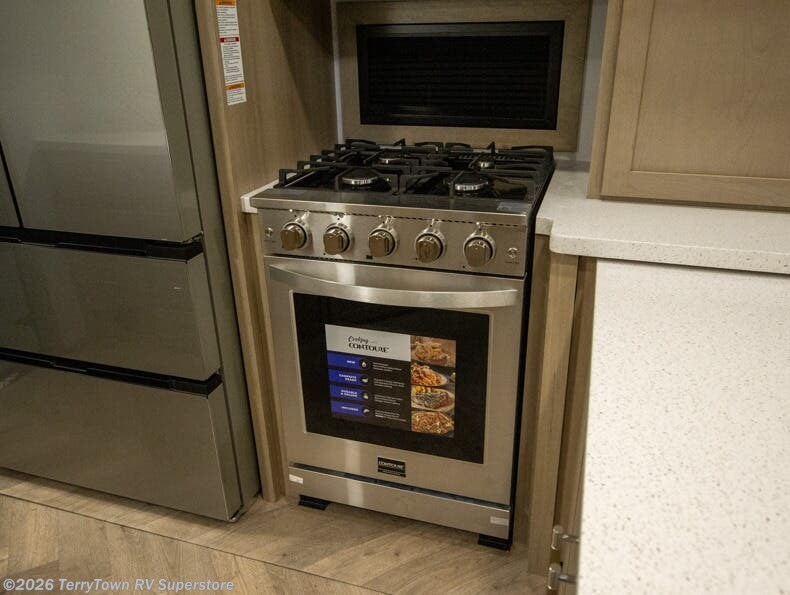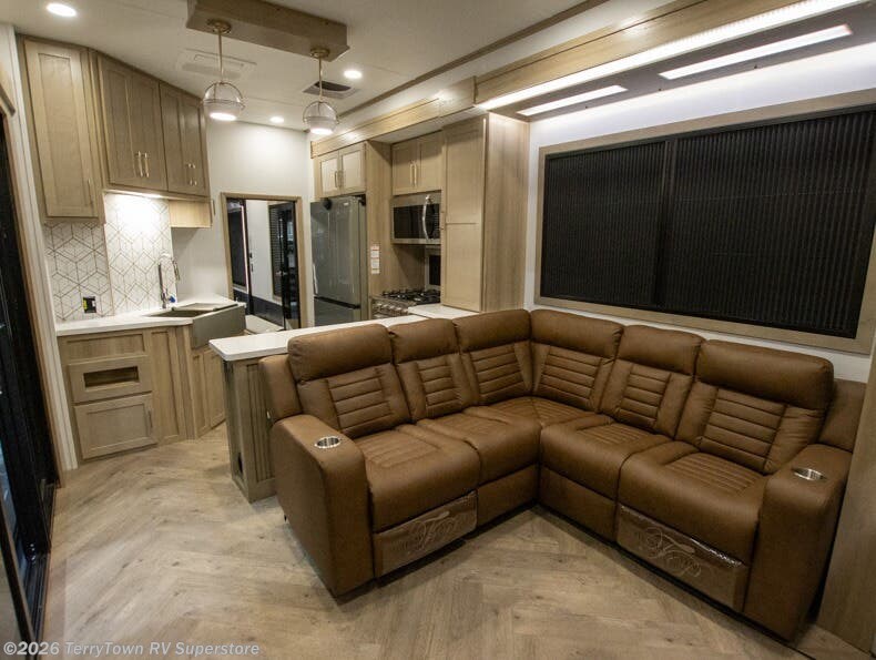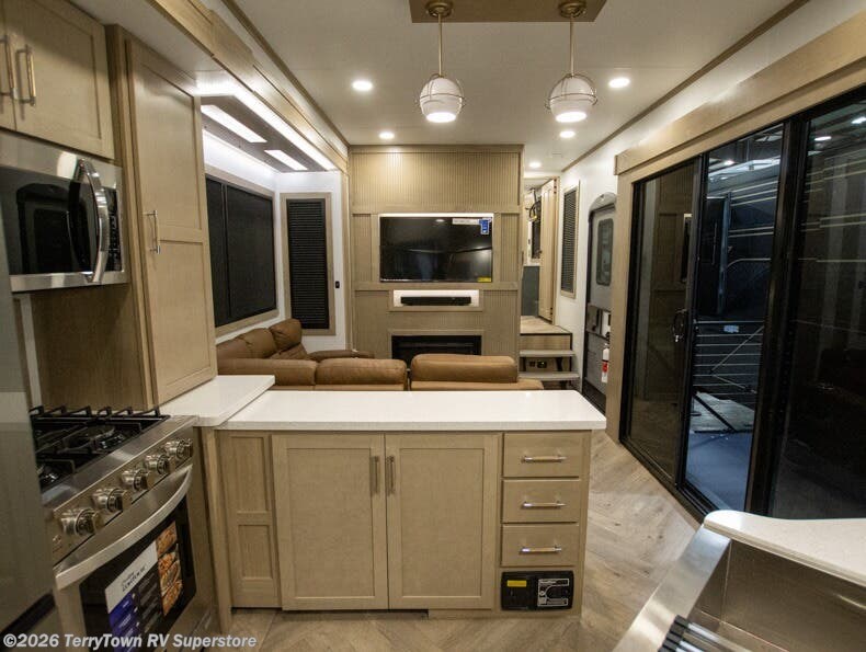 Everyone will love camping in this fifth wheel toy hauler! The front private bedroom has a king bed slide for more interior space, a Smart LED TV, a front large master closet, plus washer and dryer prep. Freshen up each morning in the full bathroom with the fiberglass one-piece shower then head to the kitchen to fry up some eggs on the four-burner range and bake a tasty treat in the 24" stainless steel oven. Grab a cold one from the 20-cu. ft.12-volt refrigerator and even enjoy it outdoors thanks to the three awnings. The L-shaped sofa is conveniently across from the entertainment center with a 50" Smart LED TV and fireplace. As you head into the garage area, you will notice a loft with a twin bed, a queen bed above the opposing sofas, and one of the dual entry doors to the unit!