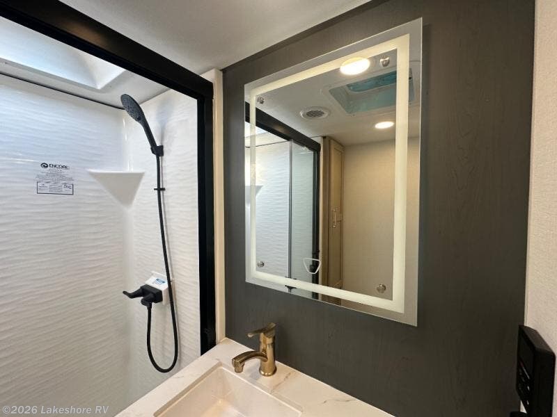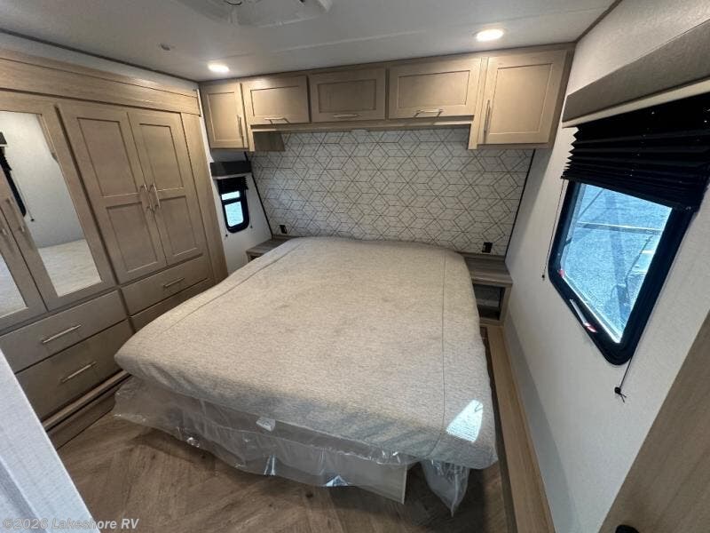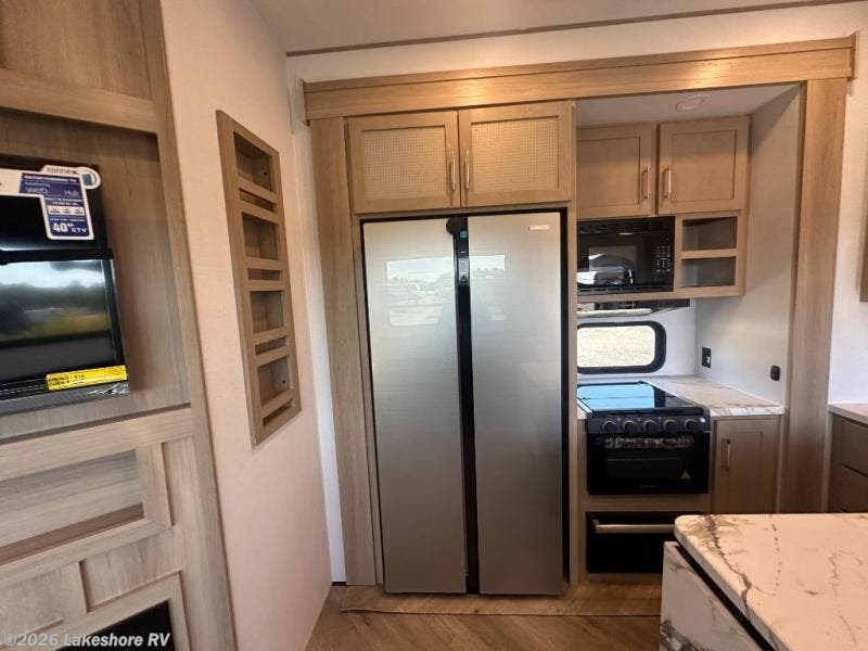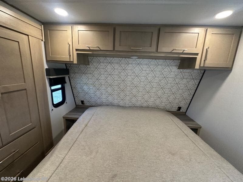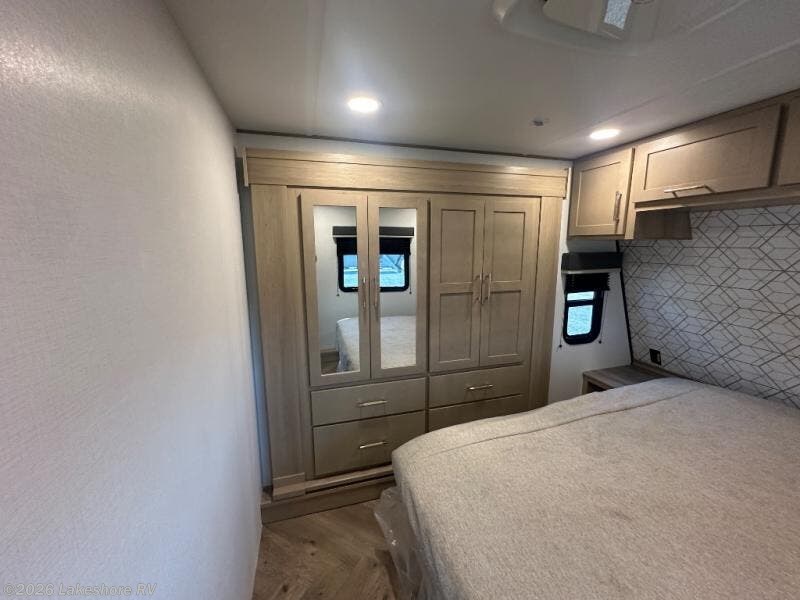 Featuring a spacious king bed with nightstands on each side, this front private bedroom will be your favorite spot to rest! The wardrobe with drawers provides ample storage for your clothes and personal items, helping you stay organized on the road. The bath and a half layout provides convenience and flexibility, ensuring that everyone has their own space to get ready in the morning. The living area is a vibrant hub of entertainment, featuring a reclining sofa with lumbar support and a tilting headrest. The state-of-the-art entertainment center with smart LED TV provides endless hours of fun, while the microwave and sink make meal prep a snap. Further, the garage is designed for ultimate adventure, with ample space for your favorite toys and an electric bed with dual opposing sofas that convert into a comfortable sleeping area.