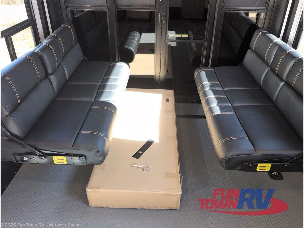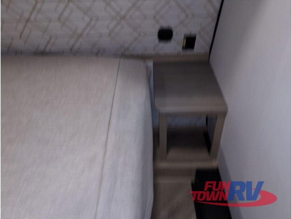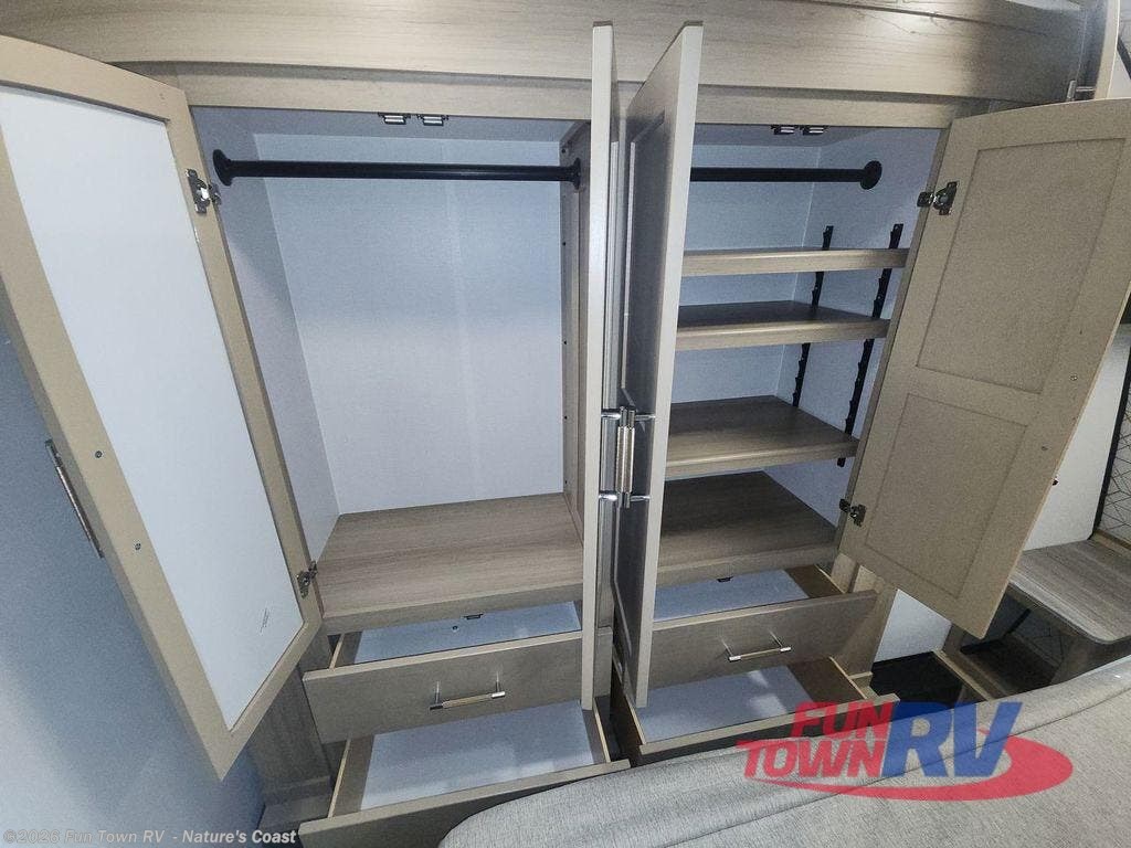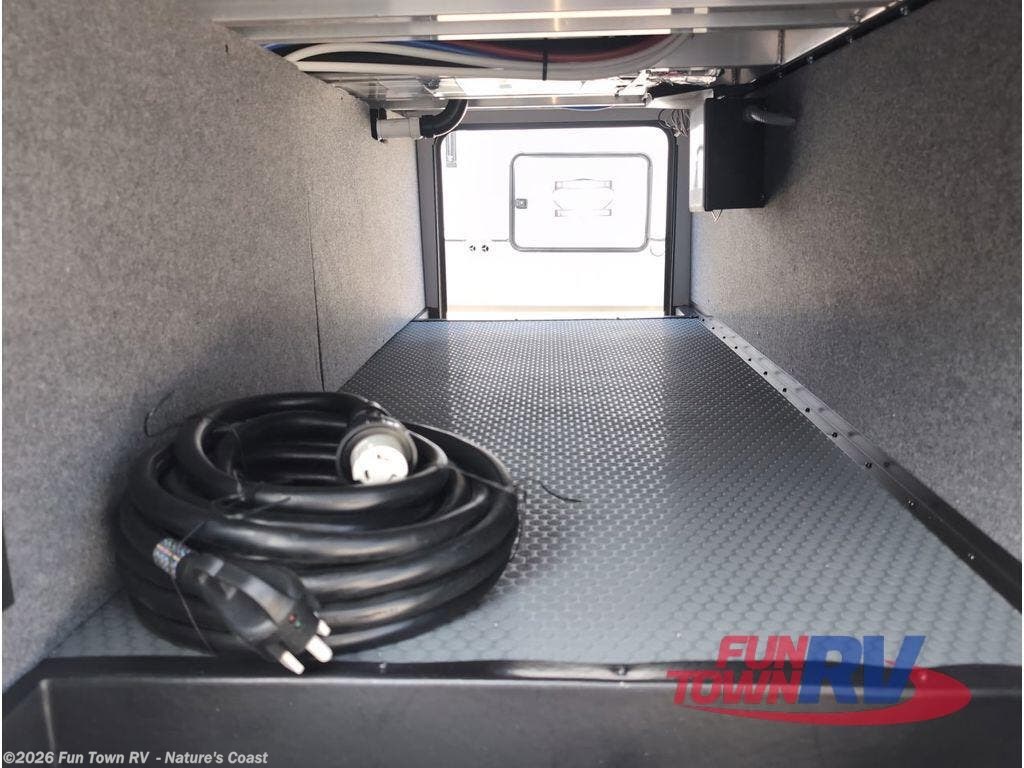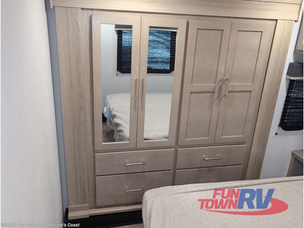 Featuring a spacious king bed with nightstands on each side, this front private bedroom will be your favorite spot to rest! The wardrobe with drawers provides ample storage for your clothes and personal items, helping you stay organized on the road. The bath and a half layout provides convenience and flexibility, ensuring that everyone has their own space to get ready in the morning. The living area is a vibrant hub of entertainment, featuring a reclining sofa with lumbar support and a tilting headrest. The state-of-the-art entertainment center with smart LED TV provides endless hours of fun, while the microwave and sink make meal prep a snap. Further, the garage is designed for ultimate adventure, with ample space for your favorite toys and an electric bed with dual opposing sofas that convert into a comfortable sleeping area.