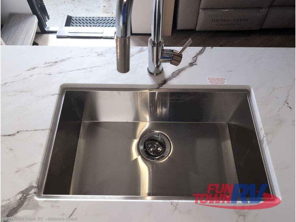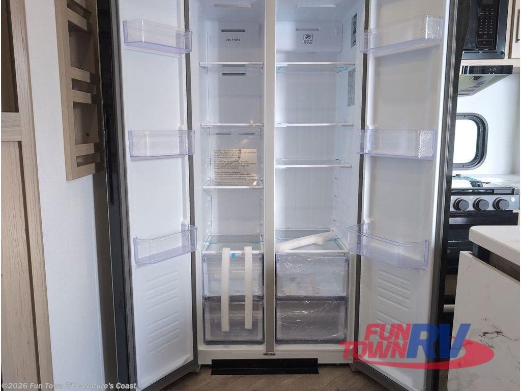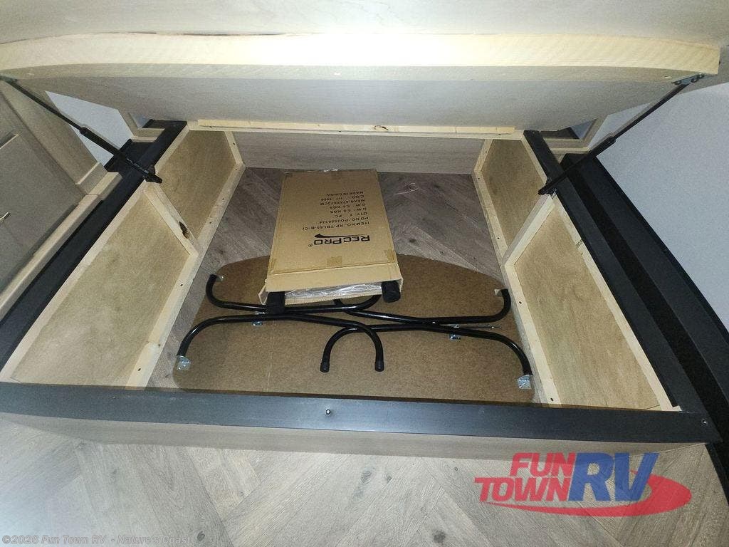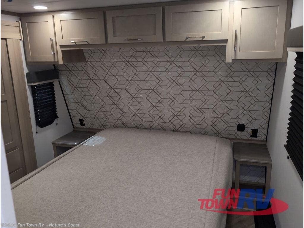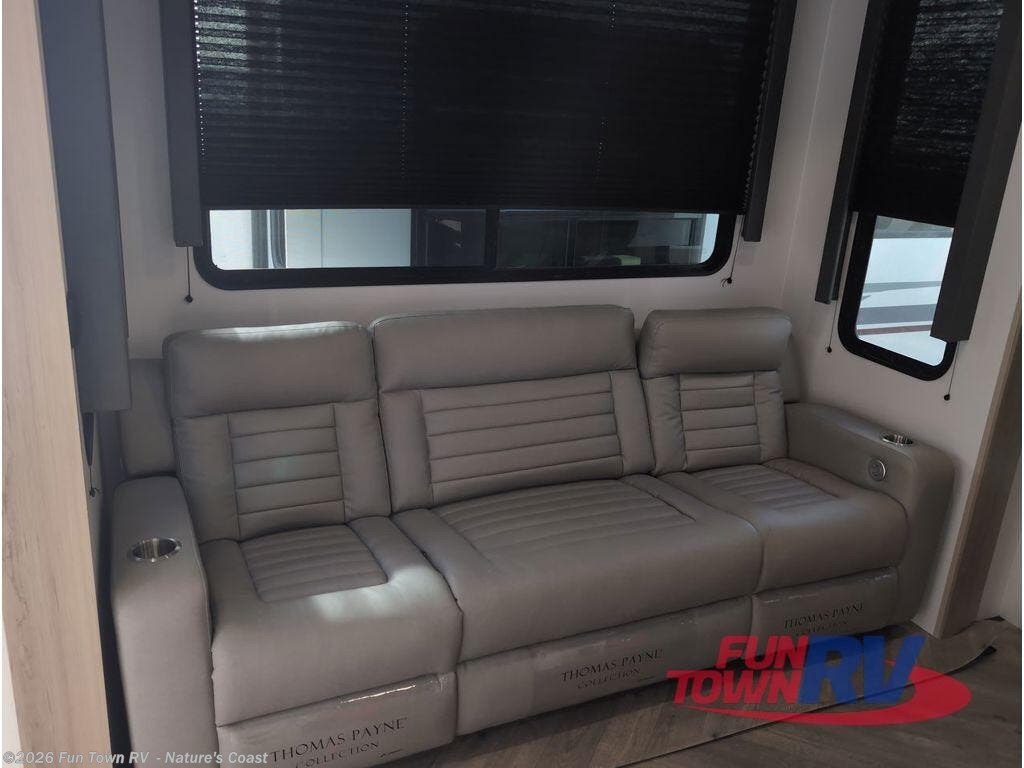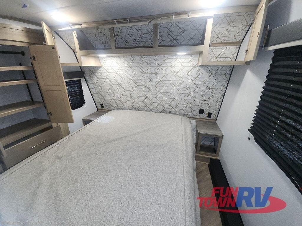 Featuring a spacious king bed with nightstands on each side, this front private bedroom will be your favorite spot to rest! The wardrobe with drawers provides ample storage for your clothes and personal items, helping you stay organized on the road. The bath and a half layout provides convenience and flexibility, ensuring that everyone has their own space to get ready in the morning. The living area is a vibrant hub of entertainment, featuring a reclining sofa with lumbar support and a tilting headrest. The state-of-the-art entertainment center with smart LED TV provides endless hours of fun, while the microwave and sink make meal prep a snap. Further, the garage is designed for ultimate adventure, with ample space for your favorite toys and an electric bed with dual opposing sofas that convert into a comfortable sleeping area.