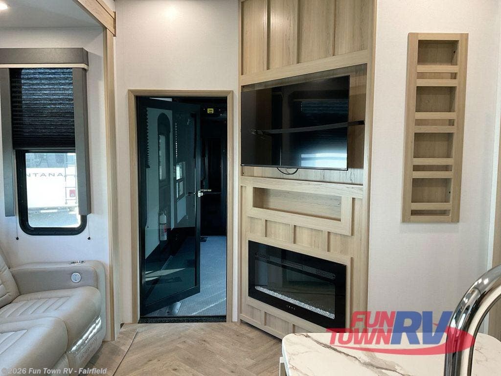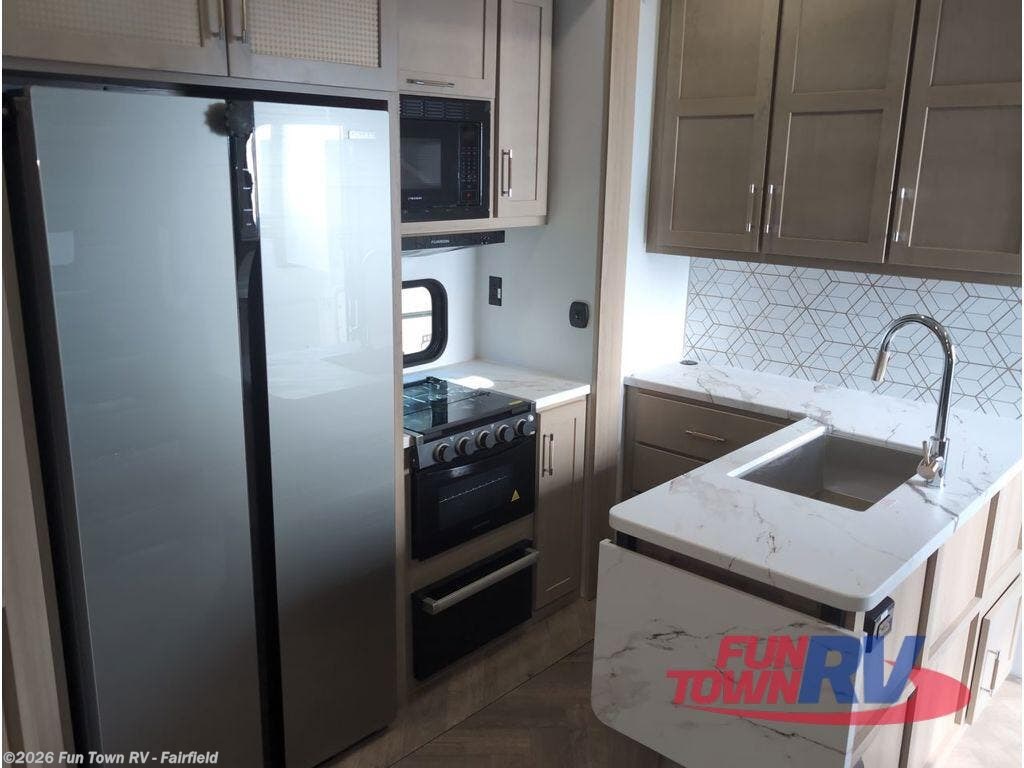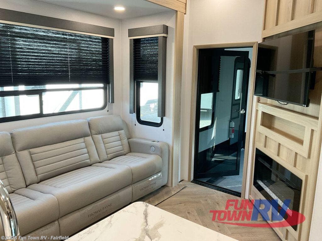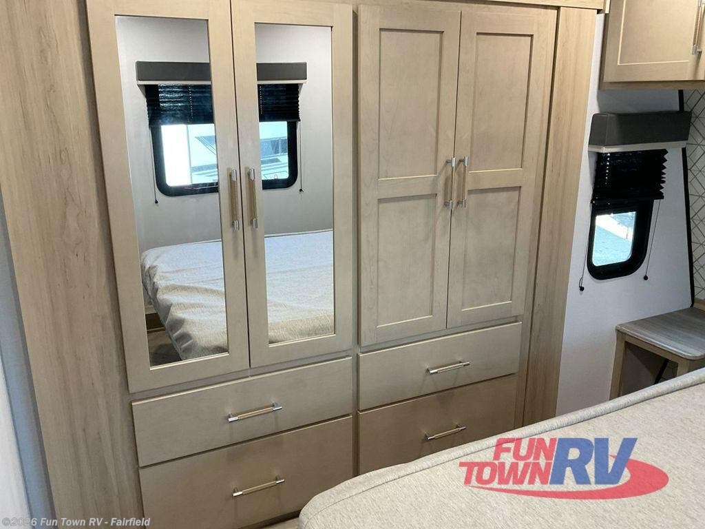 Featuring a spacious king bed with nightstands on each side, this front private bedroom will be your favorite spot to rest! The wardrobe with drawers provides ample storage for your clothes and personal items, helping you stay organized on the road. The bath and a half layout provides convenience and flexibility, ensuring that everyone has their own space to get ready in the morning. The living area is a vibrant hub of entertainment, featuring a reclining sofa with lumbar support and a tilting headrest. The state-of-the-art entertainment center with smart LED TV provides endless hours of fun, while the microwave and sink make meal prep a snap. Further, the garage is designed for ultimate adventure, with ample space for your favorite toys and an electric bed with dual opposing sofas that convert into a comfortable sleeping area.