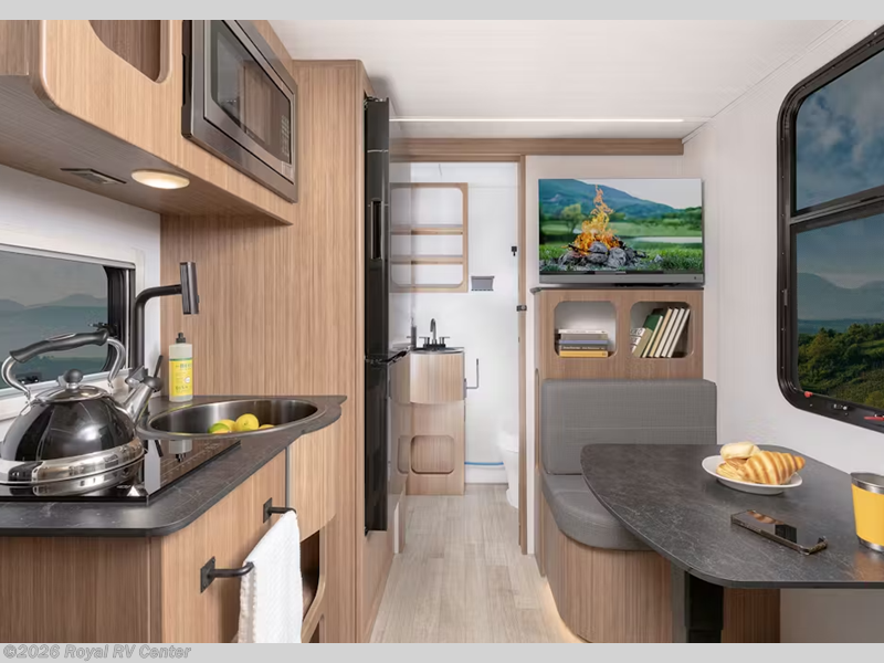 This single axle trailer is both cozy and versatile since there is a fold down sofa/Murphy bed up front! Now you can easily convert seating space into sleeping space, plus there are dual bedside closets to keep your things tidy. A two burner cooktop and air fryer/convection microwave will let you cook meals each day, and a booth dinette provides a place to dine together. You can also choose to add the optional flip-up bunk above the dinette if you need more sleeping space. And don't overlook the full rear bath that will allow you to freshen up without having to leave your camper!