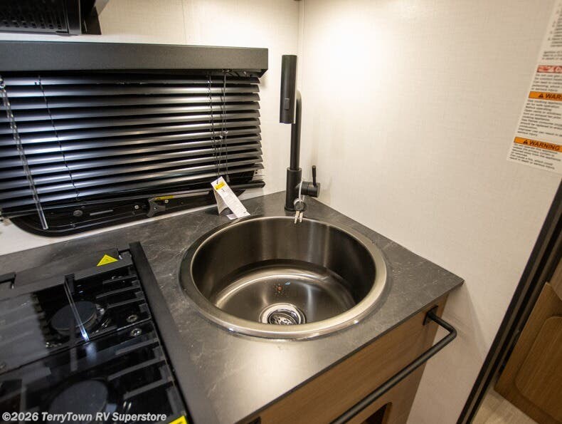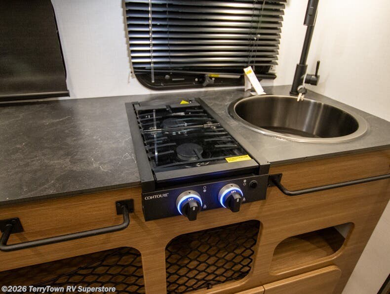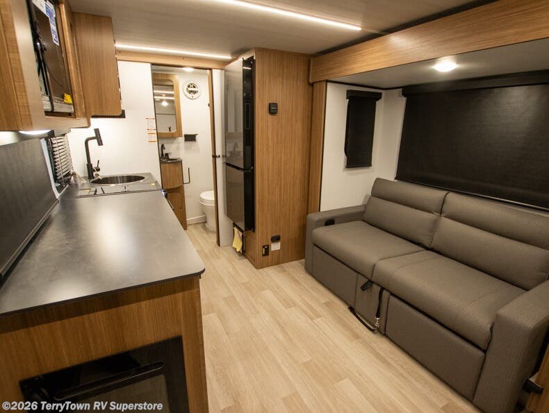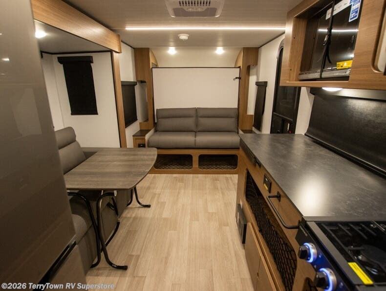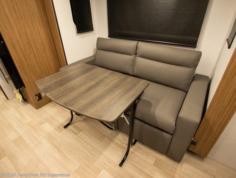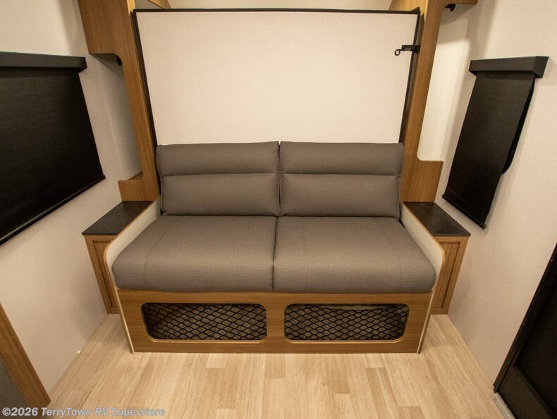 This single axle trailer is both cozy and versatile since there is a fold down sofa/Murphy bed up front! Now you can easily convert seating space into sleeping space, plus there are dual bedside closets to keep your things tidy. A two burner cooktop and air fryer/convection microwave will let you cook meals each day, and there is a huge countertop plus a flip-up extension for even more prep space. This unit also includes a theater dinette where you can relax each day, and the fireplace is sure to make your space feel like home!