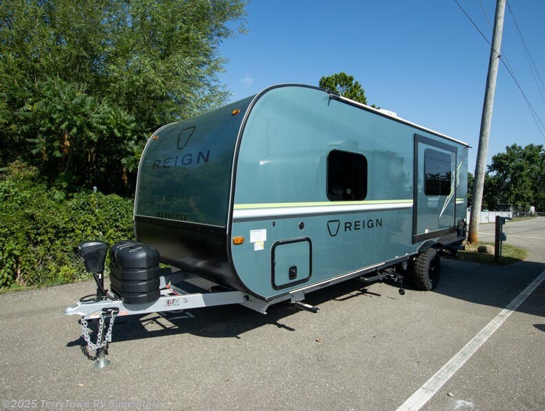 The Reign travel trailers by Keystone are premium single-axle units that are sure to make an impression at the campground. Each one is built with an exclusive automotive-finished aluminum exterior, a walkable roof, and a 100% composite floor for added durability. There are also tinted safety glass windows, quick drop stabilizer jacks, and an exterior shower with hot and cold water. The European inspired interior design is unique and cozy, and the 78" interior height will give you plenty of space to move about. You will also enjoy the ultra bright LED light strip and solid surface countertops in the kitchen, along with blackout night shades, and many more interior comforts.