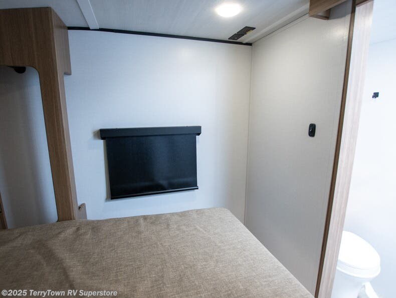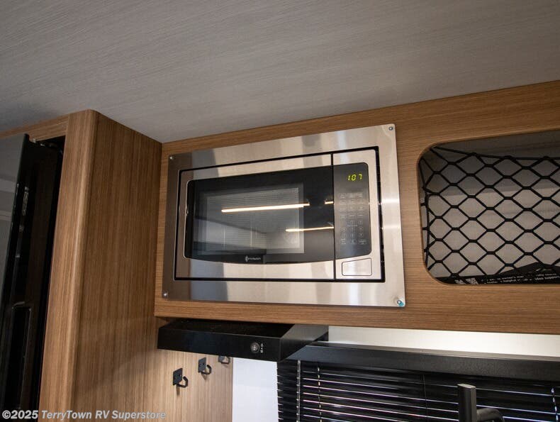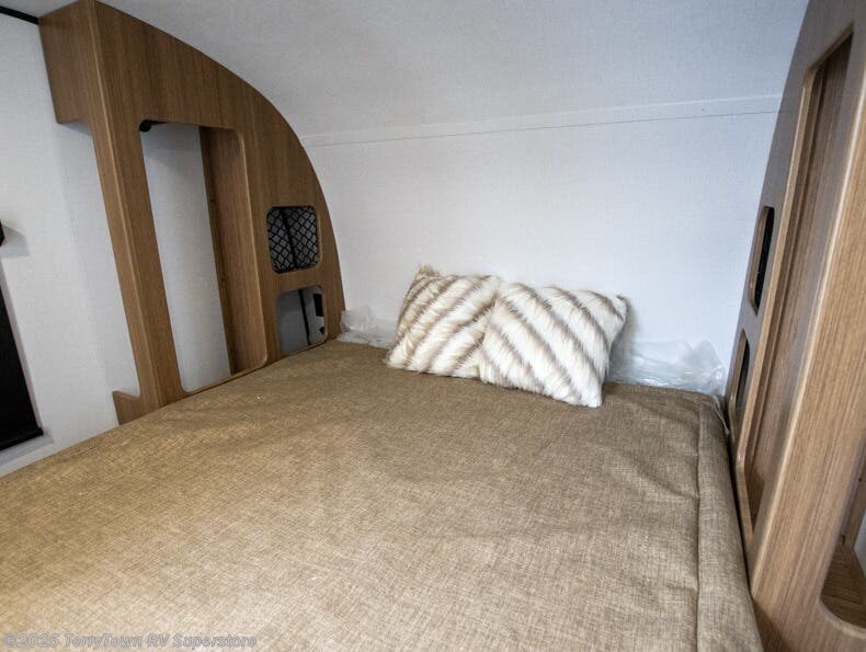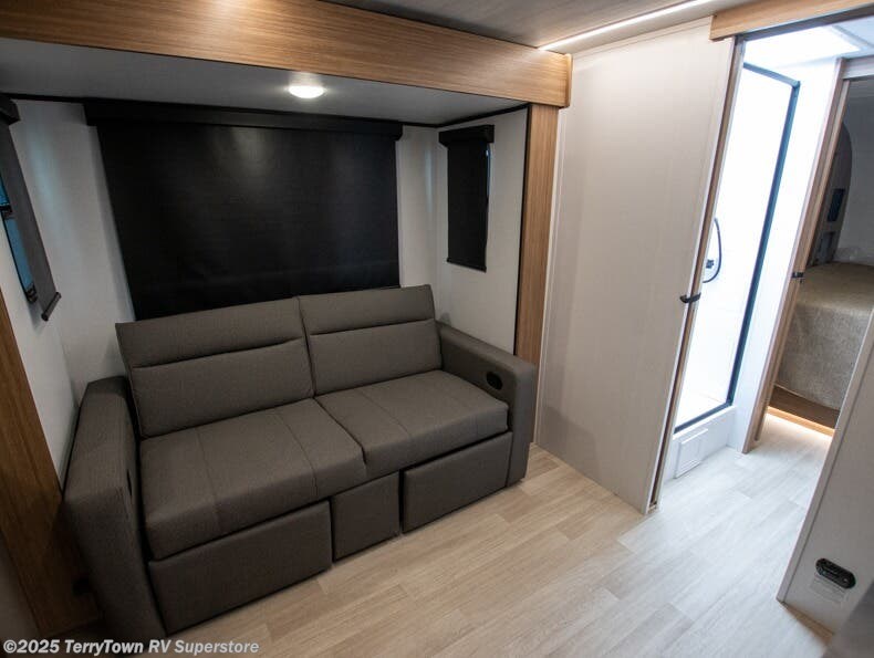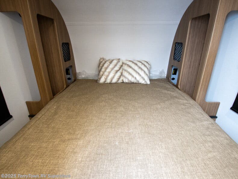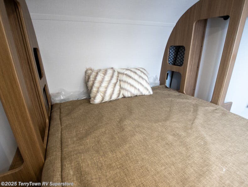 You will love this travel trailer's stunning rear kitchen design! The theater dinette provides a comfortable spot for meals and relaxation, while the bar countertop with stools offers a space for socializing and enjoying drinks. Also, overhead cabinets provide ample storage for your kitchen essentials. In the center of this travel trailer, the walkthrough bathroom features a convenient flip-down sink and linen closet, making it easy to get ready and stay organized. Moreover, the front bedroom is a serene retreat, featuring a spacious 60” x 74” bed with cubbies beside the bed for storing your favorite books, glasses, or other personal items. Plus, a 13' awning provides shade and protection from the elements, creating a comfortable outdoor living space.