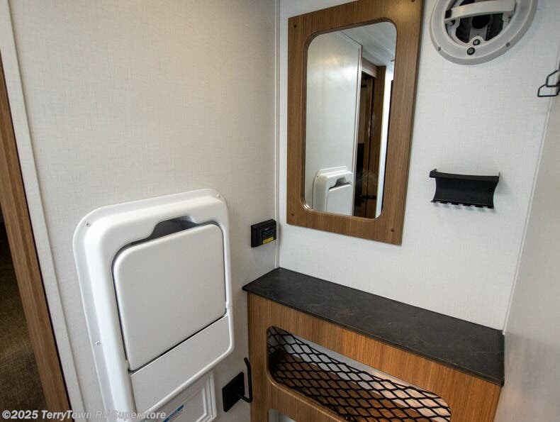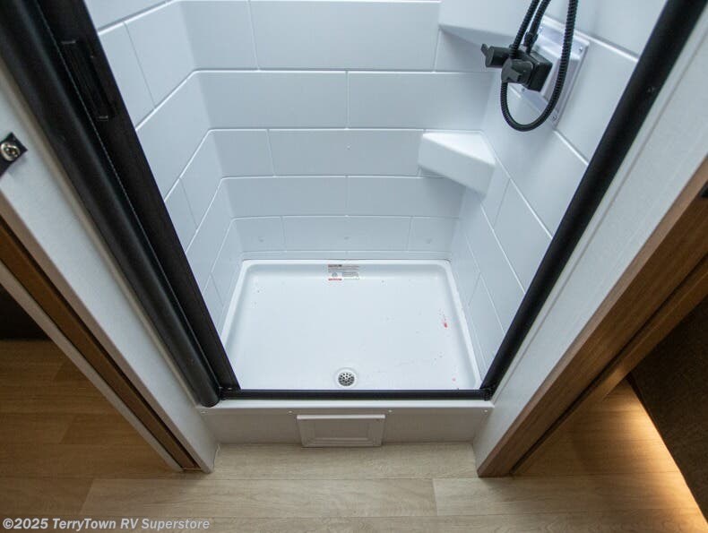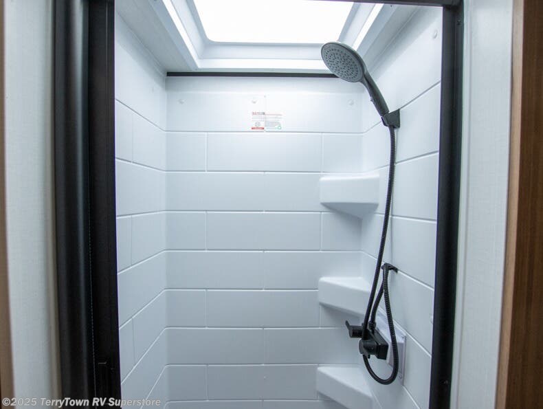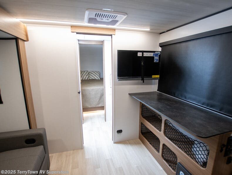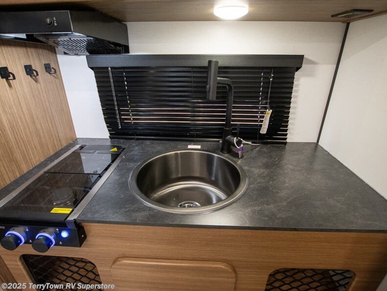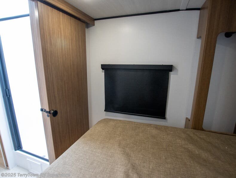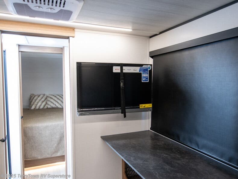 You will love this travel trailer's stunning rear kitchen design! The theater dinette provides a comfortable spot for meals and relaxation, while the bar countertop with stools offers a space for socializing and enjoying drinks. Also, overhead cabinets provide ample storage for your kitchen essentials. In the center of this travel trailer, the walkthrough bathroom features a convenient flip-down sink and linen closet, making it easy to get ready and stay organized. Moreover, the front bedroom is a serene retreat, featuring a spacious 60” x 74” bed with cubbies beside the bed for storing your favorite books, glasses, or other personal items. Plus, a 13' awning provides shade and protection from the elements, creating a comfortable outdoor living space.