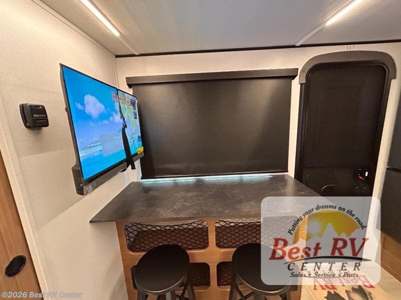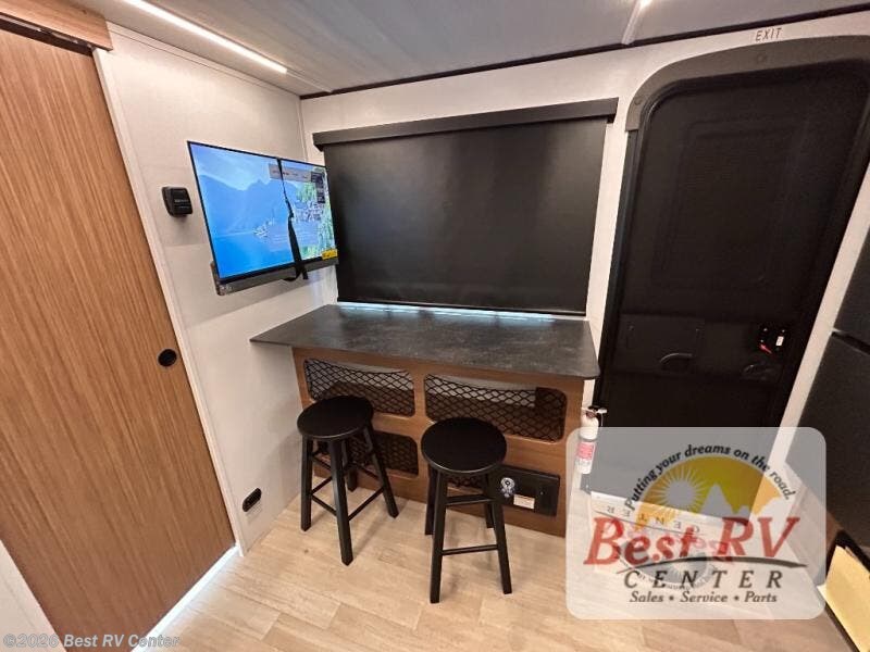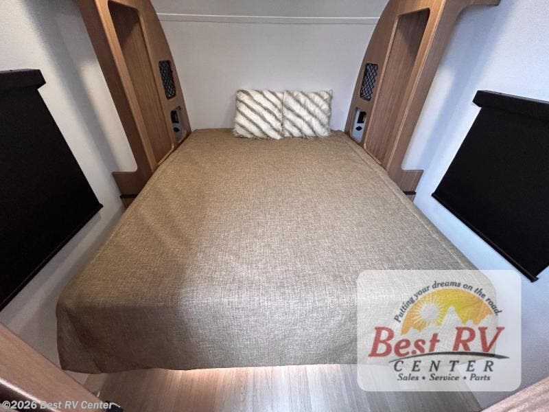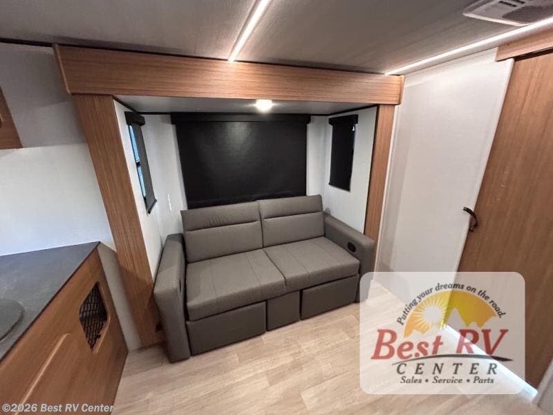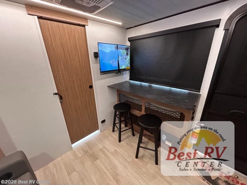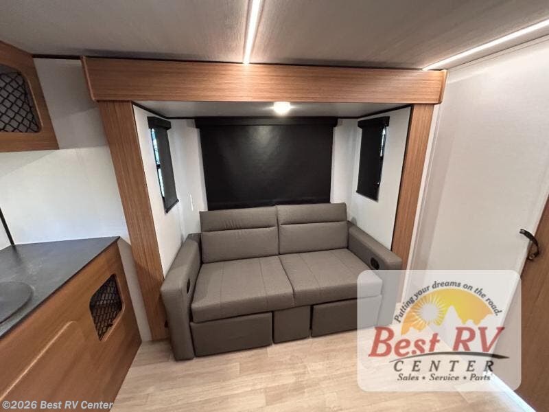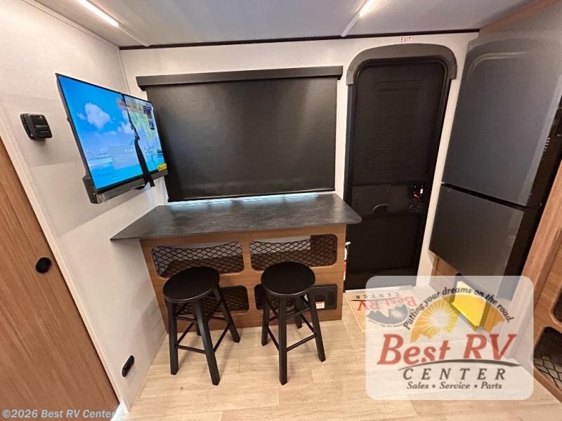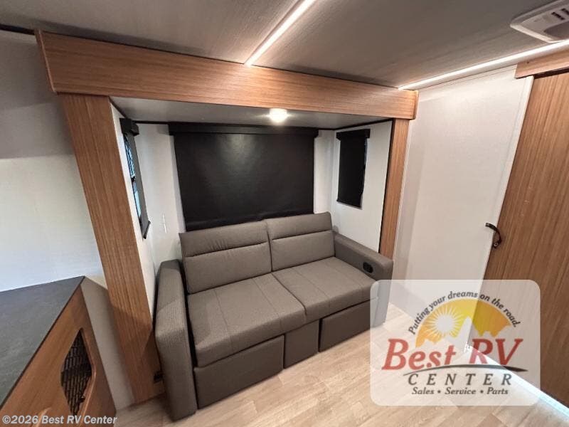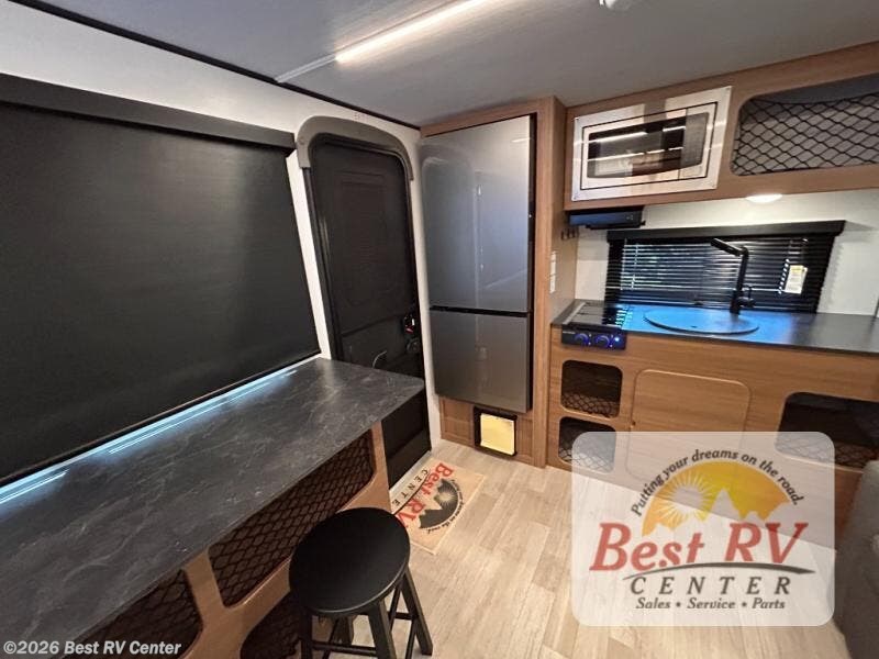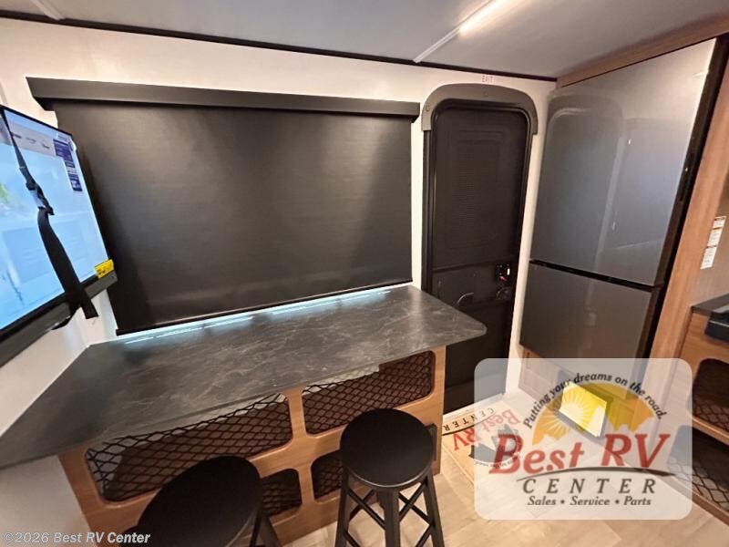 You will love this travel trailer's stunning rear kitchen design! The theater dinette provides a comfortable spot for meals and relaxation, while the bar countertop with stools offers a space for socializing and enjoying drinks. Also, overhead cabinets provide ample storage for your kitchen essentials. In the center of this travel trailer, the walkthrough bathroom features a convenient flip-down sink and linen closet, making it easy to get ready and stay organized. Moreover, the front bedroom is a serene retreat, featuring a spacious 60” x 74” bed with cubbies beside the bed for storing your favorite books, glasses, or other personal items. Plus, a 13' awning provides shade and protection from the elements, creating a comfortable outdoor living space.