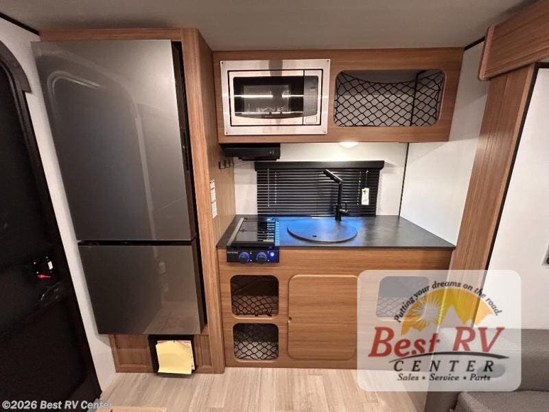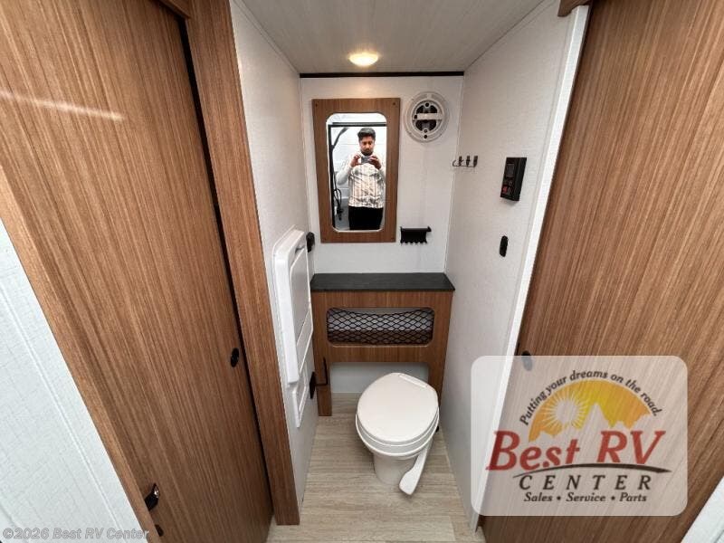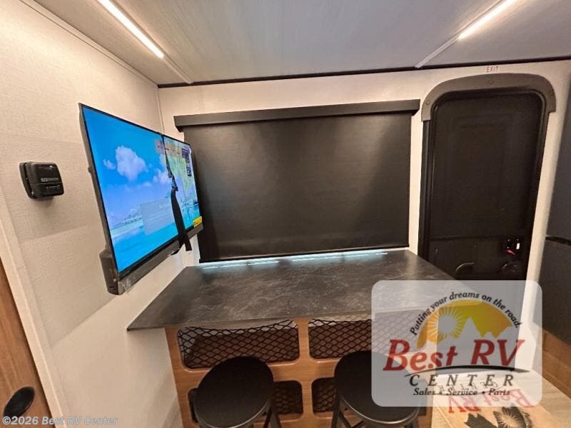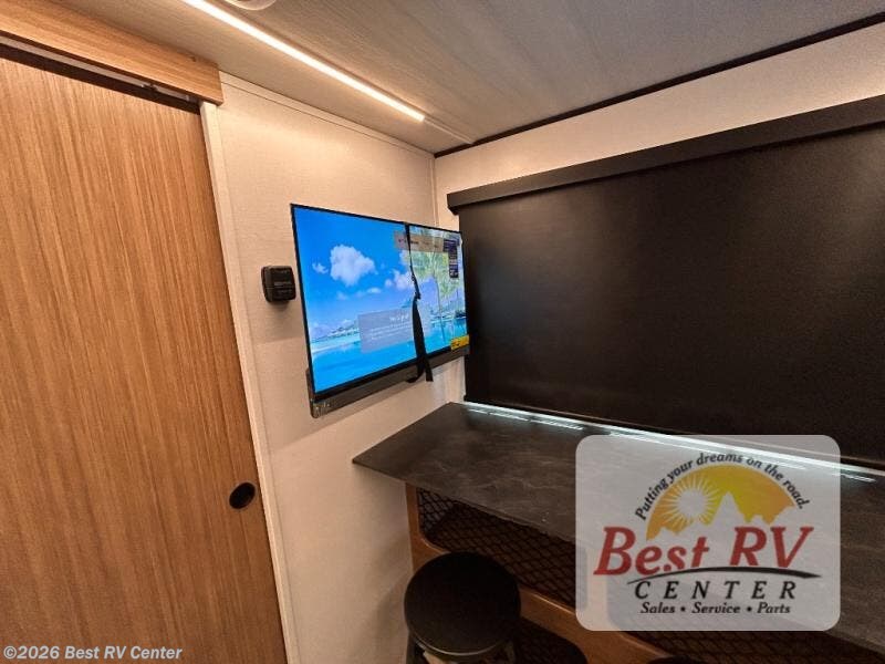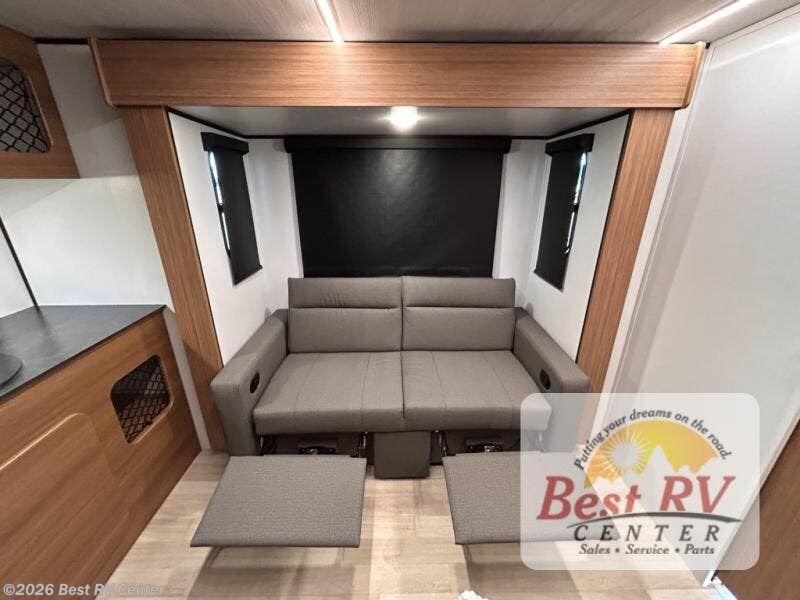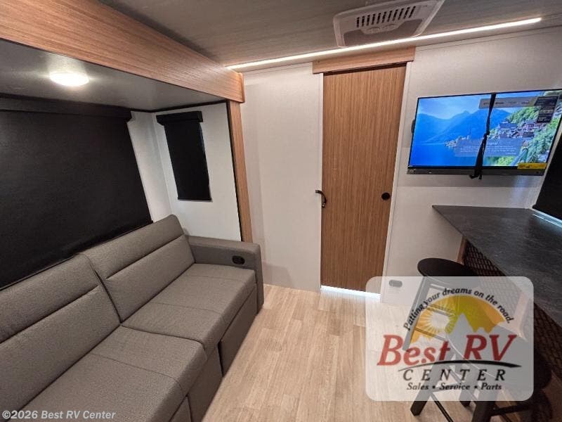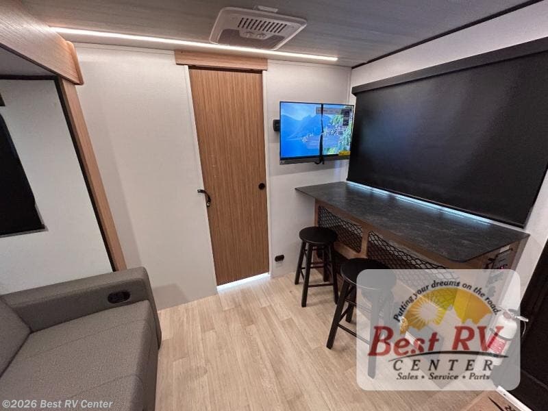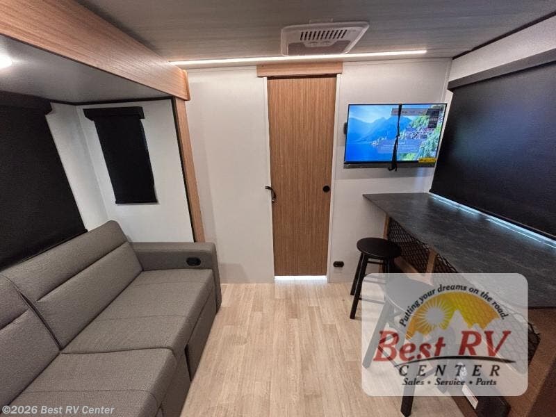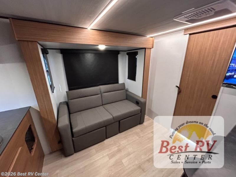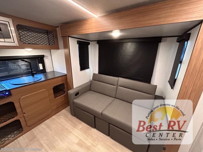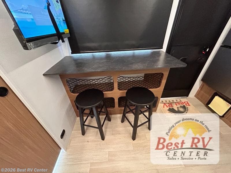 You will love this travel trailer's stunning rear kitchen design! The theater dinette provides a comfortable spot for meals and relaxation, while the bar countertop with stools offers a space for socializing and enjoying drinks. Also, overhead cabinets provide ample storage for your kitchen essentials. In the center of this travel trailer, the walkthrough bathroom features a convenient flip-down sink and linen closet, making it easy to get ready and stay organized. Moreover, the front bedroom is a serene retreat, featuring a spacious 60” x 74” bed with cubbies beside the bed for storing your favorite books, glasses, or other personal items. Plus, a 13' awning provides shade and protection from the elements, creating a comfortable outdoor living space.