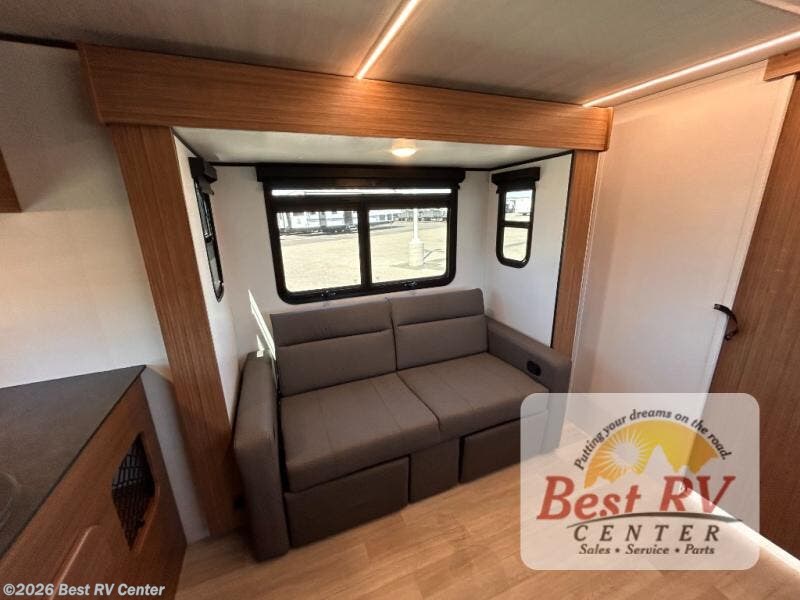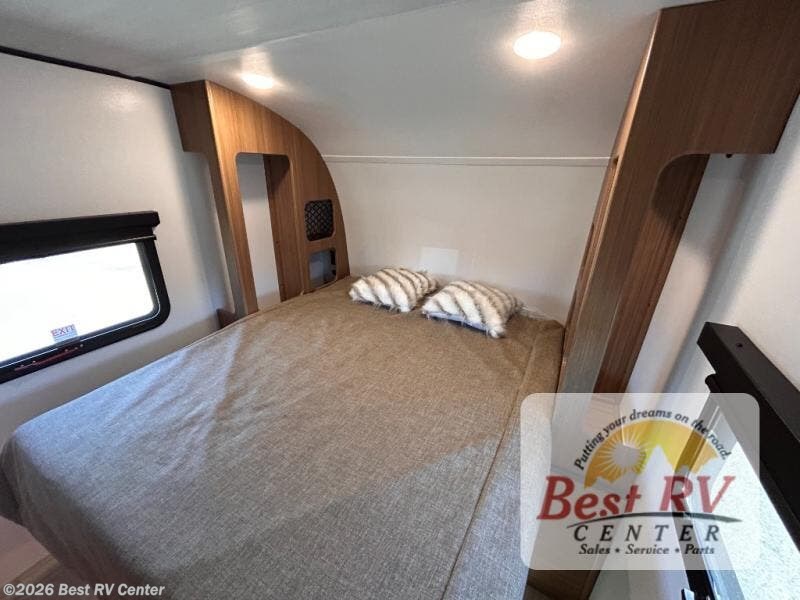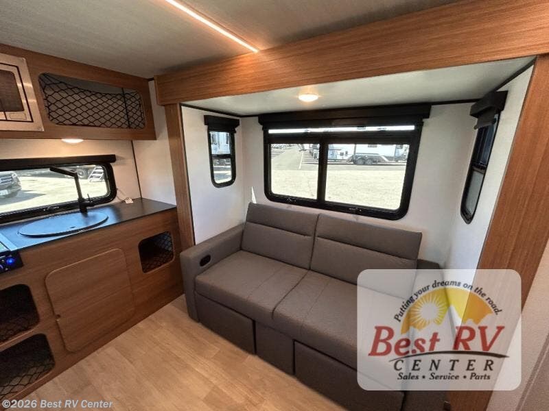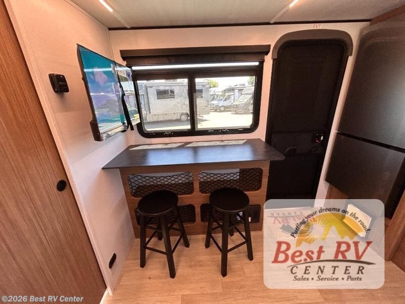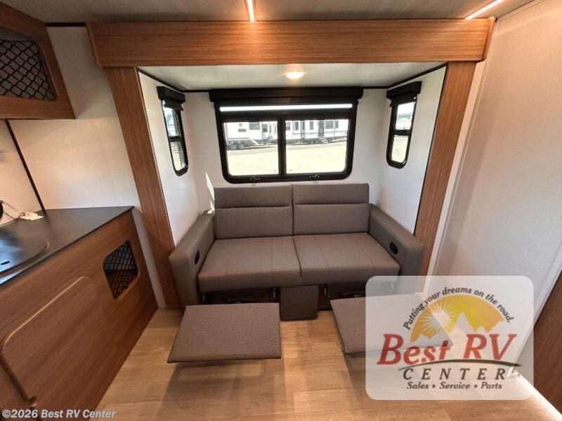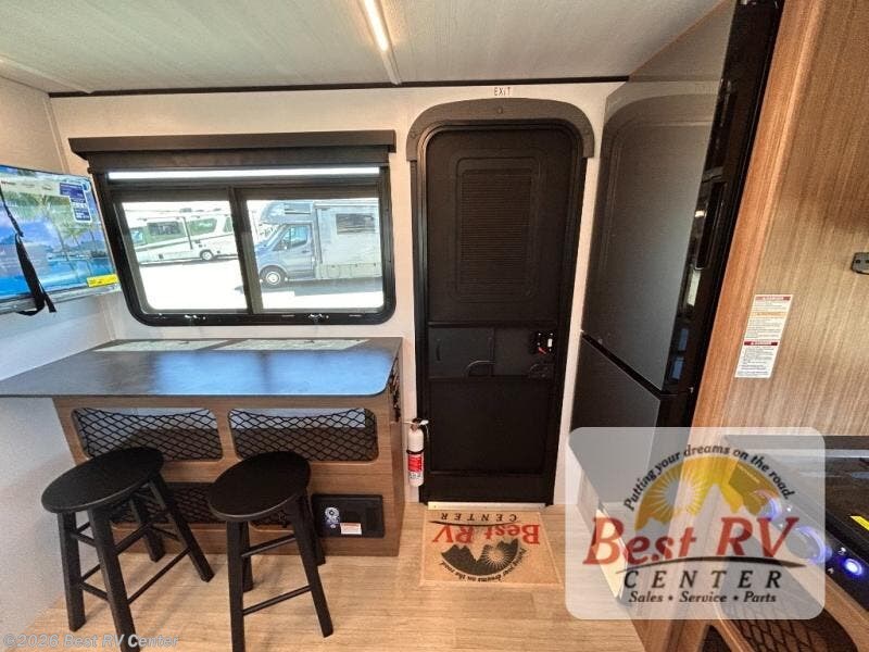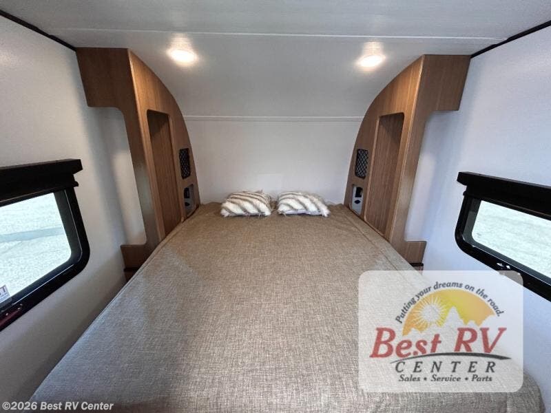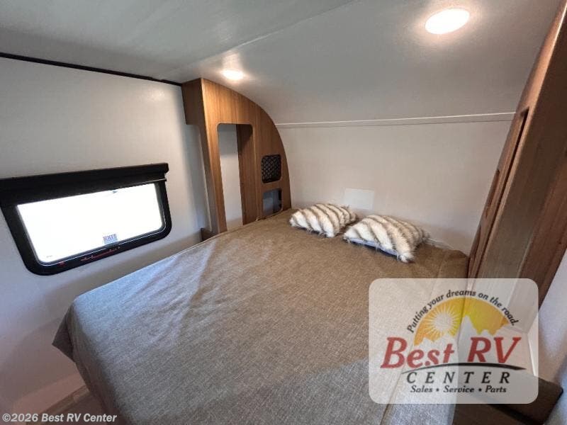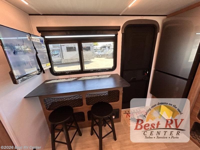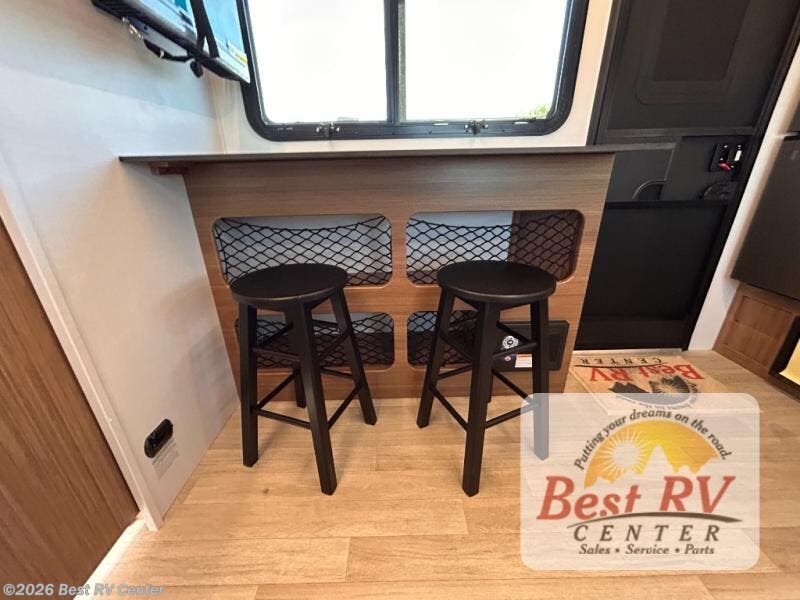 You will love this travel trailer's stunning rear kitchen design! The theater dinette provides a comfortable spot for meals and relaxation, while the bar countertop with stools offers a space for socializing and enjoying drinks. Also, overhead cabinets provide ample storage for your kitchen essentials. In the center of this travel trailer, the walkthrough bathroom features a convenient flip-down sink and linen closet, making it easy to get ready and stay organized. Moreover, the front bedroom is a serene retreat, featuring a spacious 60” x 74” bed with cubbies beside the bed for storing your favorite books, glasses, or other personal items. Plus, a 13' awning provides shade and protection from the elements, creating a comfortable outdoor living space.