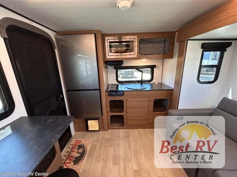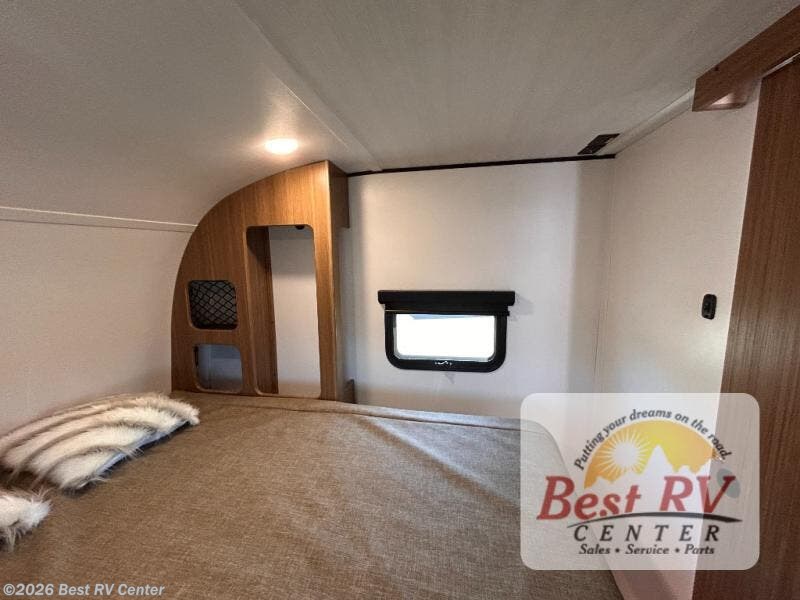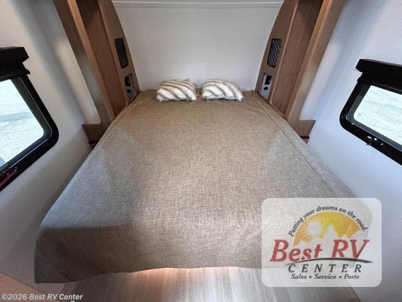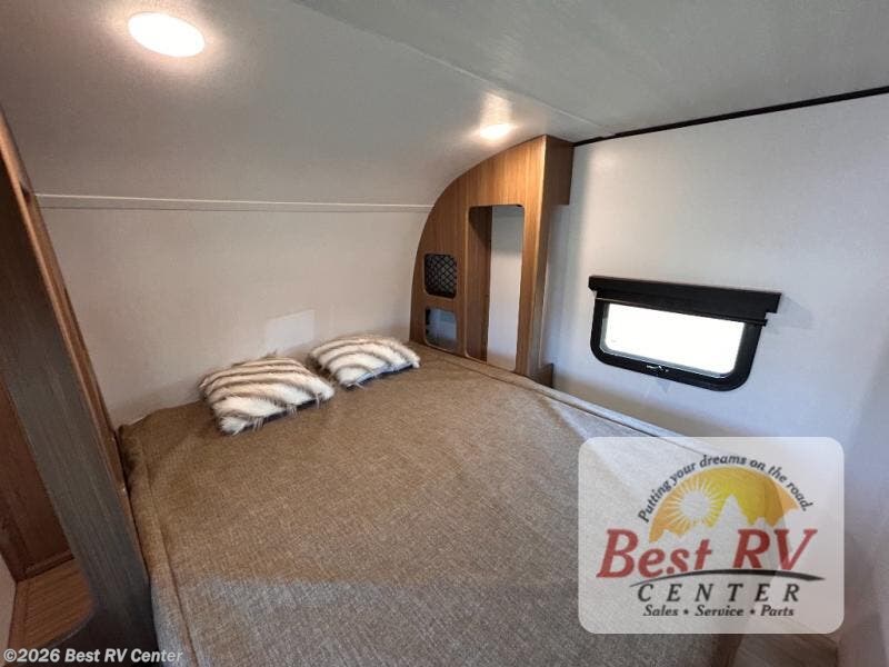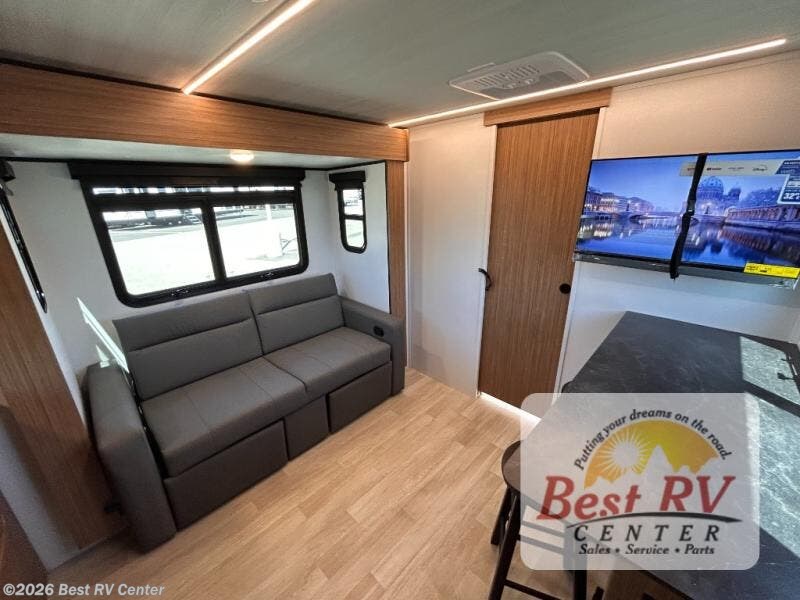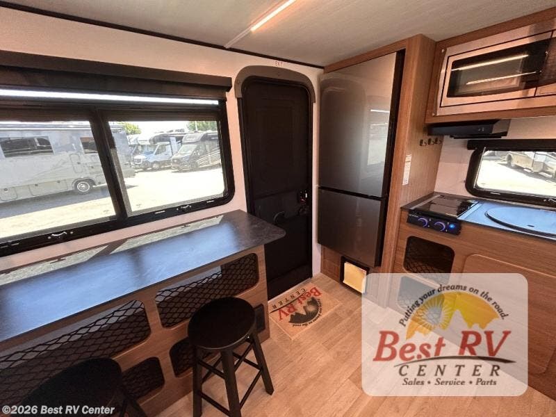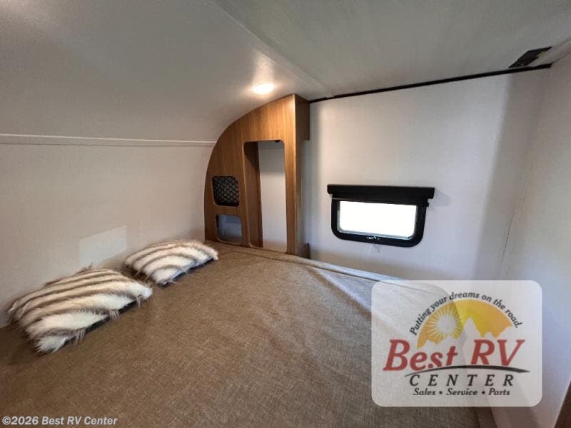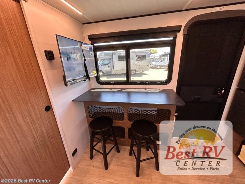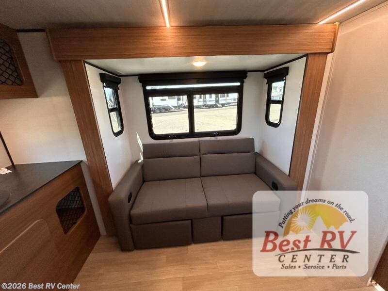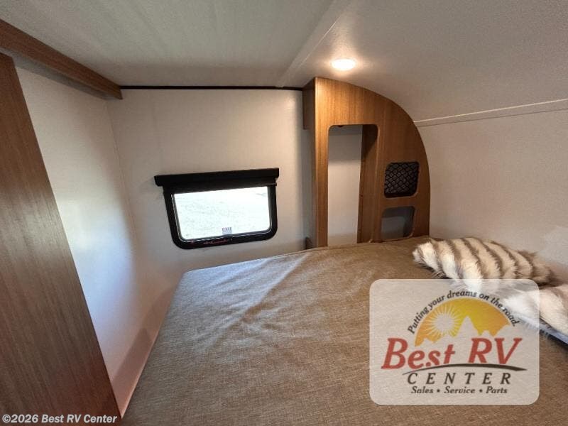 You will love this travel trailer's stunning rear kitchen design! The theater dinette provides a comfortable spot for meals and relaxation, while the bar countertop with stools offers a space for socializing and enjoying drinks. Also, overhead cabinets provide ample storage for your kitchen essentials. In the center of this travel trailer, the walkthrough bathroom features a convenient flip-down sink and linen closet, making it easy to get ready and stay organized. Moreover, the front bedroom is a serene retreat, featuring a spacious 60” x 74” bed with cubbies beside the bed for storing your favorite books, glasses, or other personal items. Plus, a 13' awning provides shade and protection from the elements, creating a comfortable outdoor living space.