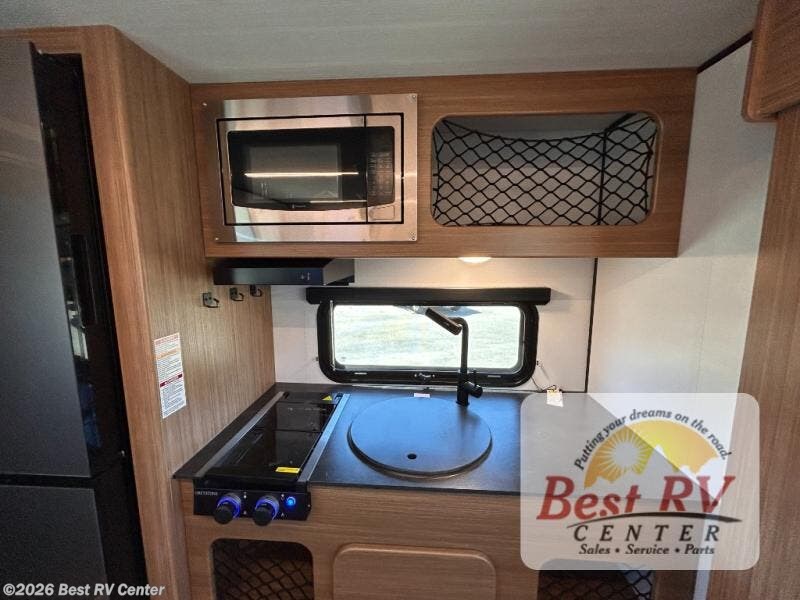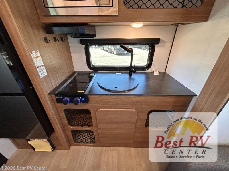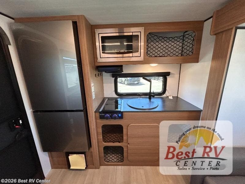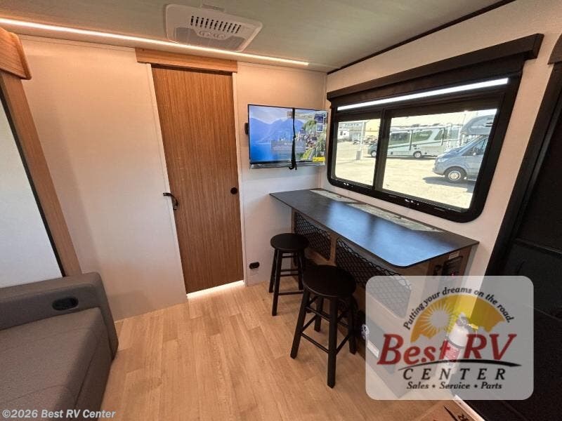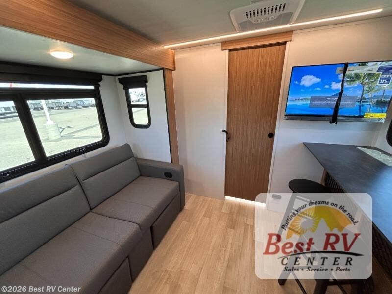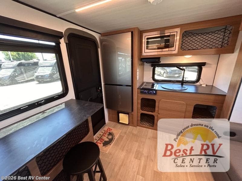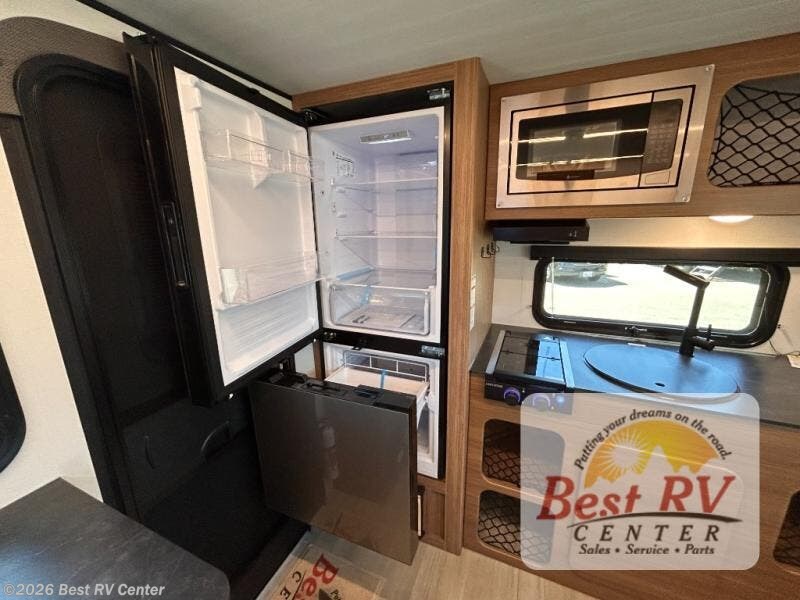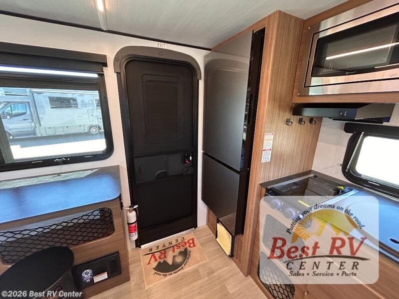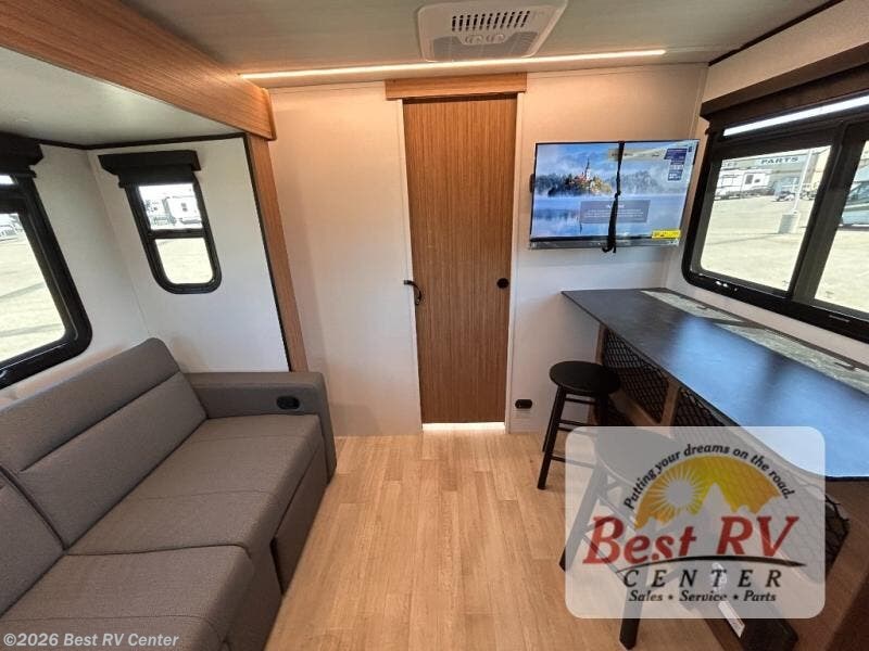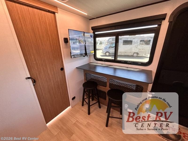 You will love this travel trailer's stunning rear kitchen design! The theater dinette provides a comfortable spot for meals and relaxation, while the bar countertop with stools offers a space for socializing and enjoying drinks. Also, overhead cabinets provide ample storage for your kitchen essentials. In the center of this travel trailer, the walkthrough bathroom features a convenient flip-down sink and linen closet, making it easy to get ready and stay organized. Moreover, the front bedroom is a serene retreat, featuring a spacious 60” x 74” bed with cubbies beside the bed for storing your favorite books, glasses, or other personal items. Plus, a 13' awning provides shade and protection from the elements, creating a comfortable outdoor living space.