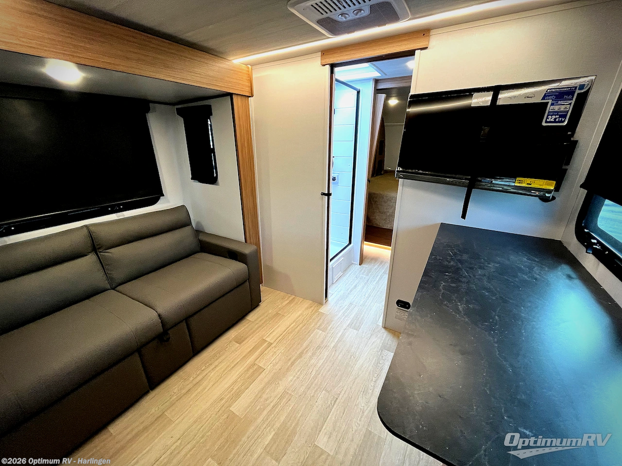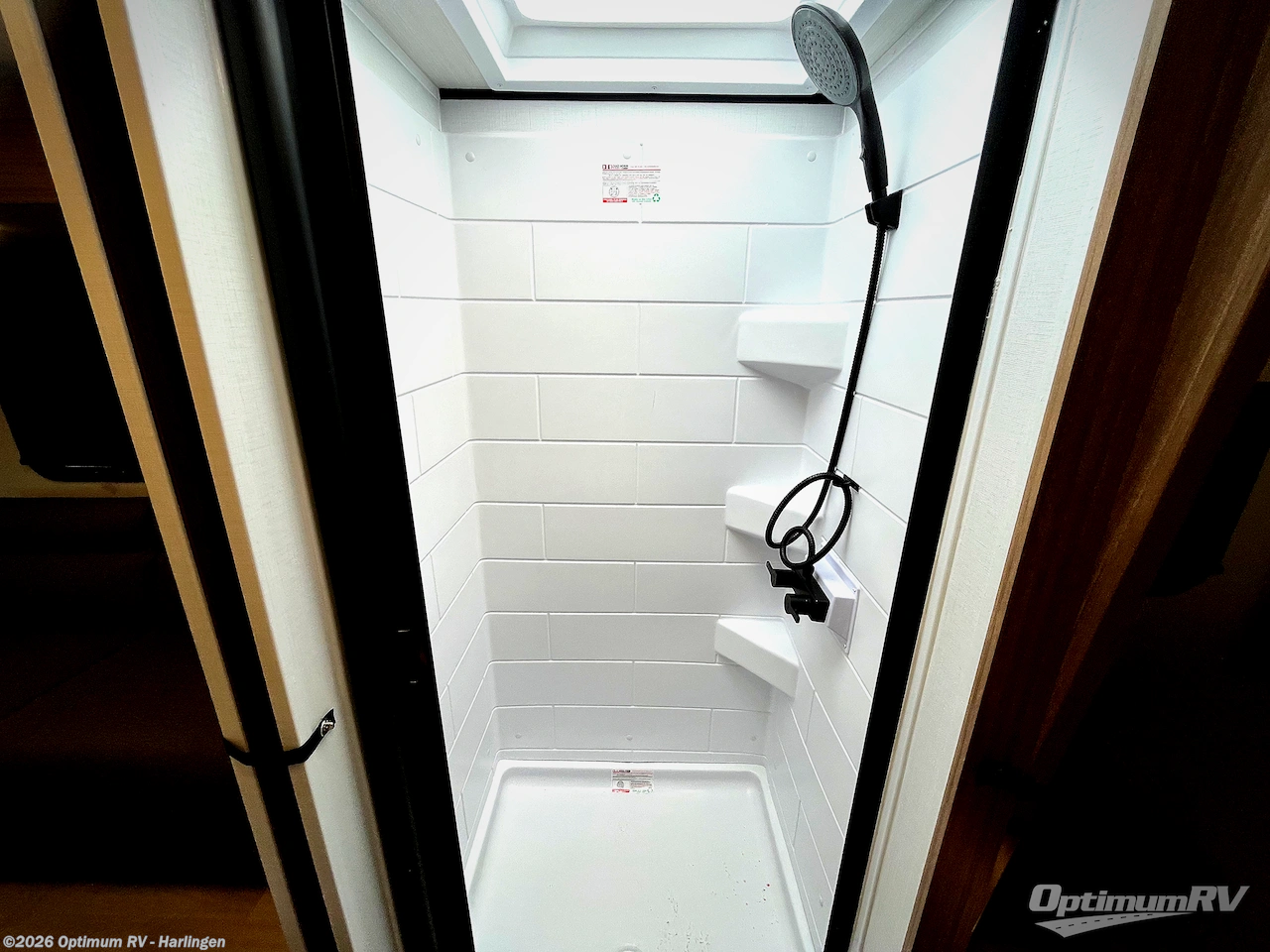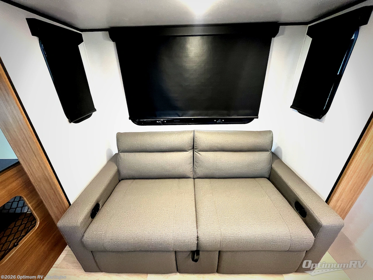 You will love this travel trailer's stunning rear kitchen design! The theater dinette provides a comfortable spot for meals and relaxation, while the bar countertop with stools offers a space for socializing and enjoying drinks. Also, overhead cabinets provide ample storage for your kitchen essentials. In the center of this travel trailer, the walkthrough bathroom features a convenient flip-down sink and linen closet, making it easy to get ready and stay organized. Moreover, the front bedroom is a serene retreat, featuring a spacious 60” x 74” bed with cubbies beside the bed for storing your favorite books, glasses, or other personal items. Plus, a 13' awning provides shade and protection from the elements, creating a comfortable outdoor living space.