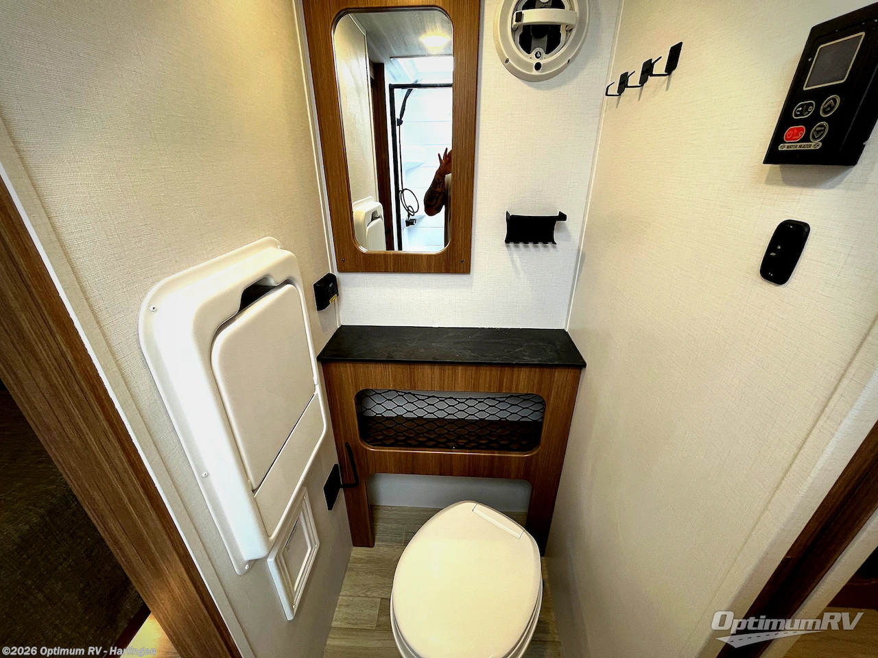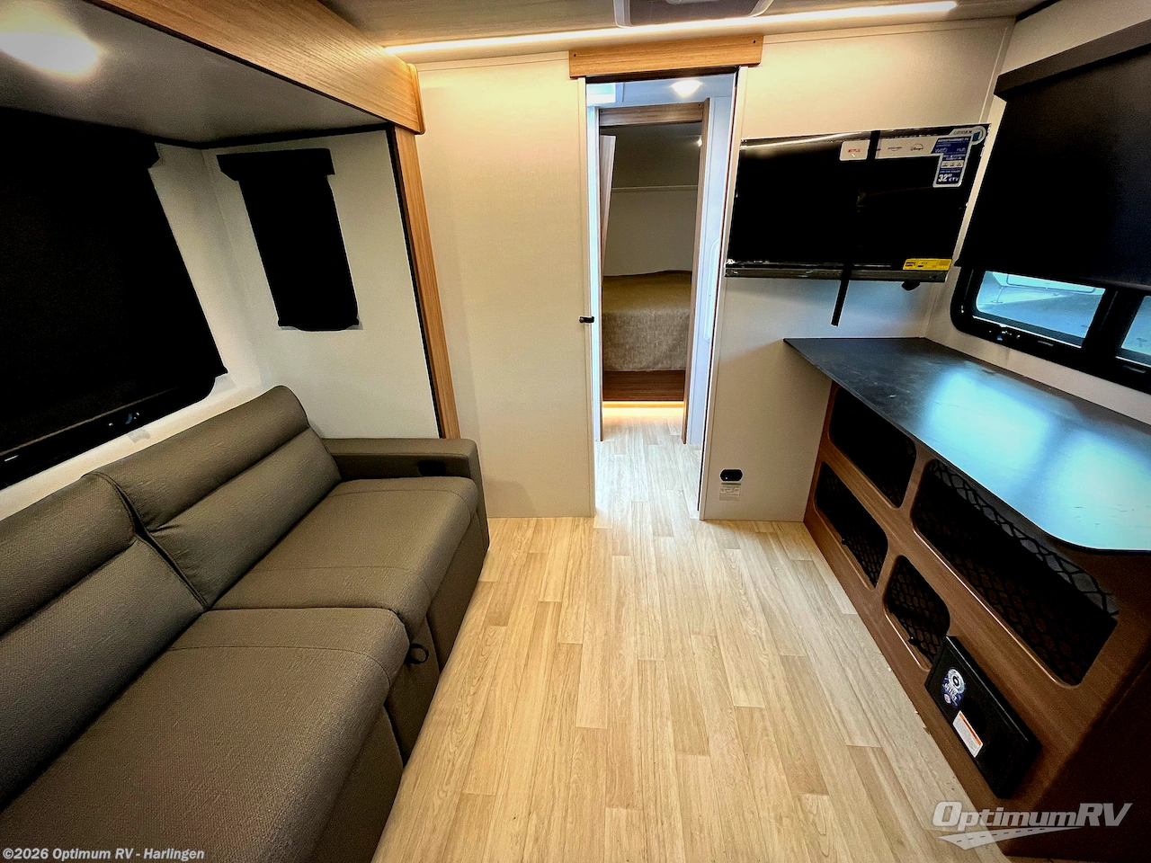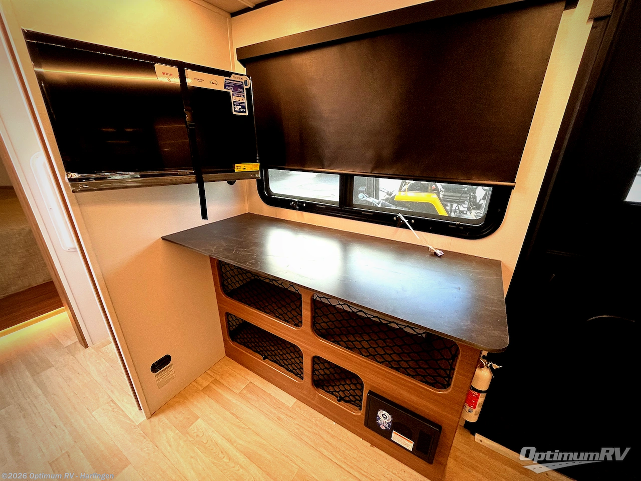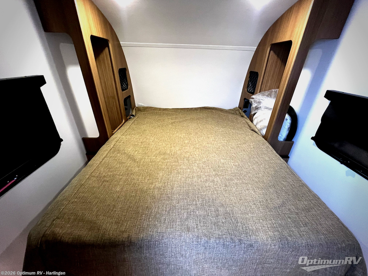 You will love this travel trailer's stunning rear kitchen design! The theater dinette provides a comfortable spot for meals and relaxation, while the bar countertop with stools offers a space for socializing and enjoying drinks. Also, overhead cabinets provide ample storage for your kitchen essentials. In the center of this travel trailer, the walkthrough bathroom features a convenient flip-down sink and linen closet, making it easy to get ready and stay organized. Moreover, the front bedroom is a serene retreat, featuring a spacious 60” x 74” bed with cubbies beside the bed for storing your favorite books, glasses, or other personal items. Plus, a 13' awning provides shade and protection from the elements, creating a comfortable outdoor living space.