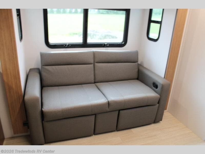 You will love this travel trailer's stunning rear kitchen design! The theater dinette provides a comfortable spot for meals and relaxation, while the bar countertop with stools offers a space for socializing and enjoying drinks. Also, overhead cabinets provide ample storage for your kitchen essentials. In the center of this travel trailer, the walkthrough bathroom features a convenient flip-down sink and linen closet, making it easy to get ready and stay organized. Moreover, the front bedroom is a serene retreat, featuring a spacious 60” x 74” bed with cubbies beside the bed for storing your favorite books, glasses, or other personal items. Plus, a 13' awning provides shade and protection from the elements, creating a comfortable outdoor living space.
