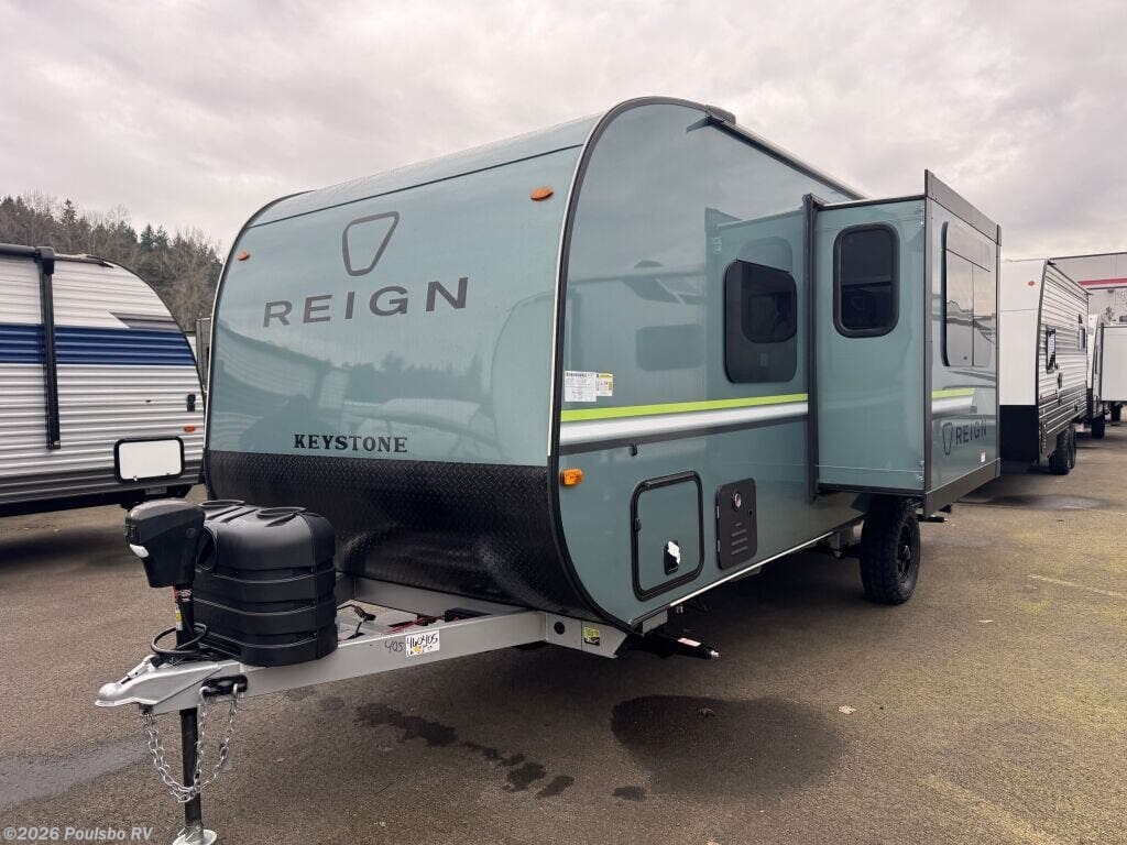 The 2026 Keystone Reign 18RB is a new travel trailer designed for those who want a compact, easy-to-tow unit with practical features for comfortable travel. Measuring just over 22 feet in length, this model is ideal for exploring with ease and convenience. Inside, it offers sleeping accommodations for two, providing a restful retreat after long days on the road. The living area includes one slide-out, which increases interior space for a more open and comfortable environment. This makes relaxing or entertaining inside much more enjoyable. The trailer features both front and rear manual leveling jacks, making setup at any campsite quick and simple to ensure stability. An exterior awning extends your living space outdoors, allowing you to enjoy fresh air with protection from the sun. The 2026 Reign 18RB focuses on essential comforts and smart use of space, delivering a reliable and efficient travel experience. Keystone?s reputation for quality construction and practical design is evident in this model. Whether you are planning weekend escapes or extended trips, this travel trailer offers the functionality and ease needed for enjoyable adventures. As a family-owned, award-winning local RV dealer with multiple locations in Sumner, Everett, Kent, and Mt. Vernon Washington, Poulsbo RV here to help you find the perfect RV. Stock#: S981, VIN: 4YDTRNH11TD460405.