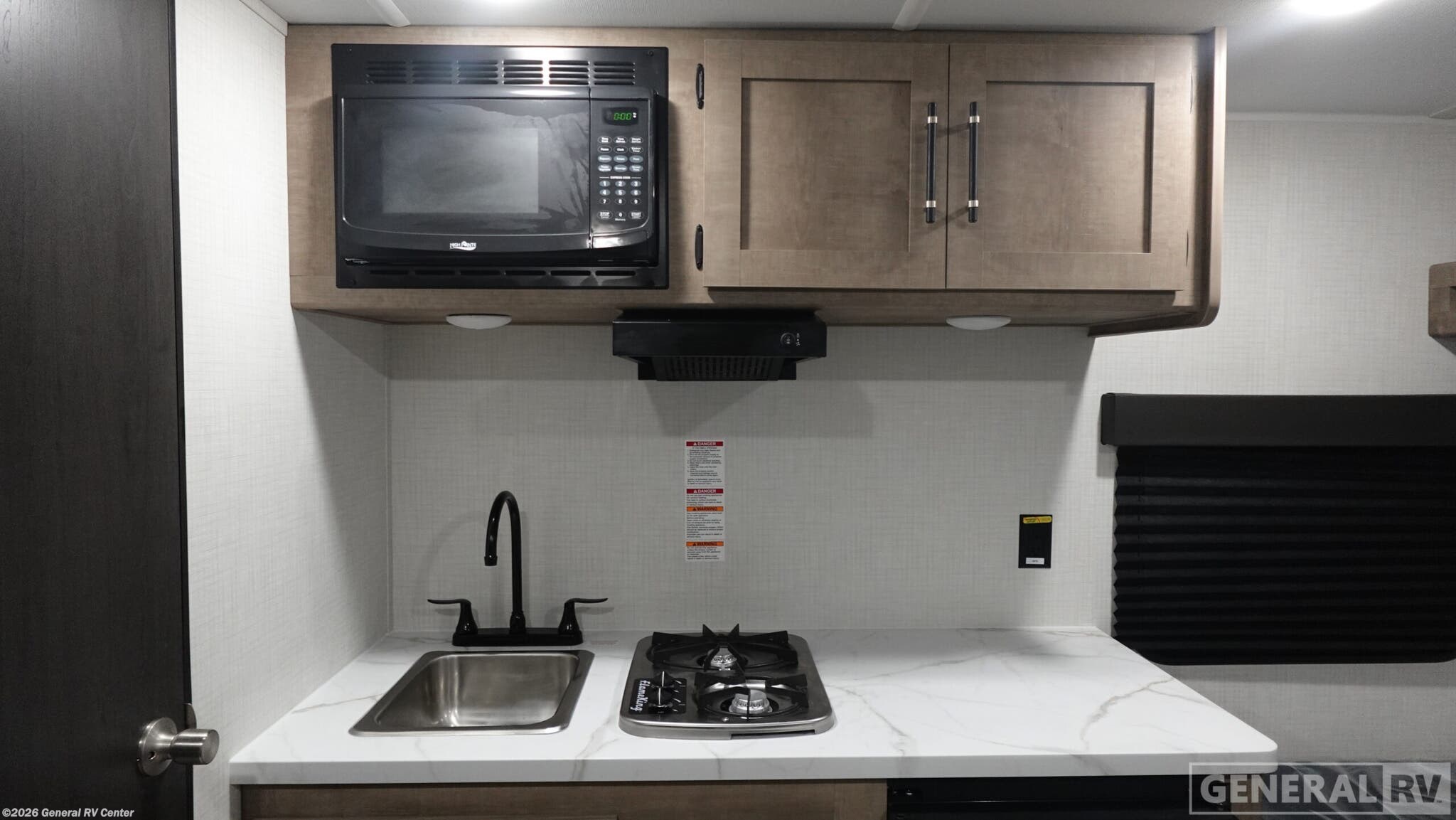 Keystone Springdale Mini travel trailer 1200BT highlights: -Full-Size Bed -Exterior Pass-Thru Storage -3.3 Cu. Ft. 12V Refrigerator -Bar Table This lightweight travel trailer is perfect for a couple. You'll enjoy the front full-size bed, with a shelf above the bed to keep your things organized. A private bath includes a shower with a toilet so you can freshen up each day without having to leave your camper. You can make your meals on the two burner gas cooktop or in the microwave oven, then take your plate outdoors to eat under the 8' power awning! With any Springdale Mini travel trailer by Keystone, you will enjoy lightweight towing thanks to their single-axle! The 8' power awning will provide protection from the sun as you relax in your camp chairs outside. Each model includes blackout night shades, LED lighting, decorative tub surround, plus many more interior comforts. There is also a roof A/C and 20K BTU furnace to keep you comfortable, plus a tankless water heater for endless hot showers after a long day of adventuring!