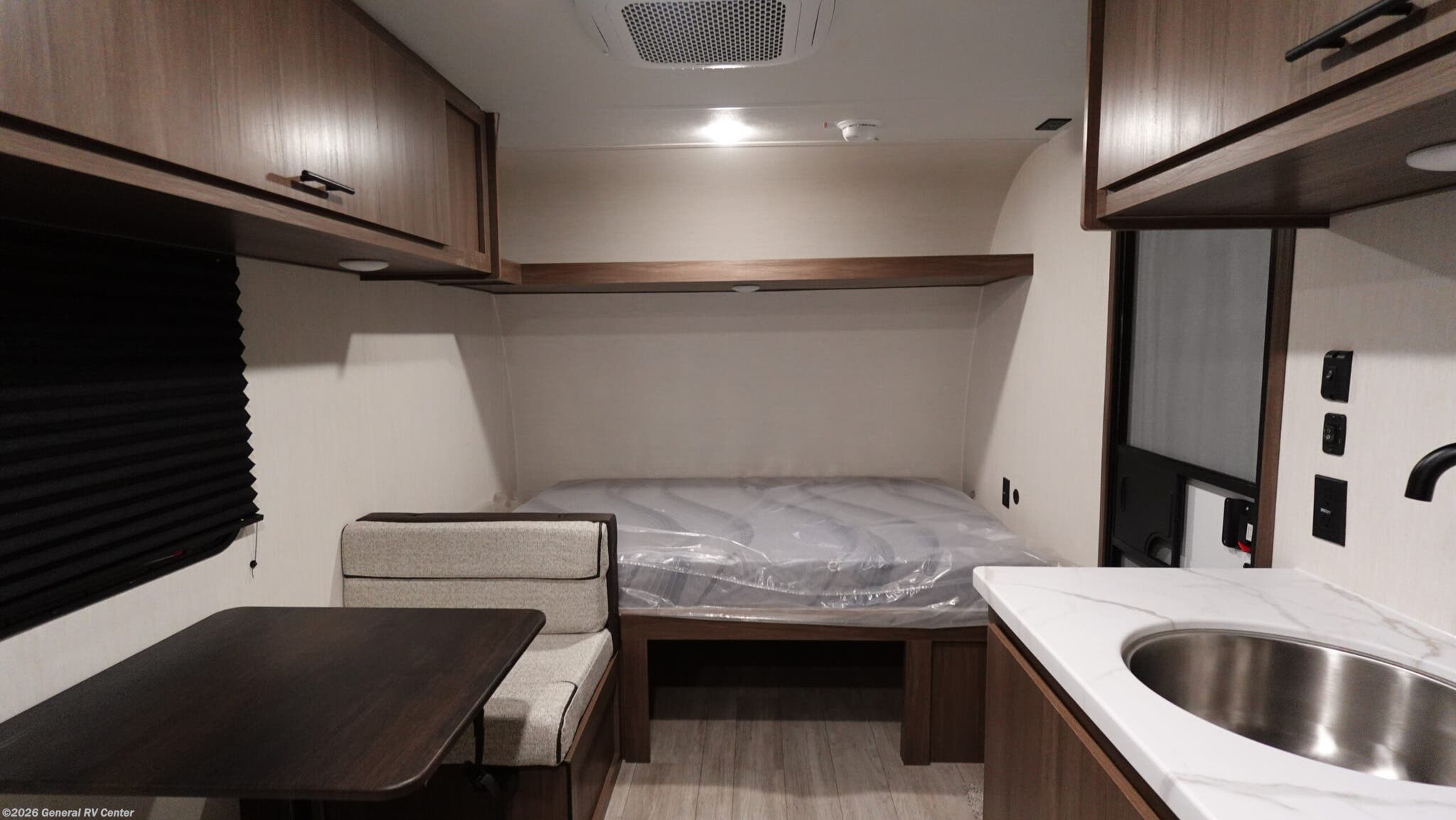 Keystone Springdale Mini travel trailer 1200BT highlights: -Full-Size Bed -Exterior Pass-Thru Storage -3.3 Cu. Ft. 12V Refrigerator -Bar Table This lightweight travel trailer is perfect for a couple. You'll enjoy the front full-size bed, with a shelf above the bed to keep your things organized. A private bath includes a shower with a toilet so you can freshen up each day without having to leave your camper. You can make your meals on the two burner gas cooktop or in the microwave oven, then take your plate outdoors to eat under the 8' power awning! With any Springdale Mini travel trailer by Keystone, you will enjoy lightweight towing thanks to their single-axle! The 8' power awning will provide protection from the sun as you relax in your camp chairs outside. Each model includes blackout night shades, LED lighting, decorative tub surround, plus many more interior comforts. There is also a roof A/C and 20K BTU furnace to keep you comfortable, plus a tankless water heater for endless hot showers after a long day of adventuring!