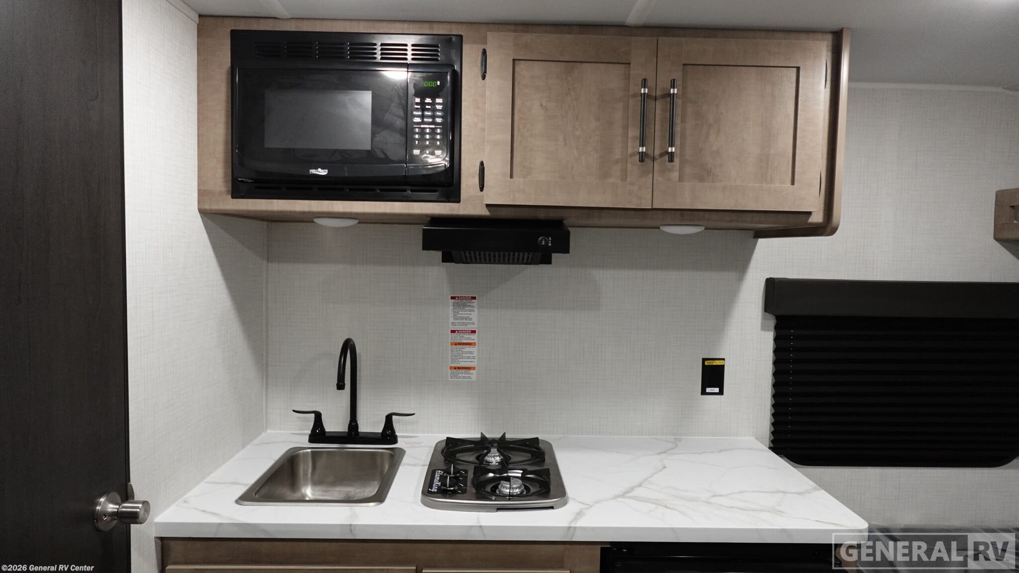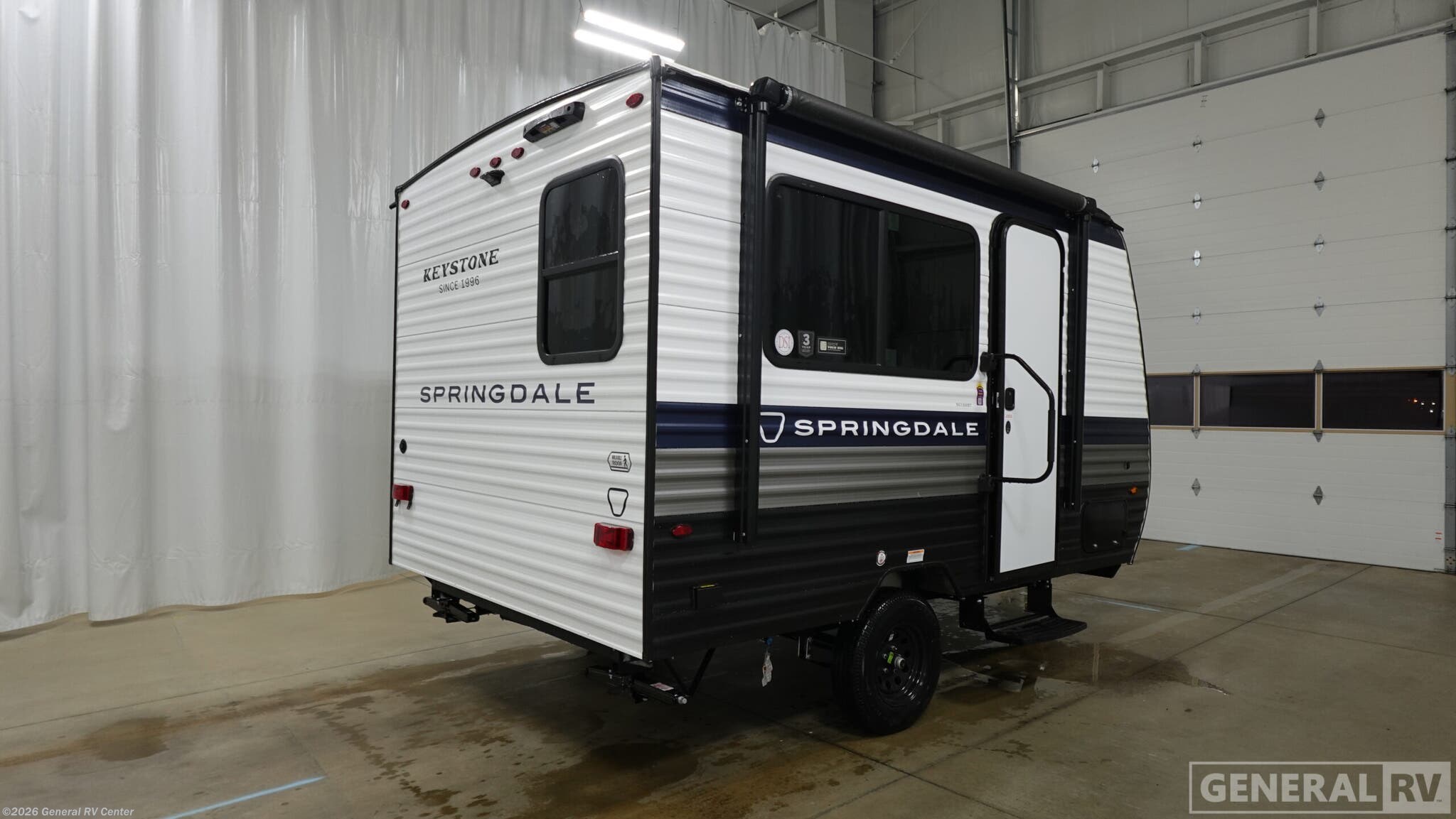 Keystone Springdale Mini travel trailer 1200BT highlights: Bar Table Full-Size Bed 8' Power Awning 3.3 Cu. Ft. Refrigerator Your small crew will love camping in this lightweight travel trailer. There is a full-size bed up front with an overhead shelf to keep belongings out of the way. The two-burner cooktop and microwave oven will let you make breakfast in the morning, and the bar table with two stools provides a place to dine together. And a private bath with a shower and toilet lets you easily clean up after a day outdoors! With any Springdale Mini travel trailer by Keystone, you will enjoy lightweight towing thanks to their single axle! The XL tinted safety glass windows are ultra durable, and the power awning will provide protection from the sun as you relax in your camp chairs outside. Each model includes blackout night shades, LED lighting, plus many more interior comforts. There is also a 20K BTU furnace to keep you comfortable, plus a tankless water heater for endless hot showers!