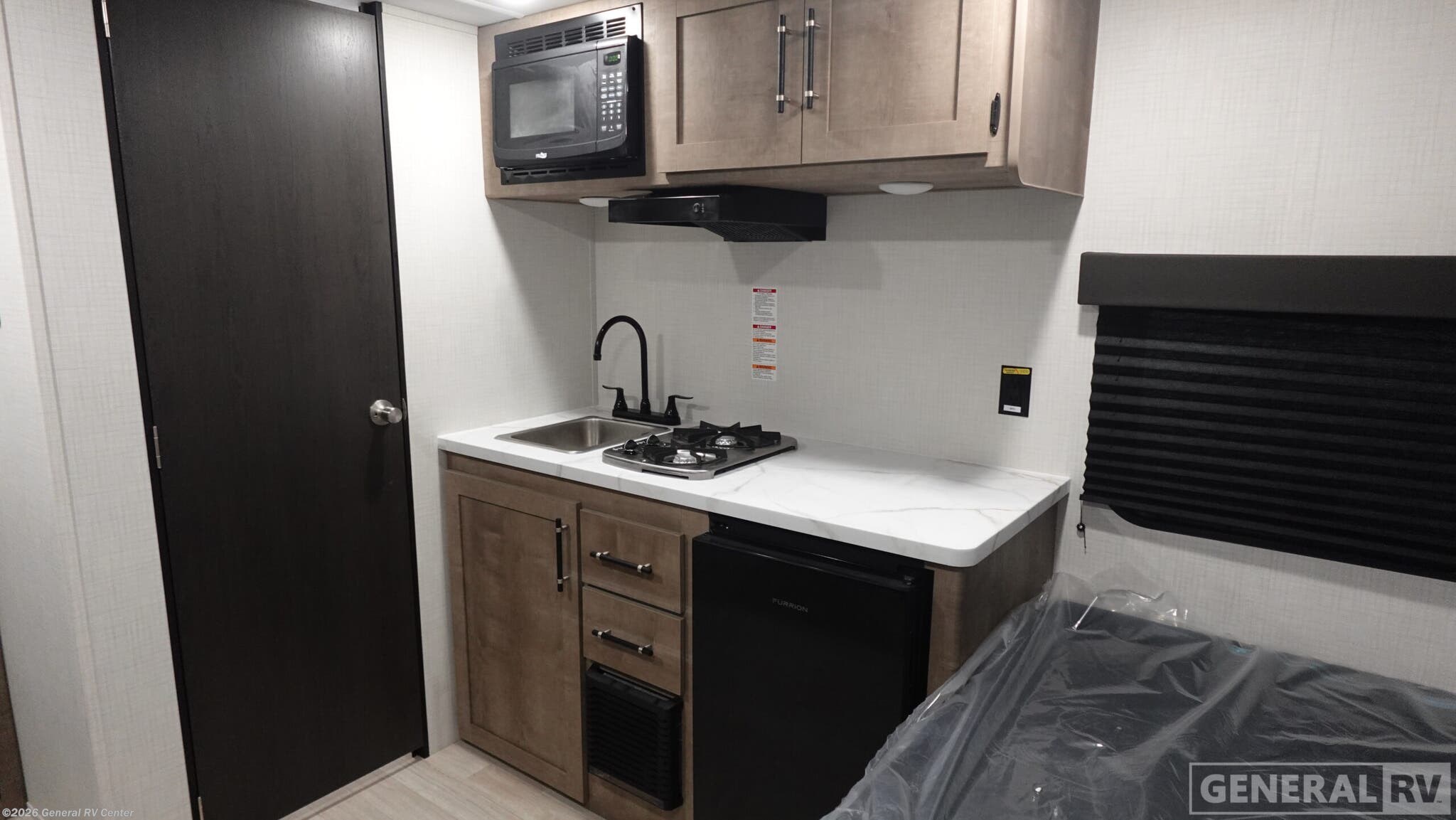 Keystone Springdale Mini travel trailer 1200BT highlights: Bar Table Full-Size Bed 8' Power Awning 3.3 Cu. Ft. Refrigerator Your small crew will love camping in this lightweight travel trailer. There is a full-size bed up front with an overhead shelf to keep belongings out of the way. The two-burner cooktop and microwave oven will let you make breakfast in the morning, and the bar table with two stools provides a place to dine together. And a private bath with a shower and toilet lets you easily clean up after a day outdoors! With any Springdale Mini travel trailer by Keystone, you will enjoy lightweight towing thanks to their single axle! The XL tinted safety glass windows are ultra durable, and the power awning will provide protection from the sun as you relax in your camp chairs outside. Each model includes blackout night shades, LED lighting, plus many more interior comforts. There is also a 20K BTU furnace to keep you comfortable, plus a tankless water heater for endless hot showers!