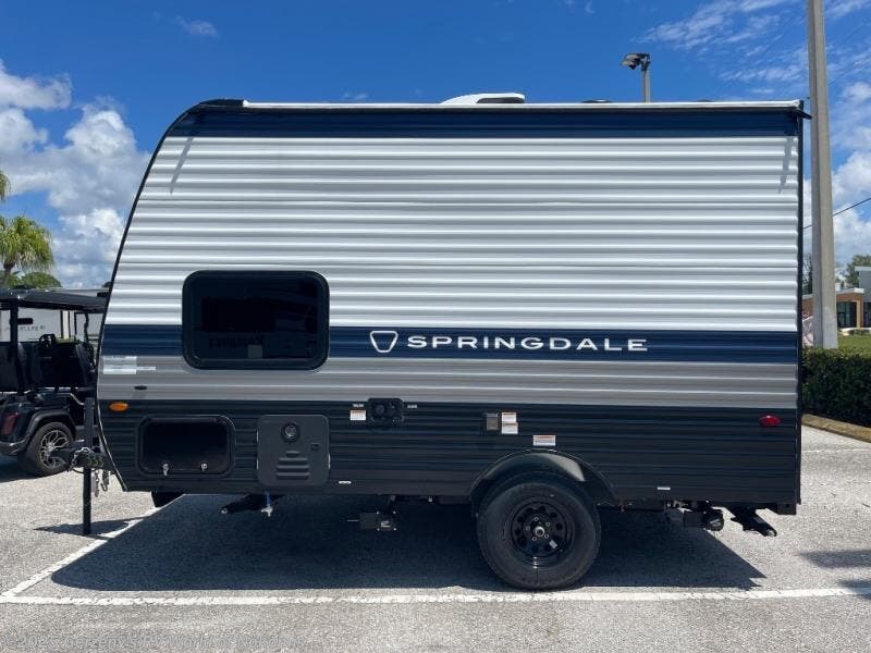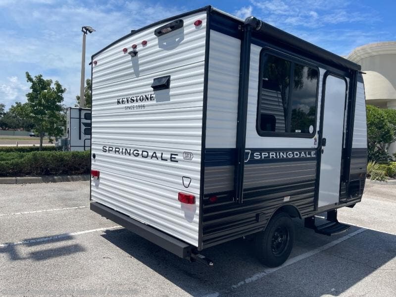 With any Springdale Mini travel trailer by Keystone, you will enjoy lightweight towing thanks to their single-axle! The AlphaPly TPO roof membrane is ultra durable, and the power awning will provide protection from the sun as you relax in your camp chairs outside. Each model includes blackout night shades, LED lighting, plus many more interior comforts. There is also a roof A/C and 20K BTU furnace to keep you comfortable, plus a tankless water heater for endless hot showers!