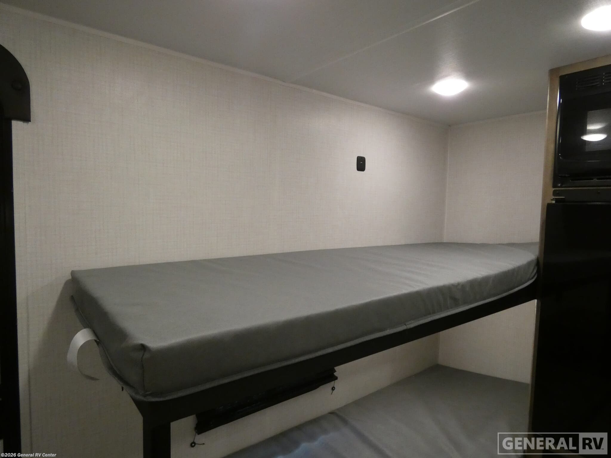 This lightweight travel trailer is perfect for four happy campers. You'll enjoy the front full-size bed, while your guests or little ones take the 28" x 74" bunk beds. There is also a shelf above the bed to keep your things organized. A private bath includes a shower with a toilet so you can freshen up each day without having to leave your camper. You can make your meals on the two burner gas cooktop or in the microwave oven, then take your plate outdoors to eat under the 8' power awning! With any Springdale Mini travel trailer by Keystone, you will enjoy lightweight towing thanks to their single-axle! The AlphaPly TPO roof membrane is ultra durable, and the power awning will provide protection from the sun as you relax in your camp chairs outside. Each model includes blackout night shades, LED lighting, plus many more interior comforts. There is also a roof A/C and 20K BTU furnace to keep you comfortable, plus a tankless water heater for endless hot showers!