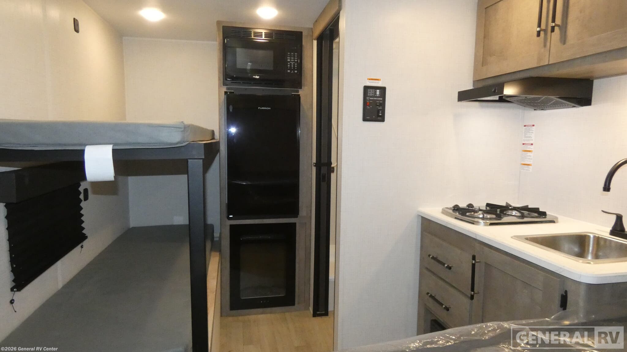 ## Keystone Springdale Mini travel trailer 1300BH highlights: - Full-Size Bed - Exterior Pass-Thru Storage - 3.3 Cu. Ft. 12V Refrigerator - Bunk Beds This lightweight travel trailer is perfect for four happy campers. You'll enjoy the front full-size bed, while your guests or little ones take the 28" x 74" bunk beds. There is also a shelf above the bed to keep your things organized. A private bath includes a shower with a toilet so you can freshen up each day without having to leave your camper. You can make your meals on the two burner gas cooktop or in the microwave oven, then take your plate outdoors to eat under the 8' power awning! With any Springdale Mini travel trailer by Keystone, you will enjoy lightweight towing thanks to their single-axle! The AlphaPly TPO roof membrane is ultra durable, and the power awning will provide protection from the sun as you relax in your camp chairs outside. Each model includes blackout night shades, LED lighting, plus many more interior comforts. There is also a roof A/C and 20K BTU furnace to keep you comfortable, plus a tankless water heater for endless hot showers!