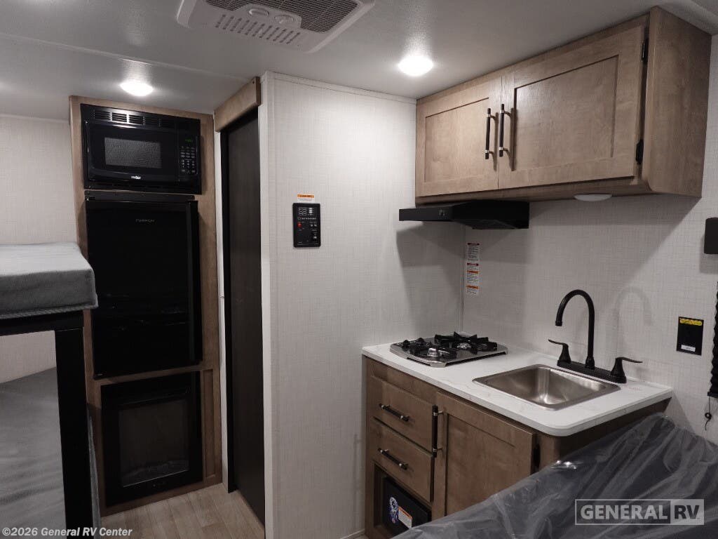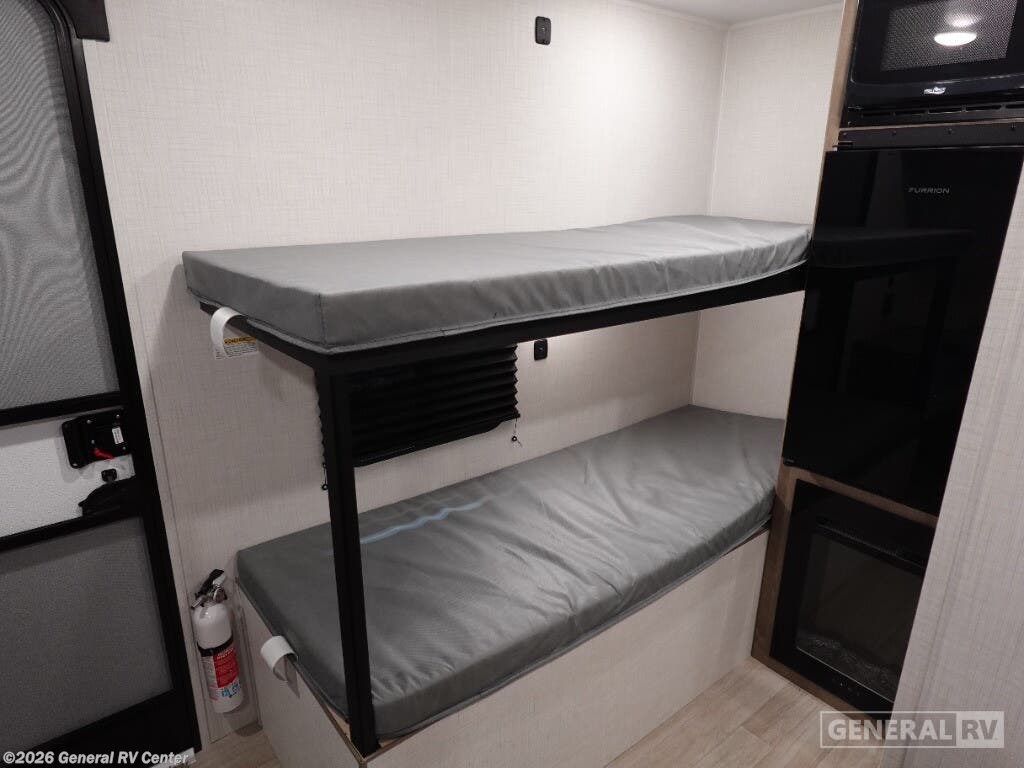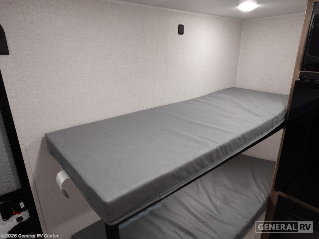 Keystone Springdale Mini travel trailer 1300BH highlights: Full-Size Bed Exterior Pass-Thru Storage 3.3 Cu. Ft. 12V Refrigerator Bunk Beds This lightweight travel trailer is perfect for four happy campers. You'll enjoy the front full-size bed, while your guests or little ones take the 28" x 74" bunk beds. There is also a shelf above the bed to keep your things organized. A private bath includes a shower with a toilet so you can freshen up each day without having to leave your camper. You can make your meals on the two burner gas cooktop or in the microwave oven, then take your plate outdoors to eat under the 8' power awning! With any Springdale Mini travel trailer by Keystone, you will enjoy lightweight towing thanks to their single-axle! The AlphaPly TPO roof membrane is ultra durable, and the power awning will provide protection from the sun as you relax in your camp chairs outside. Each model includes blackout night shades, LED lighting, plus many more interior comforts. There is also a roof A/C and 20K BTU furnace to keep you comfortable, plus a tankless water heater for endless hot showers!
