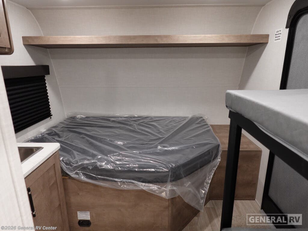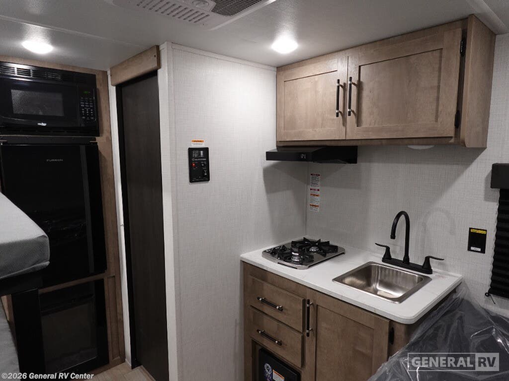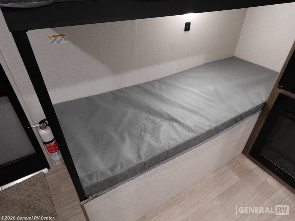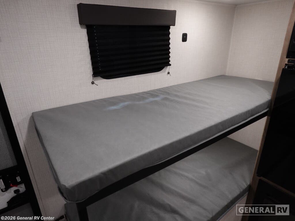 Keystone Springdale Mini travel trailer 1300BH highlights: Full-Size Bed Exterior Pass-Thru Storage 3.3 Cu. Ft. 12V Refrigerator Bunk Beds This lightweight travel trailer is perfect for four happy campers. You'll enjoy the front full-size bed, while your guests or little ones take the 28" x 74" bunk beds. There is also a shelf above the bed to keep your things organized. A private bath includes a shower with a toilet so you can freshen up each day without having to leave your camper. You can make your meals on the two burner gas cooktop or in the microwave oven, then take your plate outdoors to eat under the 8' power awning! With any Springdale Mini travel trailer by Keystone, you will enjoy lightweight towing thanks to their single-axle! The AlphaPly TPO roof membrane is ultra durable, and the power awning will provide protection from the sun as you relax in your camp chairs outside. Each model includes blackout night shades, LED lighting, plus many more interior comforts. There is also a roof A/C and 20K BTU furnace to keep you comfortable, plus a tankless water heater for endless hot showers!