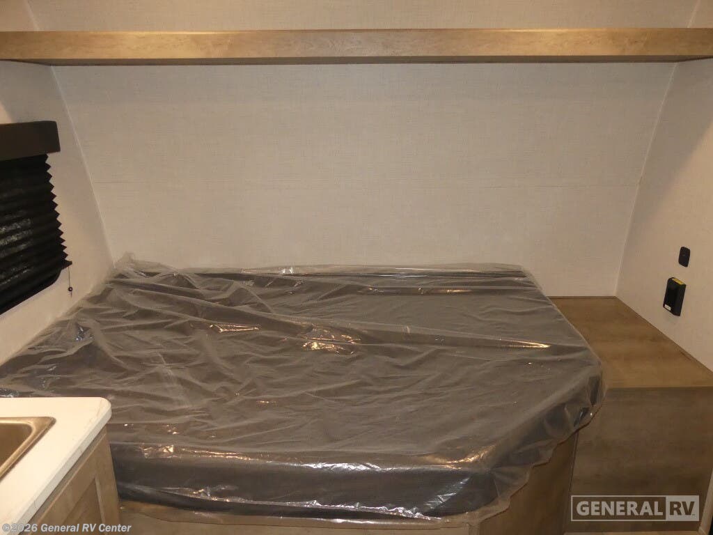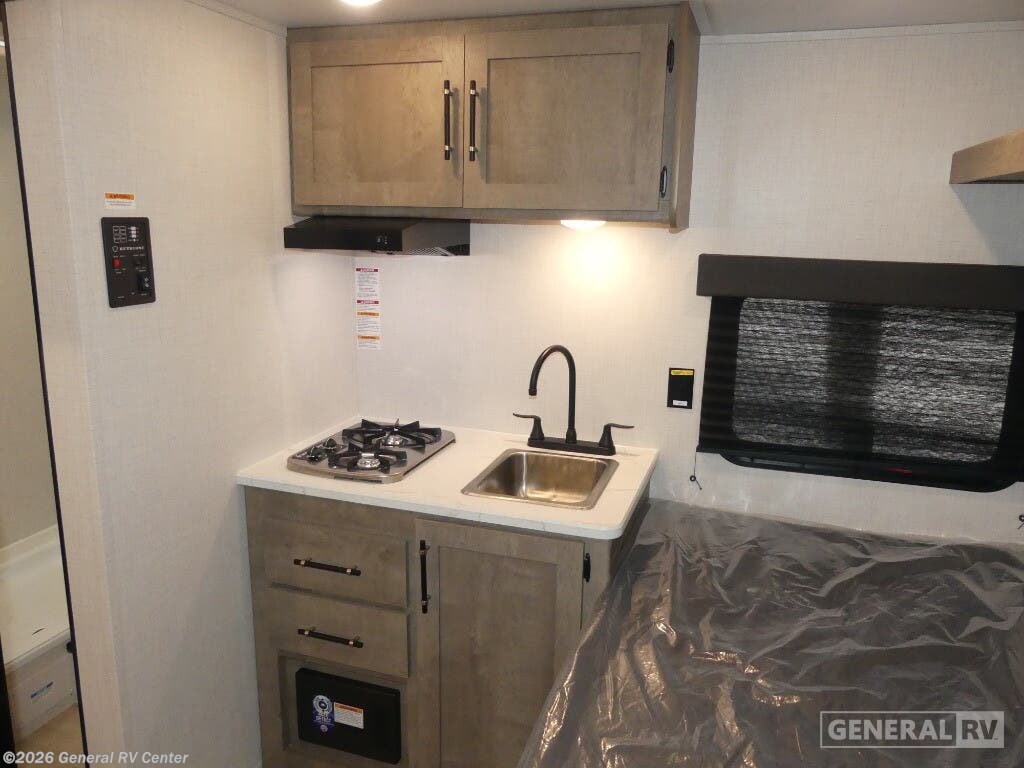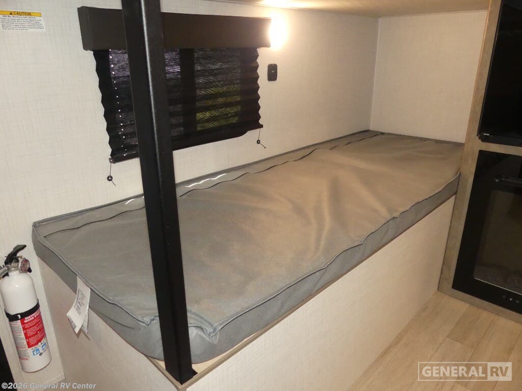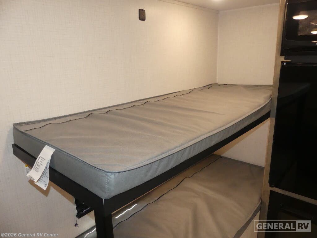 Keystone Springdale Mini travel trailer 1300BH highlights: Full-Size Bed Exterior Pass-Thru Storage 3.3 Cu. Ft. 12V Refrigerator Bunk Beds This lightweight travel trailer is perfect for four happy campers. You'll enjoy the front full-size bed, while your guests or little ones take the 28" x 74" bunk beds. There is also a shelf above the bed to keep your things organized. A private bath includes a shower with a toilet so you can freshen up each day without having to leave your camper. You can make your meals on the two burner gas cooktop or in the microwave oven, then take your plate outdoors to eat under the 8' power awning! With any Springdale Mini travel trailer by Keystone, you will enjoy lightweight towing thanks to their single-axle! The AlphaPly TPO roof membrane is ultra durable, and the power awning will provide protection from the sun as you relax in your camp chairs outside. Each model includes blackout night shades, LED lighting, plus many more interior comforts. There is also a roof A/C and 20K BTU furnace to keep you comfortable, plus a tankless water heater for endless hot showers!