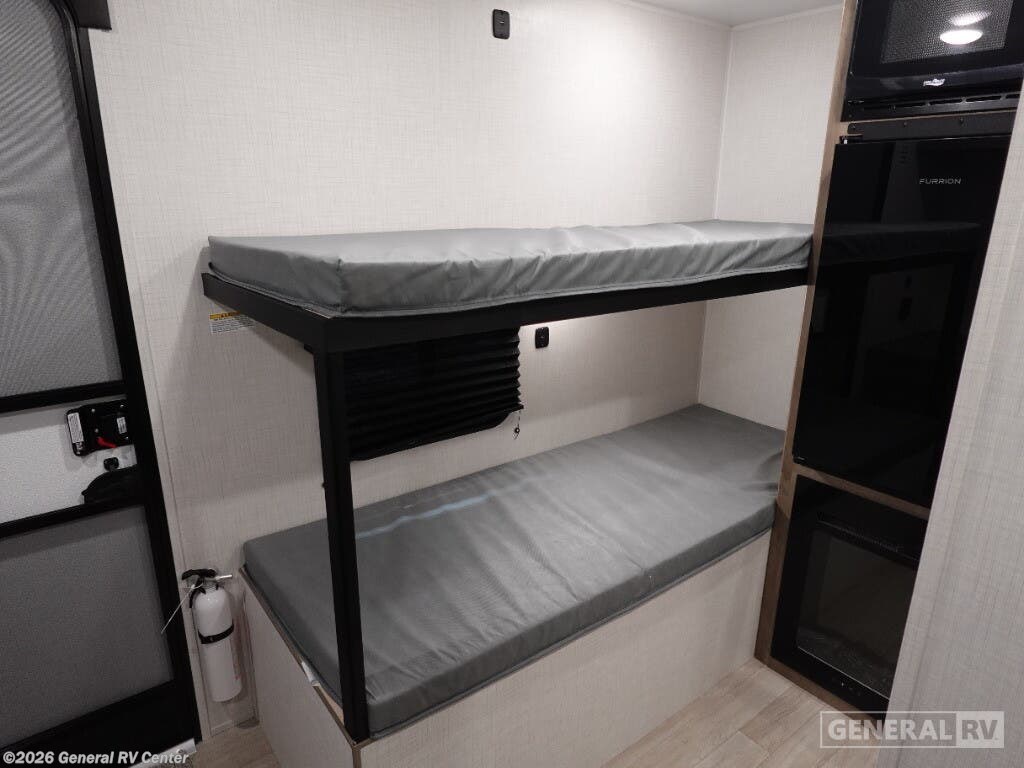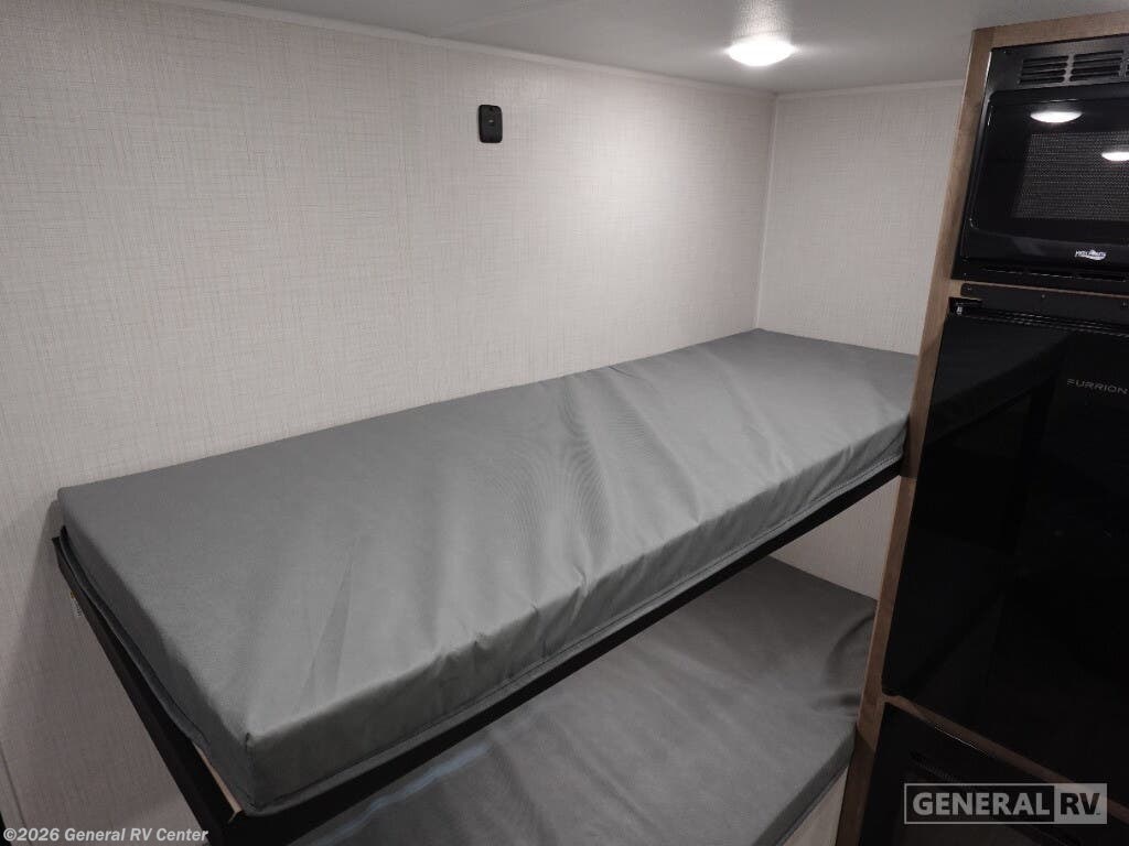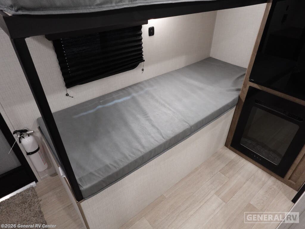 Keystone Springdale Mini travel trailer 1300BH highlights: Full-Size Bed Exterior Pass-Thru Storage 3.3 Cu. Ft. 12V Refrigerator Bunk Beds This lightweight travel trailer is perfect for four happy campers. You'll enjoy the front full-size bed, while your guests or little ones take the 28" x 74" bunk beds. There is also a shelf above the bed to keep your things organized. A private bath includes a shower with a toilet so you can freshen up each day without having to leave your camper. You can make your meals on the two burner gas cooktop or in the microwave oven, then take your plate outdoors to eat under the 8' power awning! With any Springdale Mini travel trailer by Keystone, you will enjoy lightweight towing thanks to their single-axle! The AlphaPly TPO roof membrane is ultra durable, and the power awning will provide protection from the sun as you relax in your camp chairs outside. Each model includes blackout night shades, LED lighting, plus many more interior comforts. There is also a roof A/C and 20K BTU furnace to keep you comfortable, plus a tankless water heater for endless hot showers!