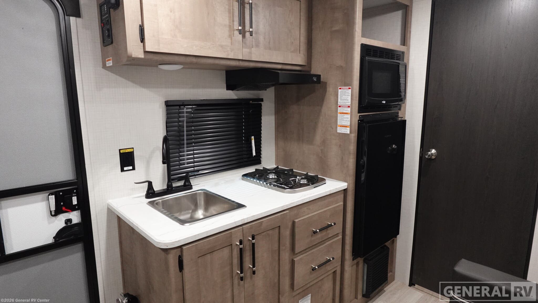 Keystone Springdale Mini travel trailer 1800BH highlights: Bunk Beds Queen Bed Exterior Pass-Thru Storage Two Burner Gas Range Get ready for outdoor fun with your favorite people when you have this trailer in tow! Once at your campsite, you can easily setup the 10' power awning, grab your camping chairs from the pass-thru storage, and relax or start playing. The cook will love the galley kitchen with the two burner cooktop, plus a refrigerator for cold items. If you like, you can eat inside at the booth dinette which doubles as sleeping space, and of course the kids will love the bunk beds next to the full bathroom. And you will sleep soundly on the front queen bed. With any Springdale Mini travel trailer by Keystone, you will enjoy lightweight towing thanks to their single-axle! The AlphaPly TPO roof membrane is ultra durable, and the power awning will provide protection from the sun as you relax in your camp chairs outside. Each model includes blackout night shades, LED lighting, plus many more interior comforts. There is also a roof A/C and 20K BTU furnace to keep you comfortable, plus a tankless water heater for endless hot showers!