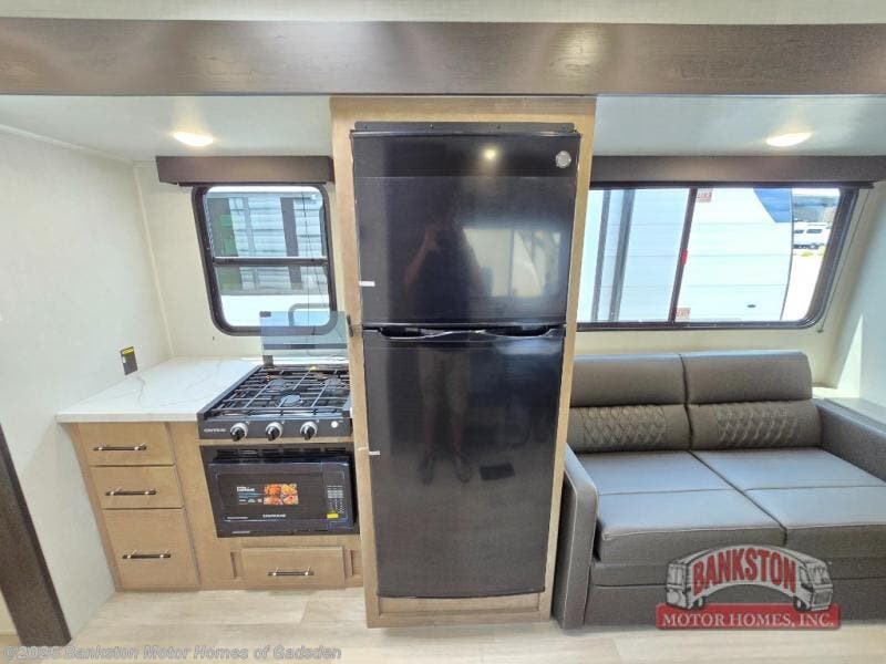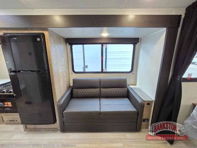 You'll love the added space in this travel trailer thanks to the large slide out. Here, you'll find the sofa with an end table, plus the 12V refrigerator and three burner gas range. There is kitchen counter space in the rear corner, and you'll find the full bath in the other rear corner for easy use. The front queen bed includes a privacy curtain for when you have guests staying over on the sofa and booth dinette, plus there are dual bedside closets and nightstands for your things!