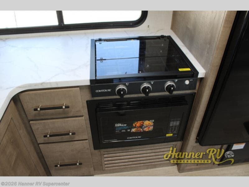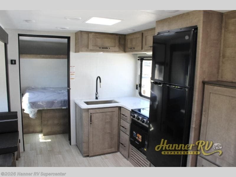 You'll feel right at home wherever you decide to camp in this travel trailer. The large slide out in the combined kitchen and living area gives your crew plenty of space to move about, plus there is a booth dinette and sofa for comfy seating and sleeping spaces. A full kitchen, compete with three burner cooktop and 10 cu. ft. 12V refrigerator will let you cook and store food for the whole week. Head to the full rear bath that includes a spacious vanity, a shower, toilet, and linen closet for clean towels. And when you're ready to catch some zzz's, the queen bed in the front private bedroom is sure to bring comfort!