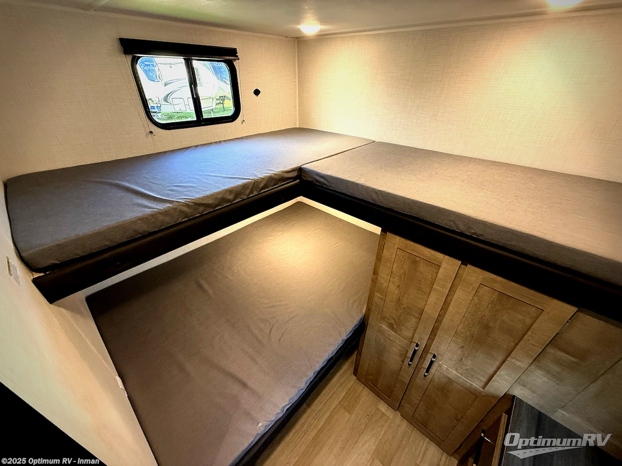 Camping with friends and family is easier than ever in this spacious trailer with a rear private bunkhouse! You'll find triple bunks in this room, along with two closets to keep everything tidy. The front private bedroom will feel just like home with its queen bed, plus dual closets and dual nightstands. Your crew can all gather in the main living area to relax on the sofa or play a game at the booth dinette, and there is even TV prep in this room if you enjoy movie nights. Head outdoors to relax under the 16' power awning.