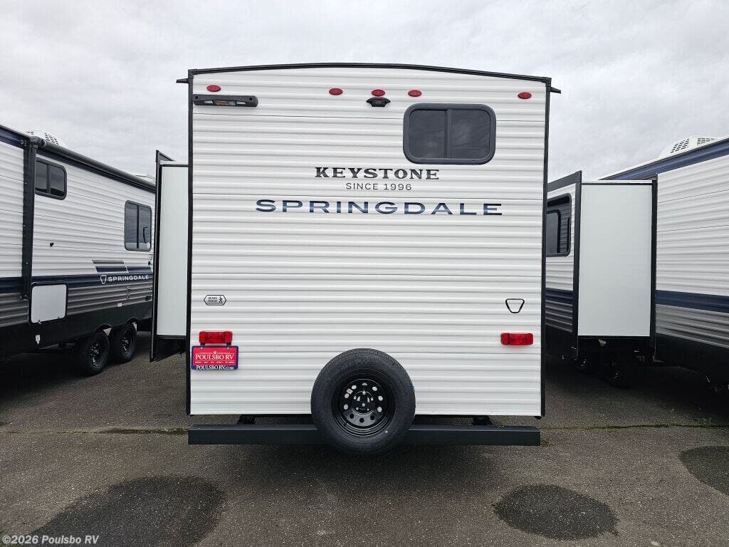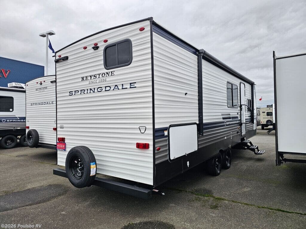 The 2026 Keystone Springdale Classic Double 269DBCWE is a spacious and versatile new travel trailer designed to enhance your RV adventures with family and friends. At just over 30 feet in length, this model offers a perfect balance between manageable size and ample living space. Ideal for those who need flexible sleeping accommodations, it comfortably sleeps up to 10 people, making it an excellent choice for larger families or groups. The thoughtfully designed bunkhouse provides designated sleeping quarters, ensuring everyone has their own space to relax and recharge. Step inside to discover a well-appointed living area that combines comfort and functionality. The single slide out expands the main living space, creating more room to gather, dine, or unwind after a day of exploration. Convenience is a priority with features such as a power awning providing shaded outdoor living, plus leveling jacks that make setup smooth and stable. Whether you are embarking on weekend getaways or extended road trips, this Keystone model supports a lifestyle of freedom and adventure with dependable construction and modern amenities. As a family-owned, award-winning local RV dealer with multiple locations in Sumner, Everett, Kent, and Mt. Vernon Washington, Poulsbo RV here to help you find the perfect RV. Stock#: M3775, VIN: 4YDTSGM29TG101476.