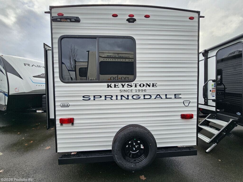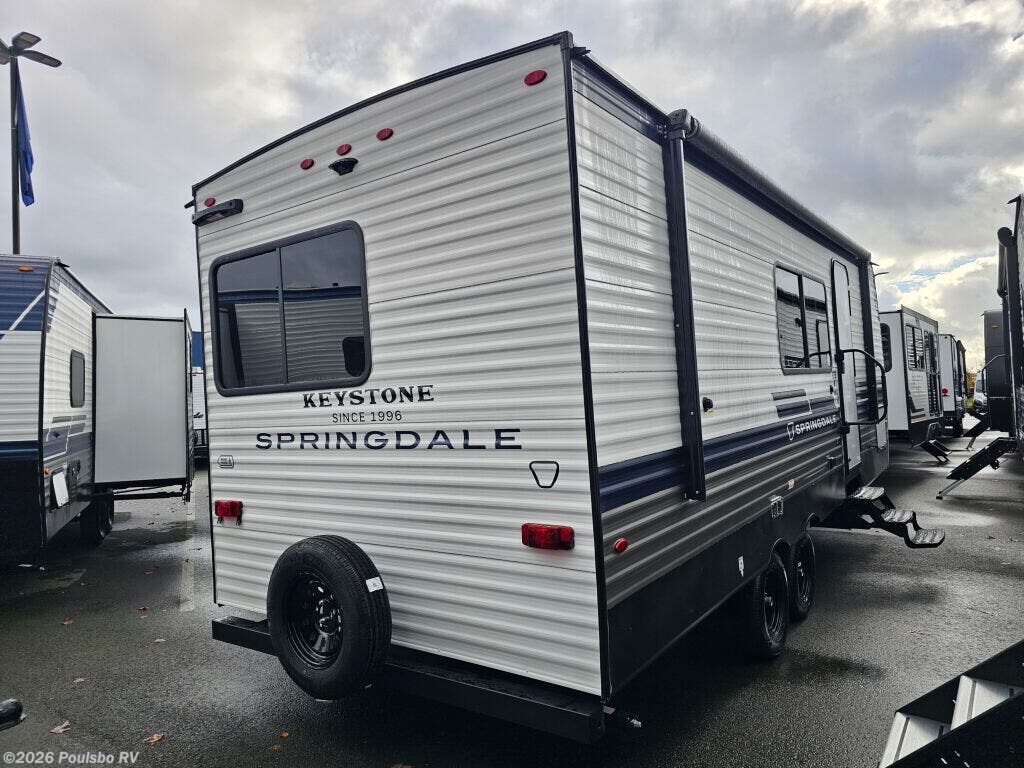 Introducing the 2026 Keystone Springdale Classic Double 224MLCWE, a brand new travel trailer designed for those who enjoy the freedom of RVing without sacrificing comfort and style. With a length of 26.2 feet and a GVWR of 7,500 pounds, this model is perfect for weekend getaways or extended road trips with family and friends. Featuring a single slide-out, this RV offers increased living space, allowing you to comfortably entertain guests or unwind after a day of adventure. You will appreciate the well-thought-out layout that ensures ample room for relaxation and convenience. The trailer includes modern amenities and a cozy living area, ideal for making lasting memories around the fire or inside during rainy days. An awning is included to provide shade and shelter as you enjoy your outdoor space. This unit comes equipped with a hitch weight of 640 pounds, making it manageable for many towing vehicles. Whether you are new to RVing or a seasoned traveler, the Keystone Springdale Classic Double is designed to meet your needs, allowing for easy set-up at your favorite campground. As a family-owned, award-winning local RV dealer with multiple locations in Sumner, Everett, Kent, and Mt. Vernon Washington, Poulsbo RV is here to help you find the perfect RV. Stock#: S956, VIN: 4YDTSGK27TG101463.