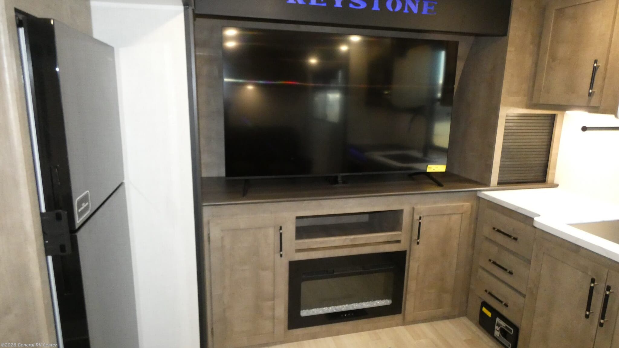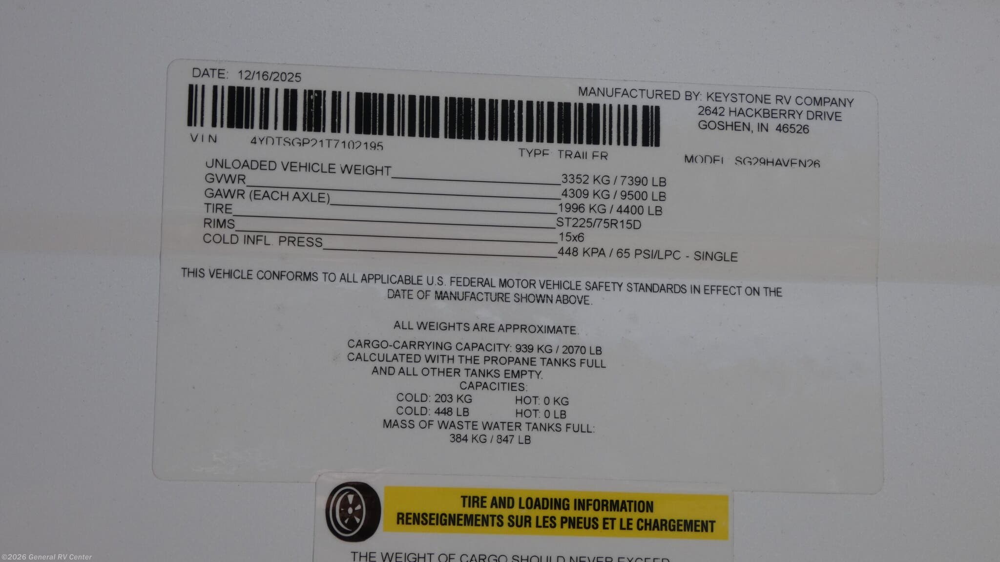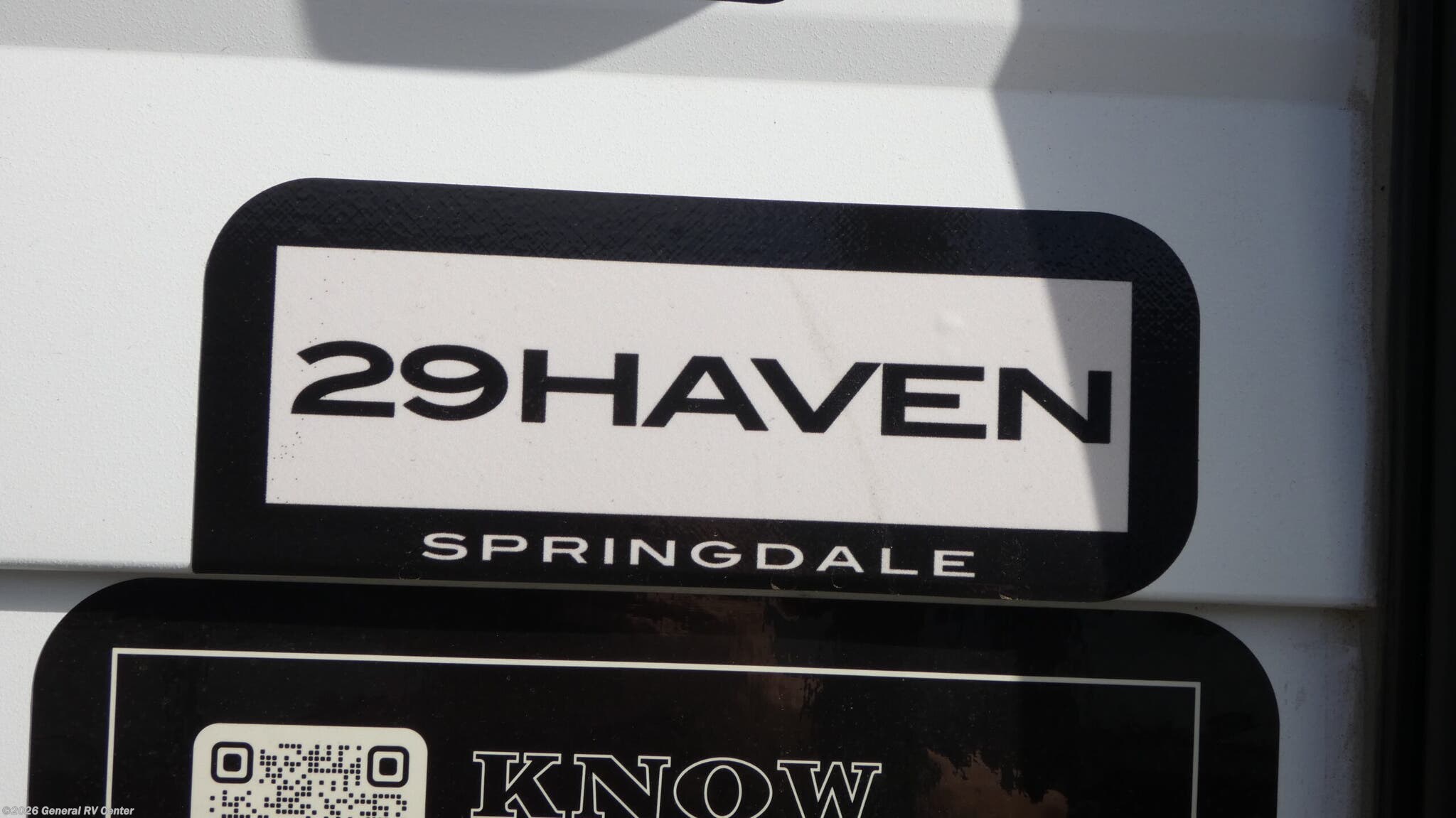 Keystone Springdale MAX travel trailer 29HAVEN highlights: Theater Seat Dinette Slide Appliance Garage Fireplace This travel trailer is designed for campers who want extra comfort without giving up easy towing and it offers a smart, functional layout for everyday living on the road. Along with a complete bath with a 30" x 36" shower and linen storage, you get inviting seating, a well-equipped kitchen, and plenty of storage so you can settle in and feel at home on every trip. This floorplan stands out with its 65" TV perfectly positioned for movie nights, plus dedicated wardrobe and shoe storage to keep clutter under control. At the end of the day, you can stretch out on the Olympic queen bed, giving you more sleeping space than a standard queen, and the kitchen’s air fryer microwave lets you whip up quick, crispy meals without needing extra appliances. The Springdale MAX travel trailers by Keystone make extended stays easier than ever! Each one is built with an 8' wide construction, along with a flat front metal with tough coat, a fully walkable roof, and XL tinted safety glass windows. The I-beam frame with stamped steel cross-members and outriggers provides added durability, and you'll also appreciate the Tru-Fit slide construction that minimizes functional motor stress and resists leaking. A power tongue jack and power stabilizer jacks are included outside, along with SolidStep entry steps, a power awning with LED lights, and a helpful exterior convenience center. Inside, you'll find generous storage spaces, blackout night shades, USB A and C connections throughout, a hi-rise kitchen faucet, and an upgraded Oxygenics Fury showerhead to name a few comforts!