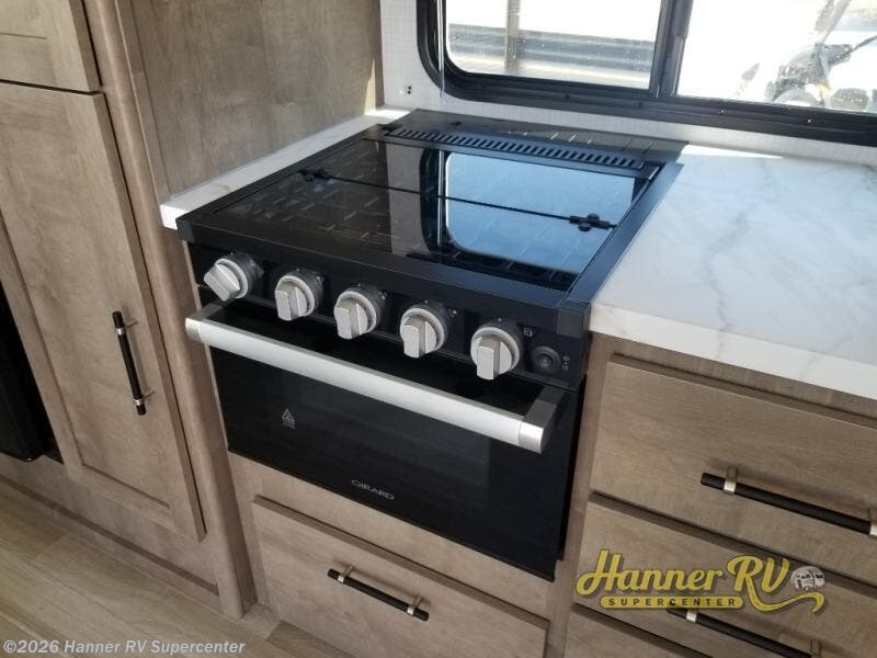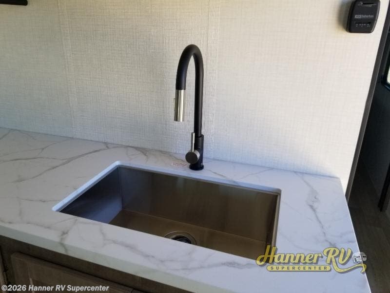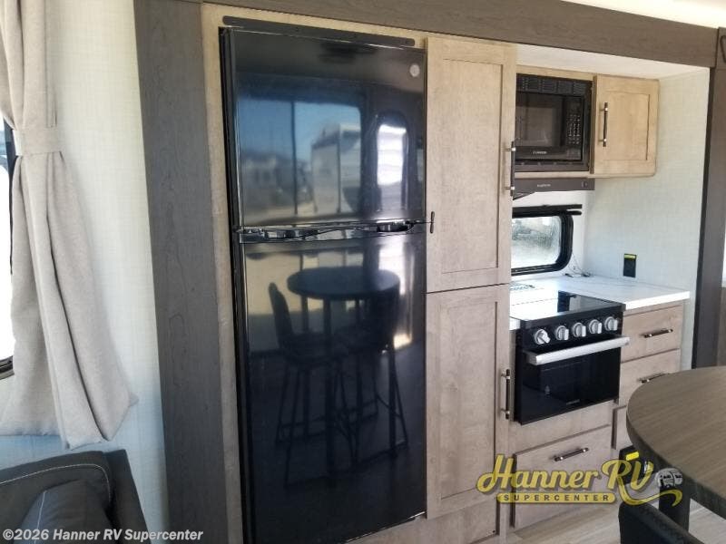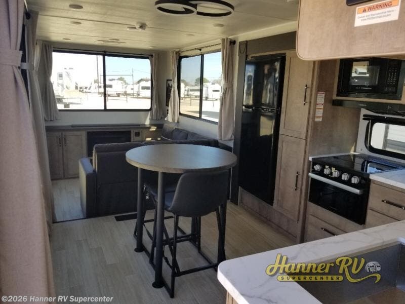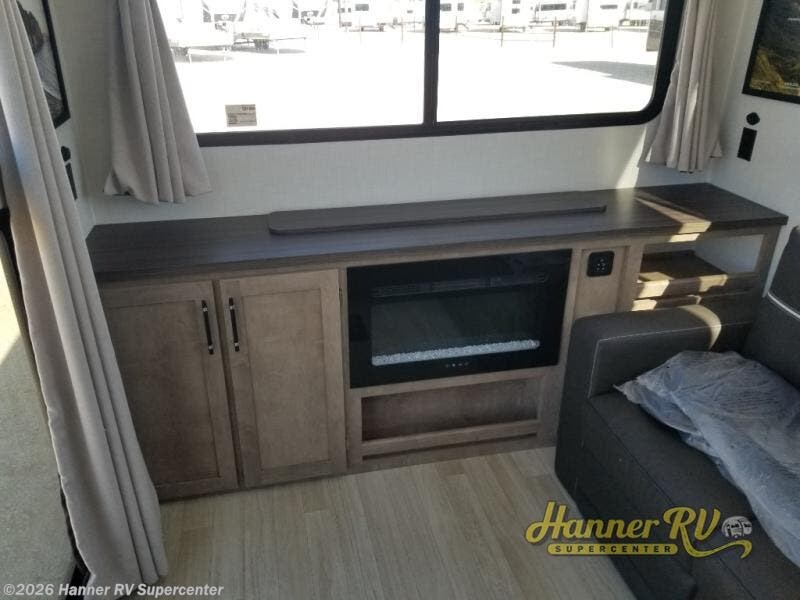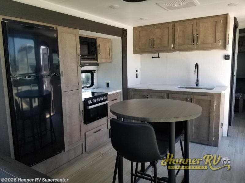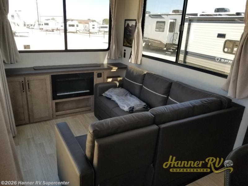 This travel trailer is designed for campers who want residential-style comfort without giving up easy towing, offering a smart and functional layout for everyday living on the road. A sunken living room creates a cozy, separate lounge space, complete with a fireplace and a large sectional sofa that’s perfect for stretching out or hosting friends. In the kitchen area, a bistro table gives you a stylish spot for coffee, meals, or laptops without eating up floor space. At the end of the day, you can retreat to the front bedroom where an Olympic RV queen bed and dual wardrobes provide extra sleeping room and plenty of storage so you can stay organized on every trip.