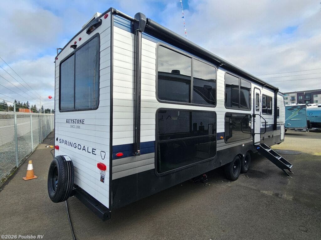 The 2026 Keystone Springdale Max 31SUNROOM offers an exceptional travel experience for families and adventure seekers alike. This new RV spans over 35 feet in length, providing a spacious living area perfect for creating lasting memories on the road. Designed with comfort and convenience in mind, it features one slide out that amplifies the interior space, making it easier to relax and entertain. The absence of bunk beds highlights a flexible layout that can adapt to various sleeping arrangements, ensuring everyone has a comfortable place to rest. With a sturdy GVWR of 9500 pounds and a dry weight of 7550 pounds, this Keystone model balances robust build quality with manageable towing. The inclusion of leveling jacks enhances setup ease, allowing for quick and stable placement at any campsite. Keystone equipped this model with thoughtful amenities to boost convenience and enjoyment during your outdoor adventures. The living area stands out as a welcoming hub, ideal for gathering after a day exploring nature. This floor plan maximizes usability without sacrificing style or function, making the Springdale Max 31SUNROOM a reliable choice for those seeking both performance and livability. As a new RV, it embodies modern craftsmanship and design, ensuring a dependable and enjoyable journey from the start. As a family-owned, award-winning local RV dealer with multiple locations in Sumner, Everett, Kent, and Mt Vernon Washington, Poulsbo RV here to help you find the perfect RV. Stock#: K6262, VIN: 4YDTSGR26T7102187.