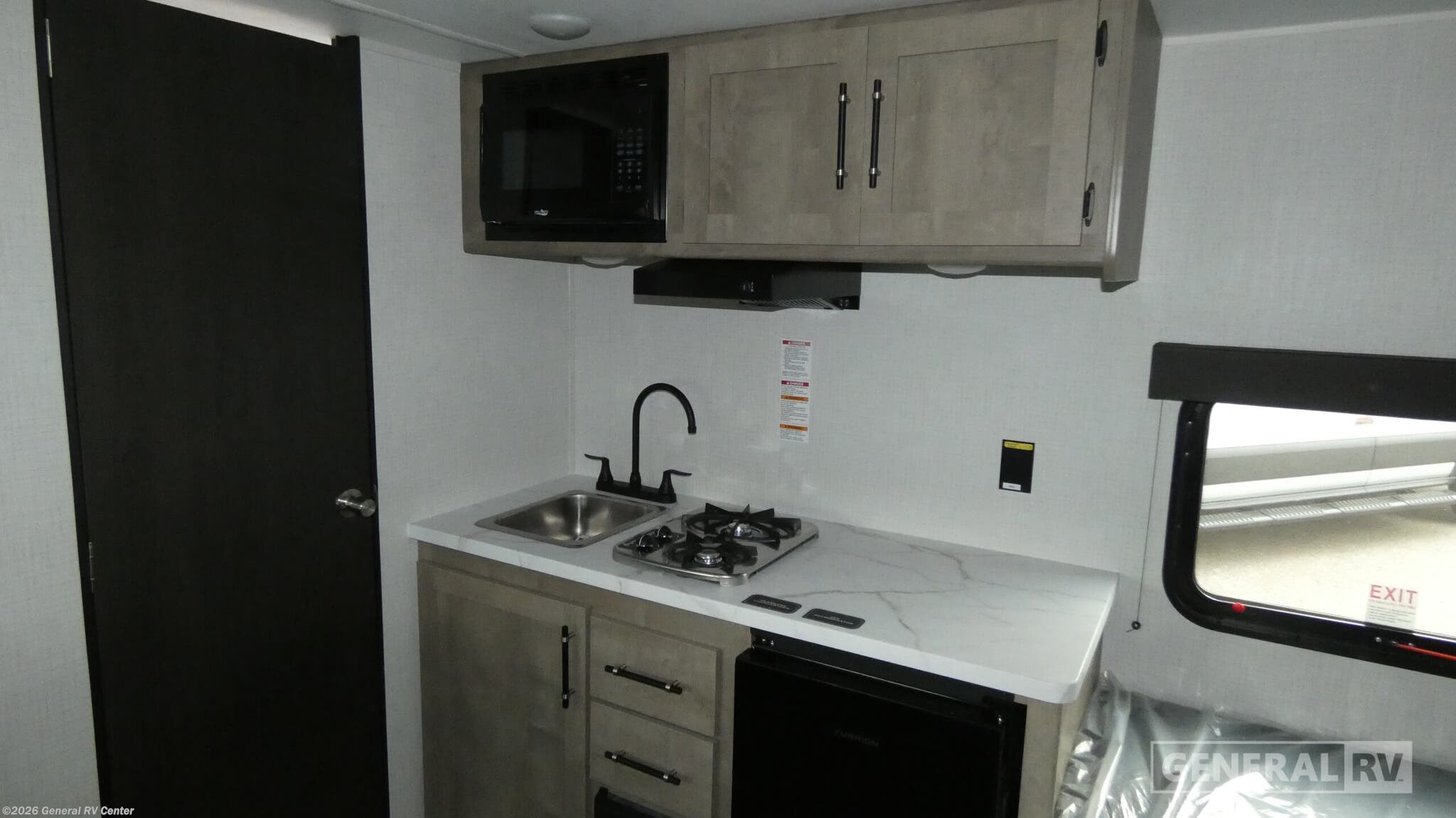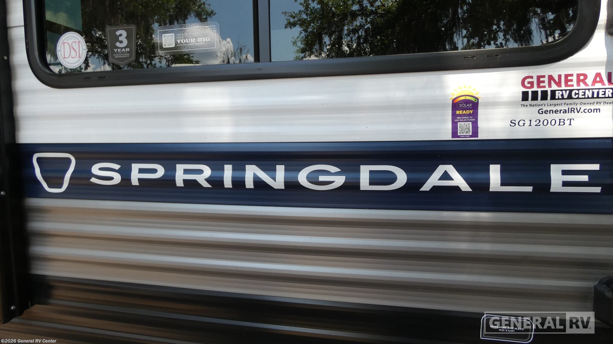Keystone Springdale Mini travel trailer 1200BT highlights: Bar Table Full-Size Bed 8' Power Awning 3.3 Cu. Ft. Refrigerator Your small crew will love camping in this lightweight travel trailer. There is a full-size bed up front with an overhead shelf to keep belongings out of the way. The two-burner cooktop and microwave oven will let you make breakfast in the morning, and the bar table with two stools provides a place to dine together. And a private bath with a shower and toilet lets you easily clean up after a day outdoors! With any Springdale Mini travel trailer by Keystone, you will enjoy lightweight towing thanks to their single axle! The XL tinted safety glass windows are ultra durable, and the power awning will provide protection from the sun as you relax in your camp chairs outside. Each model includes blackout night shades, LED lighting, plus many more interior comforts. There is also a 20K BTU furnace to keep you comfortable, plus a tankless water heater for endless hot showers!