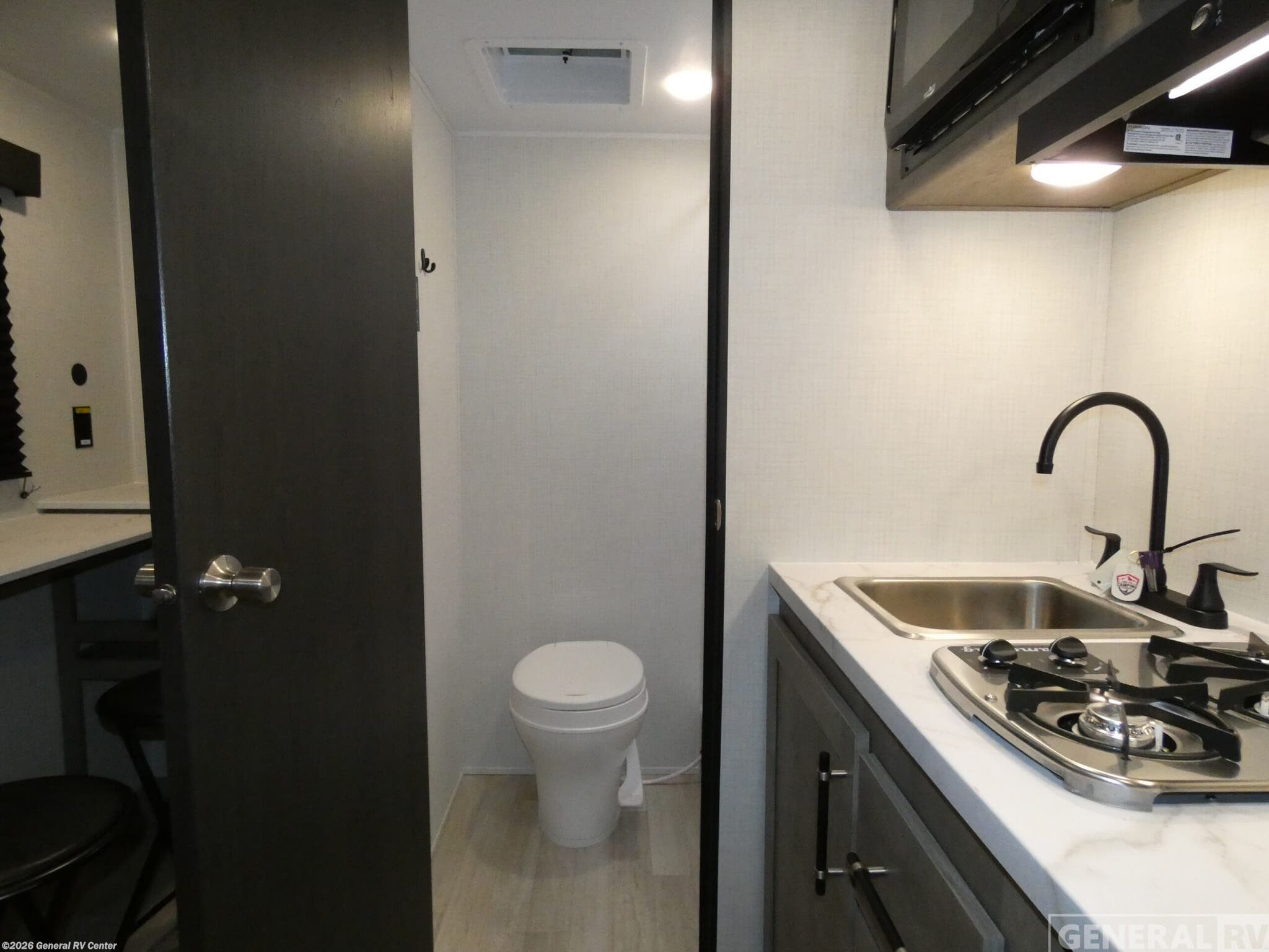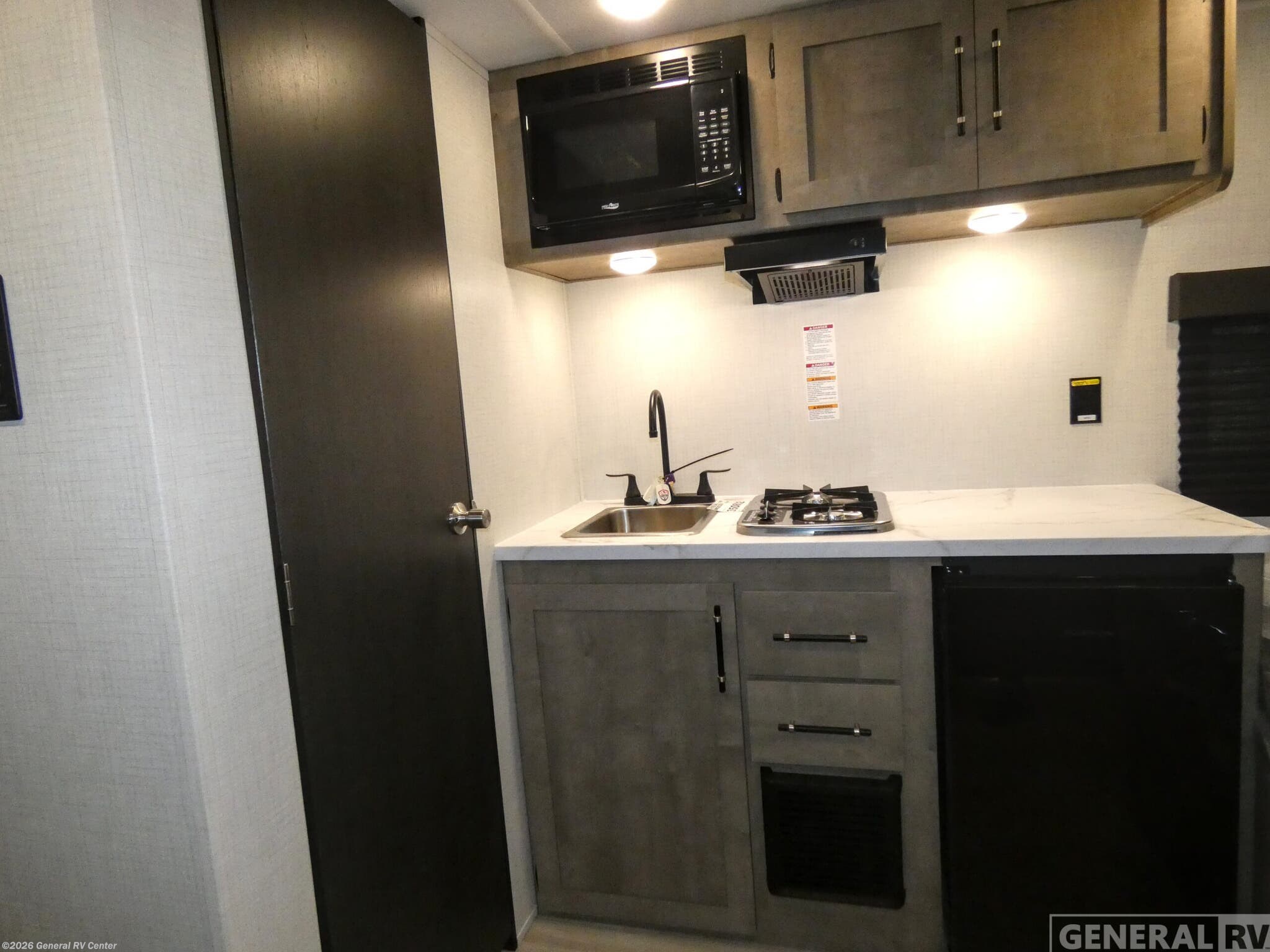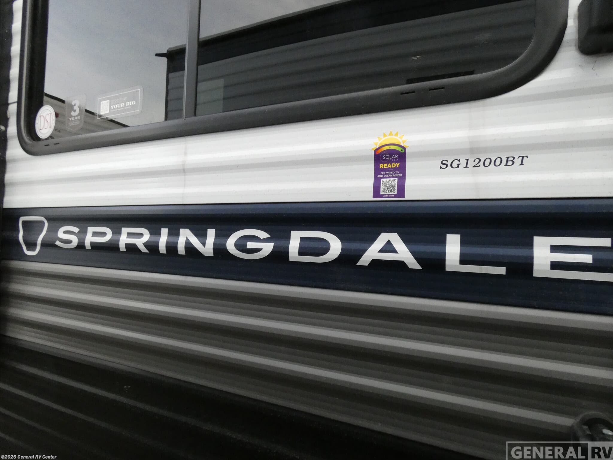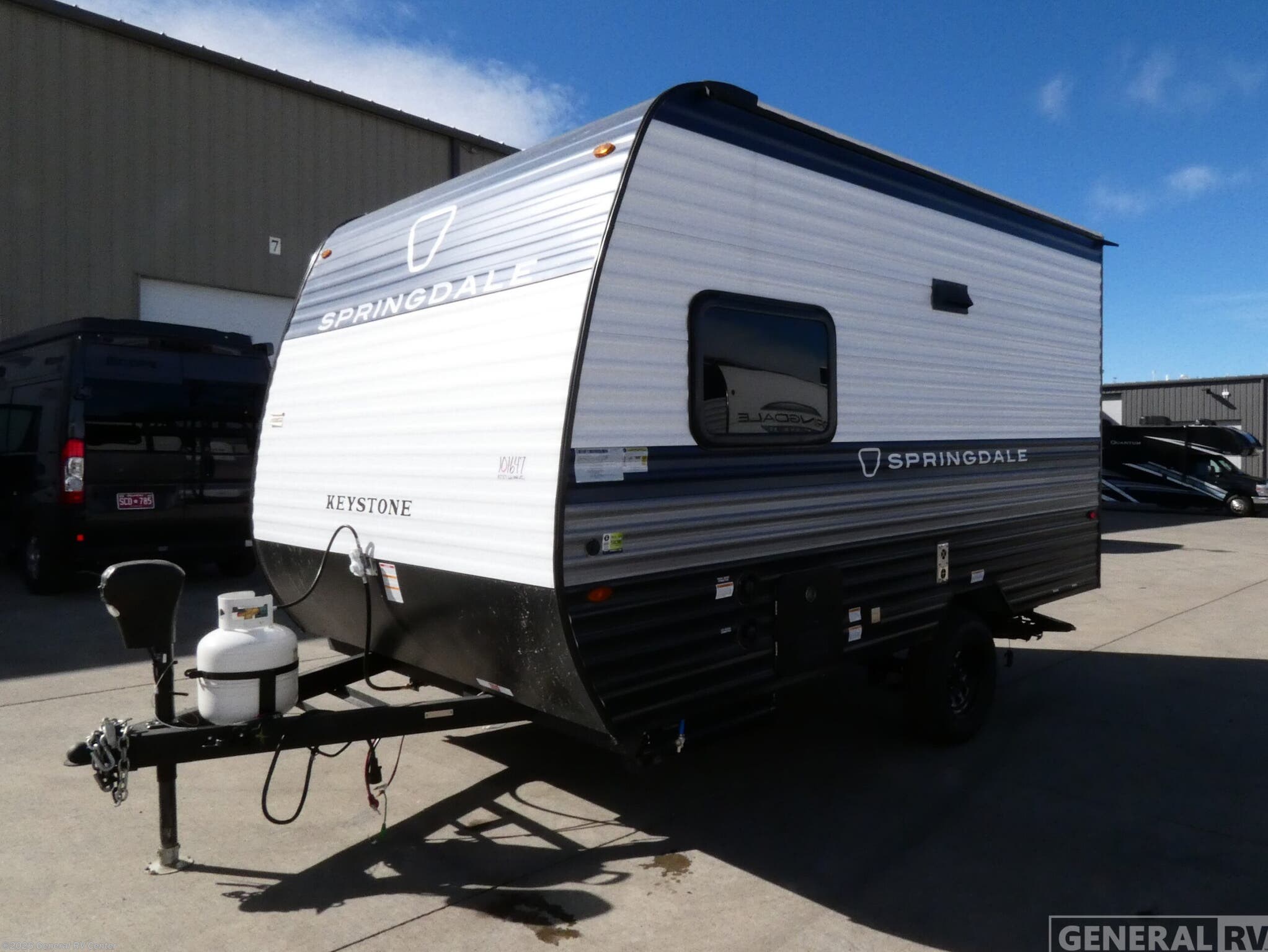 Keystone Springdale Mini travel trailer 1200BT highlights: Bar Table Full-Size Bed 8' Power Awning 3.3 Cu. Ft. Refrigerator Your small crew will love camping in this lightweight travel trailer. There is a full-size bed up front with an overhead shelf to keep belongings out of the way. The two-burner cooktop and microwave oven will let you make breakfast in the morning, and the bar table with two stools provides a place to dine together. And a private bath with a shower and toilet lets you easily clean up after a day outdoors! With any Springdale Mini travel trailer by Keystone, you will enjoy lightweight towing thanks to their single axle! The XL tinted safety glass windows are ultra durable, and the power awning will provide protection from the sun as you relax in your camp chairs outside. Each model includes blackout night shades, LED lighting, plus many more interior comforts. There is also a 20K BTU furnace to keep you comfortable, plus a tankless water heater for endless hot showers!