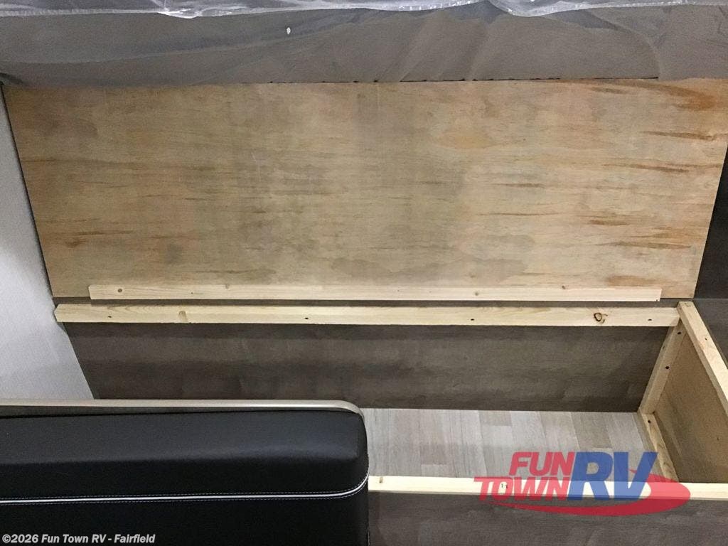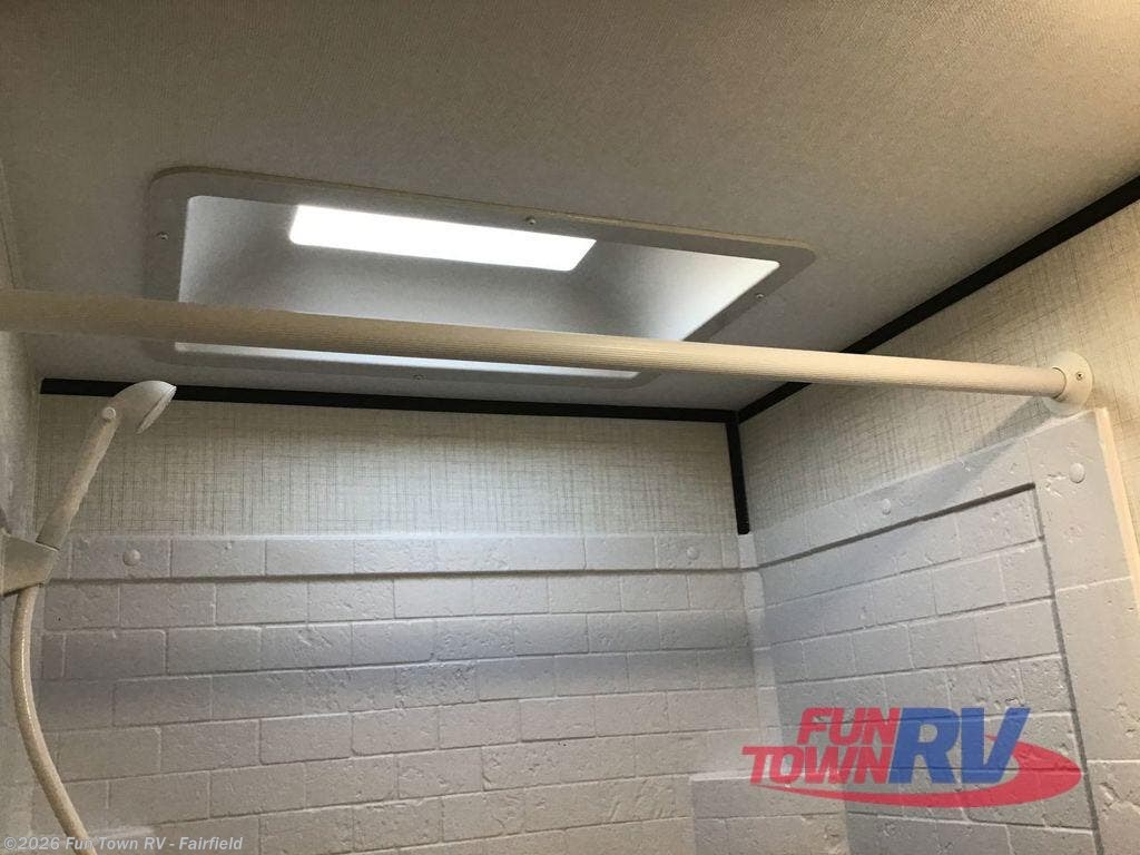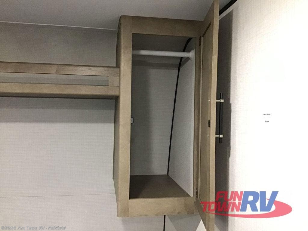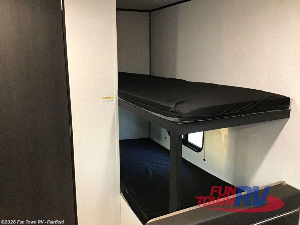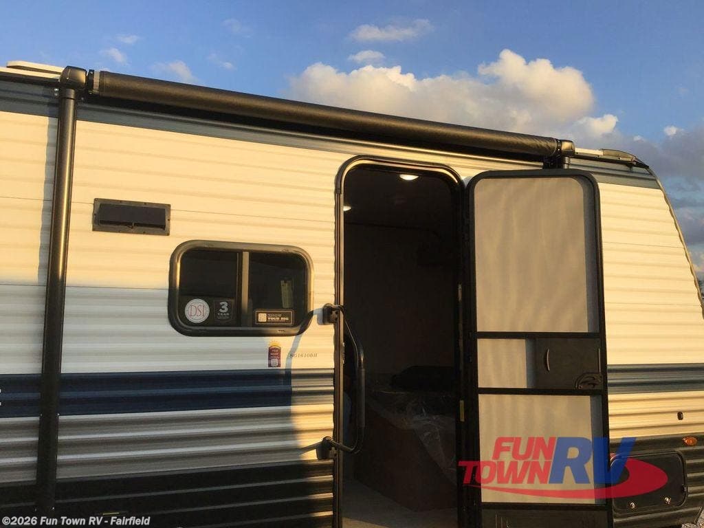 This travel trailer with rear corner bunk beds is sure to be a hit at the campground! While your guests or little ones take the bunks, you can enjoy the front Olympic RV queen bed to yourselves. There is even storage under the bed, an overhead shelf, and a wardrobe for your things. The chef of your group can whip up meals on the two-burner cooktop or in the microwave oven, and there is a 3.3 cu. ft. 12V refrigerator to keep food fresh. A booth dinette provides a place to dine together, or you can take your plate outdoors to sit under the 8' power awning with LED lights!