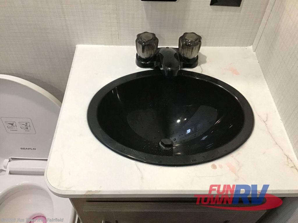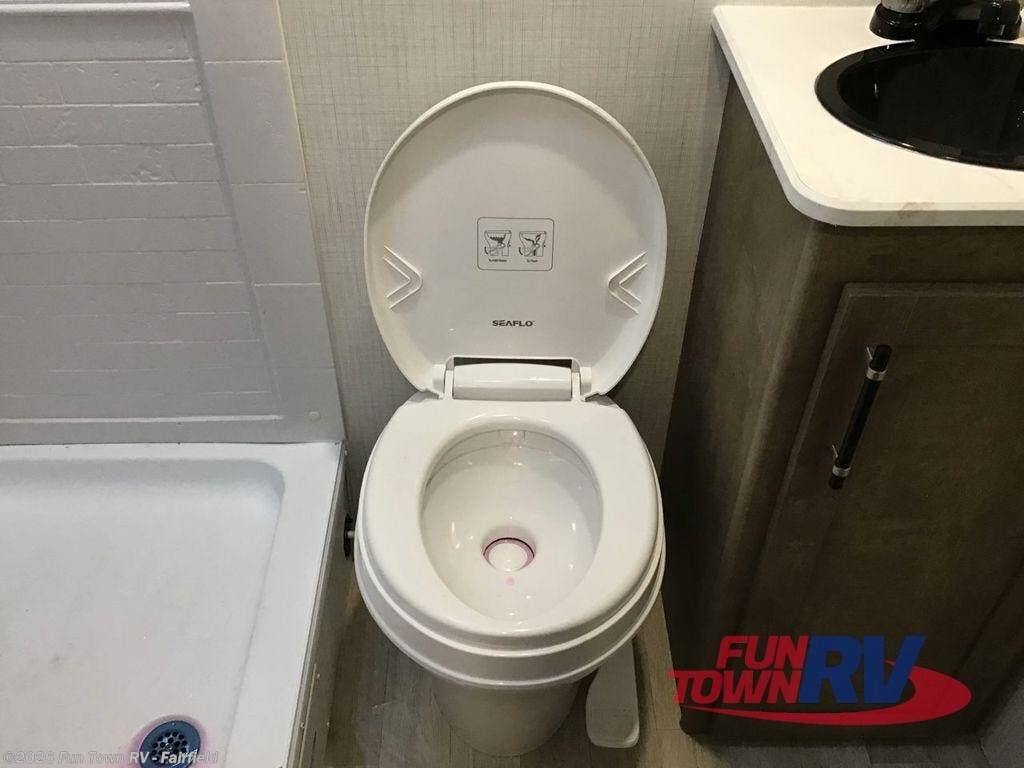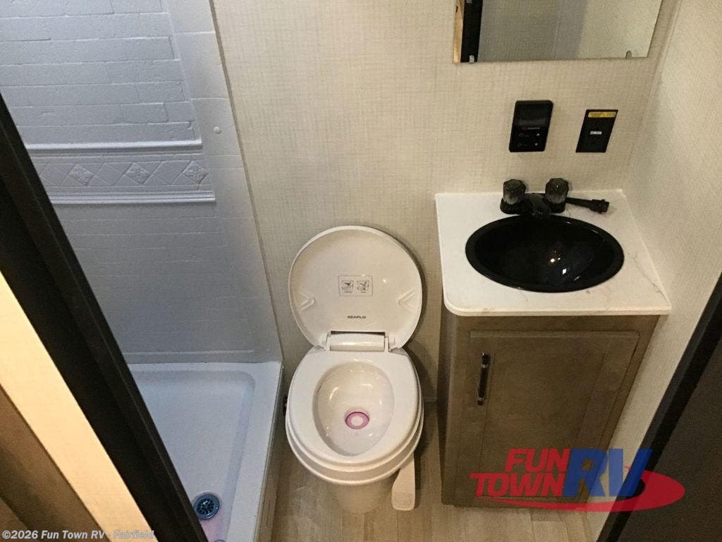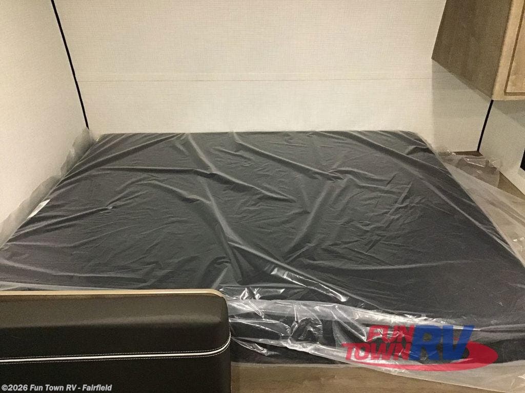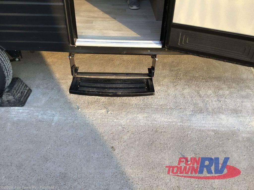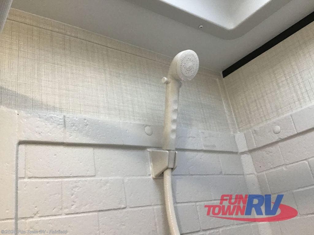 This travel trailer with rear corner bunk beds is sure to be a hit at the campground! While your guests or little ones take the bunks, you can enjoy the front Olympic RV queen bed to yourselves. There is even storage under the bed, an overhead shelf, and a wardrobe for your things. The chef of your group can whip up meals on the two-burner cooktop or in the microwave oven, and there is a 3.3 cu. ft. 12V refrigerator to keep food fresh. A booth dinette provides a place to dine together, or you can take your plate outdoors to sit under the 8' power awning with LED lights!