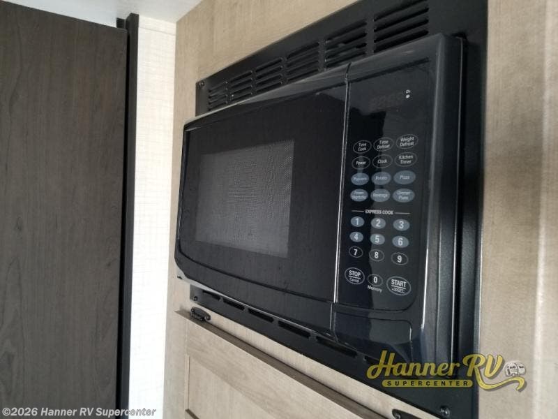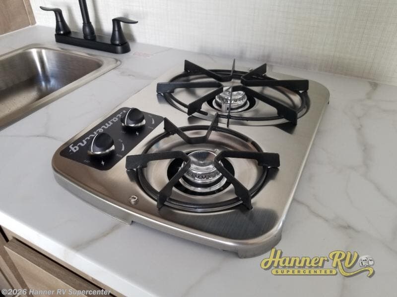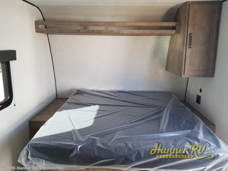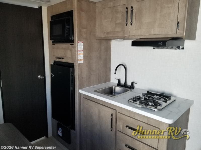 Camping trips just got easier travel trailer that can sleep three to four each night! There is a front Olympic RV queen bed with an overhead shelf and bedside wardrobe for your things. A two-burner cooktop and microwave oven will let you make breakfast for your crew, and a booth dinette provides a place to dine together, as well as convert to sleeping space for a guest or two little ones. This travel trailer also includes a full rear bath, complete with a shower, toilet, and vanity with a sink and overhead cabinet!