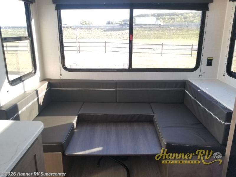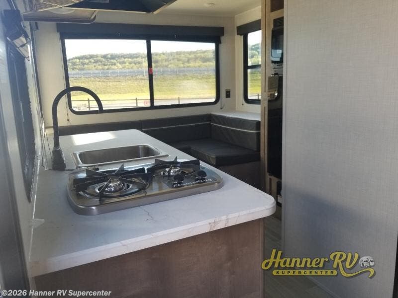 You will find lots of storage inside and outside this trailer allowing you to bring along everything you need for a great camping trip! Along the exterior there is a pass-thru compartment for your outdoor gear and a 10' power awning giving you a covered outdoor living area to enjoy. The cook will have a two burner gas range to make meals, and everyone can dine around the U-shaped dinette. There is a full bathroom to get cleaned up in before bedtime, and a queen bed to fall asleep quickly so you can have fun again tomorrow.