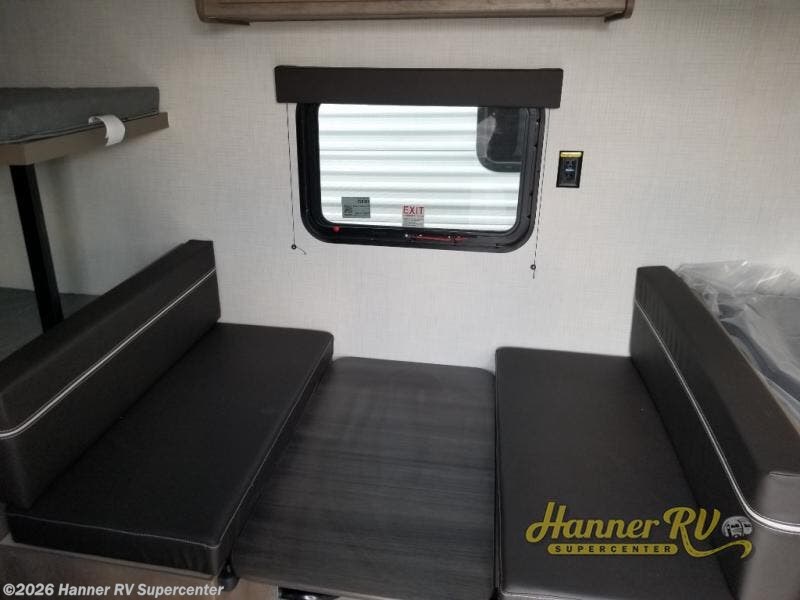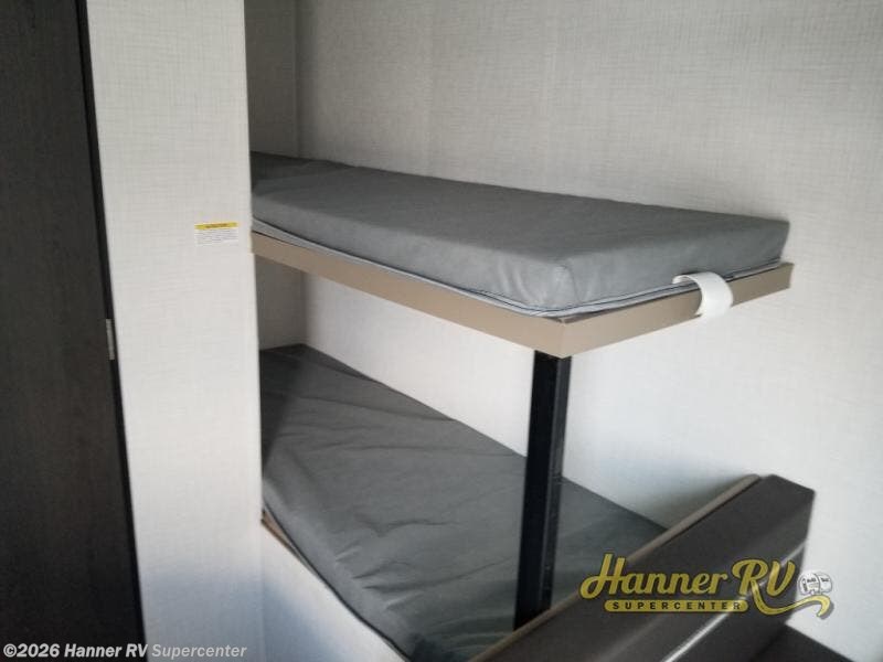 Get ready for outdoor fun with your favorite people when you have this trailer in tow! Once at your campsite, you can easily setup the 10' power awning, grab your camping chairs from the pass-thru storage, and relax or start playing. The cook will love the galley kitchen with the two burner cooktop, plus a refrigerator for cold items. If you like, you can eat inside at the booth dinette which doubles as sleeping space, and of course the kids will love the bunk beds next to the full bathroom. And you will sleep soundly on the front queen bed.