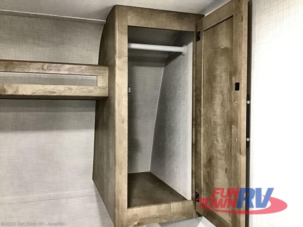 Camping trips just got easier travel trailer that can sleep three to four each night! You'll enjoy more floor space to move about thanks to the sofa slide out, and the full bath is tucked in the back for added privacy. There is generous counter space in the kitchen, along with a two-burner cooktop and microwave oven to cook meals. Up front, you'll find a picnic table to dine at, plus a Murphy style pull-out Olympic RV queen-size bed, giving you both seating and sleeping space. Dual bedside wardrobes will let you keep your clothes organized, and an exterior pass-through storage will be perfect for fishing poles, camp chairs and more!