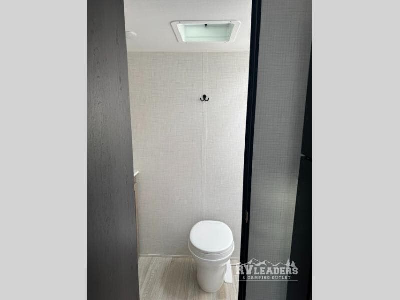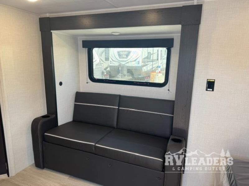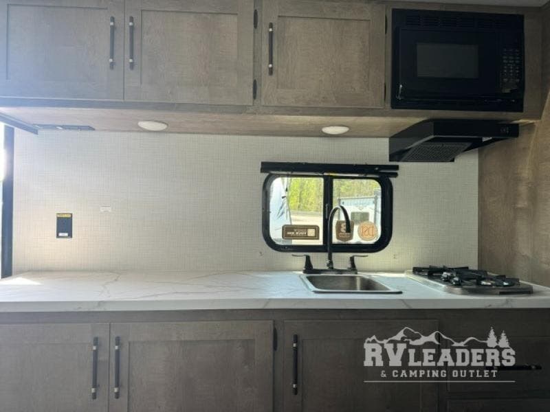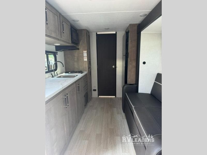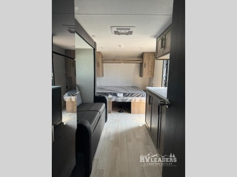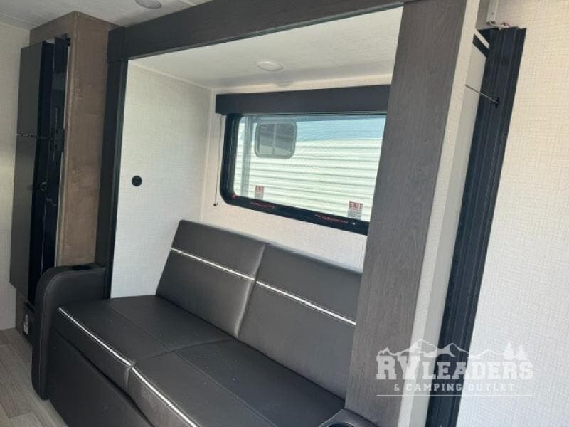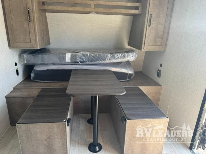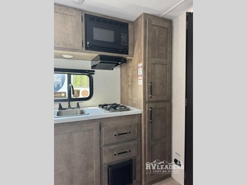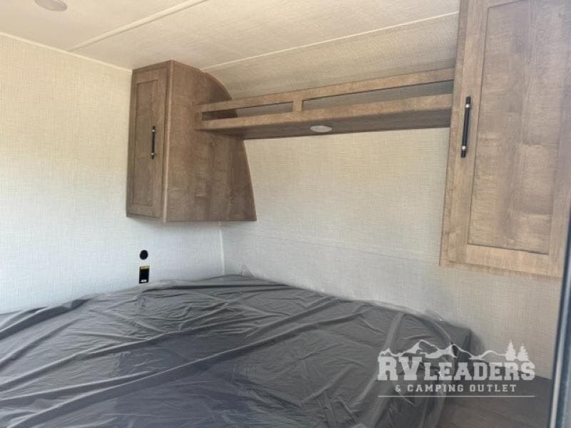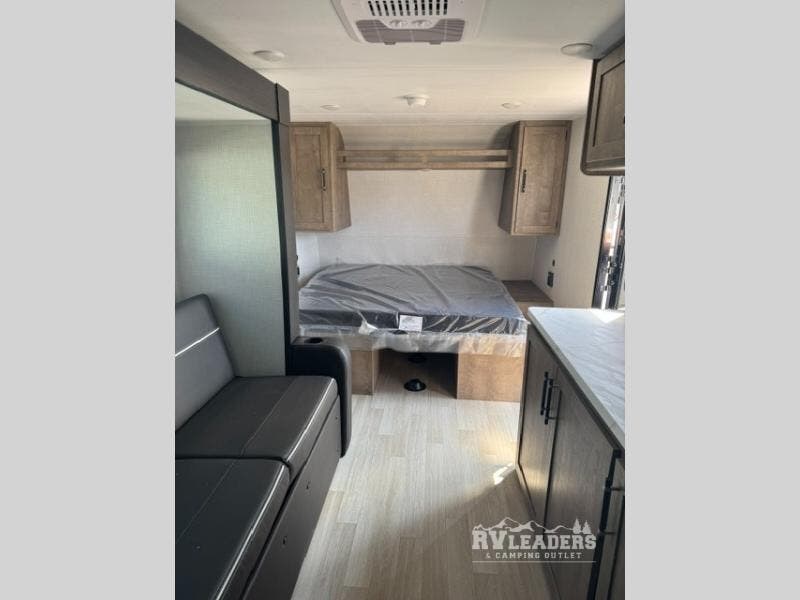 Camping trips just got easier travel trailer that can sleep three to four each night! You'll enjoy more floor space to move about thanks to the sofa slide out, and the full bath is tucked in the back for added privacy. There is generous counter space in the kitchen, along with a two-burner cooktop and microwave oven to cook meals. Up front, you'll find a picnic table to dine at, plus a pull-out Olympic RV queen-size bed, giving you both seating and sleeping space. Dual bedside wardrobes will let you keep your clothes organized, and an exterior pass-through storage will be perfect for fishing poles, camp chairs and more!