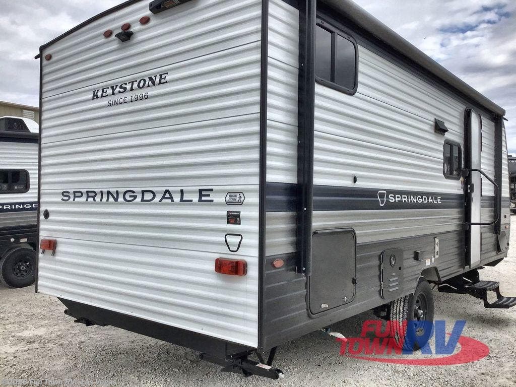 With any Springdale Mini travel trailer by Keystone, you will enjoy lightweight towing thanks to their single axle! The XL tinted safety glass windows are ultra durable, and the power awning will provide protection from the sun as you relax in your camp chairs outside. Each model includes blackout night shades, LED lighting, plus many more interior comforts. There is also a 20K BTU furnace to keep you comfortable, plus a tankless water heater for endless hot showers!
