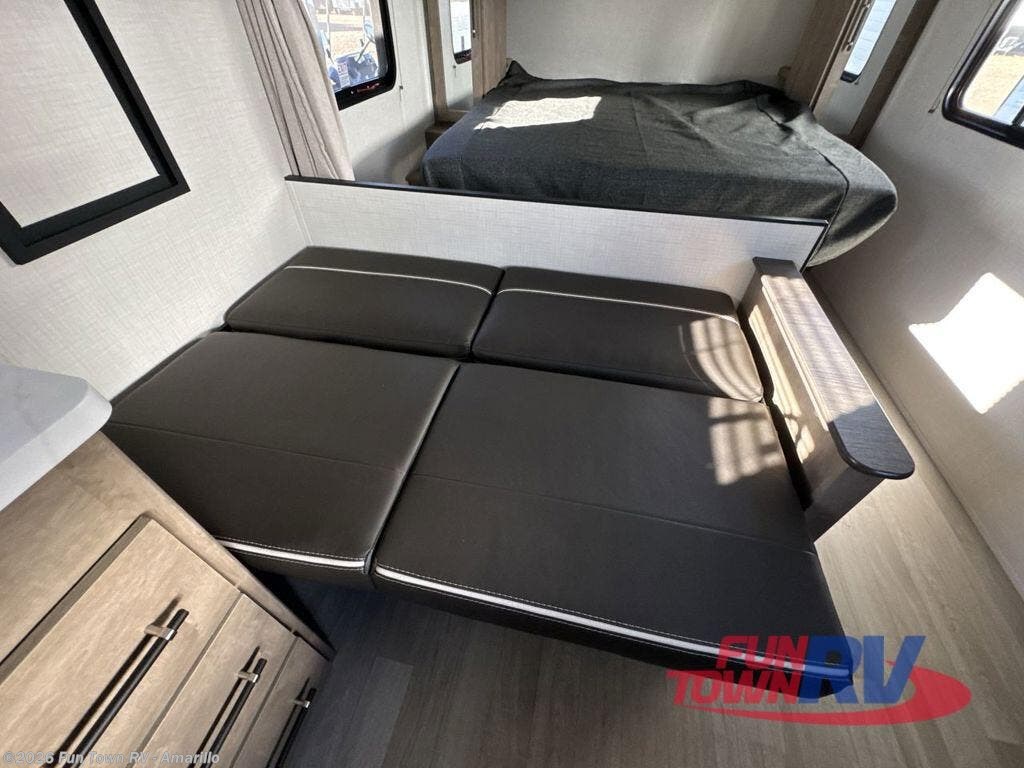 This cute Springdale Mini bunk model will easily sleep seven with the double-size bunks, booth dinette, and queen Murphy bed which features a fold-down sofa at the end. During the daytime, you can have the seating you need and want, and at night the sofa folds to become part of the front bed. The rear corner bath is convenient and features a tub, toilet, and sink. The kitchen is fully equipped to allow you to cook as you travel, and you can enjoy meals while under the 15' power awning.